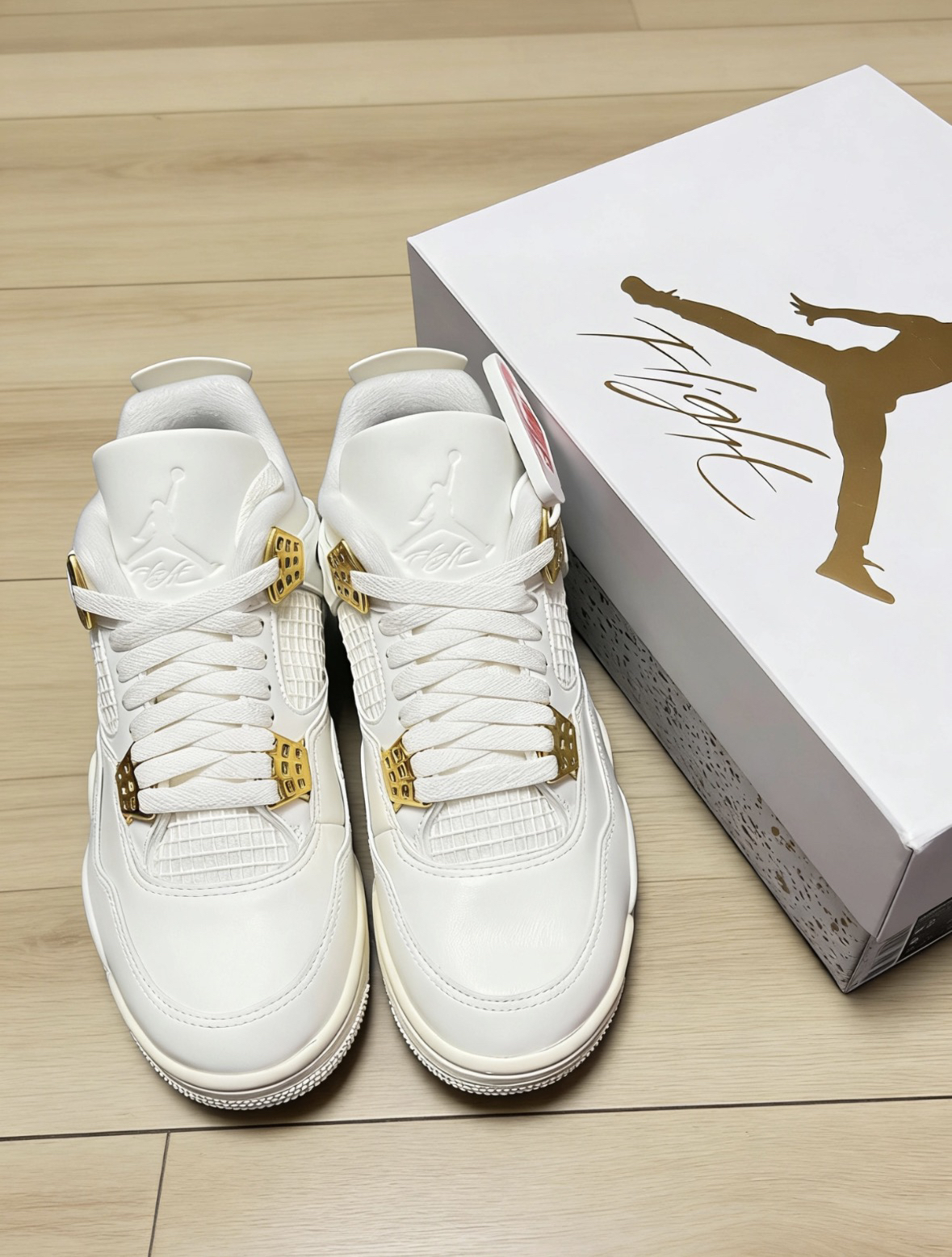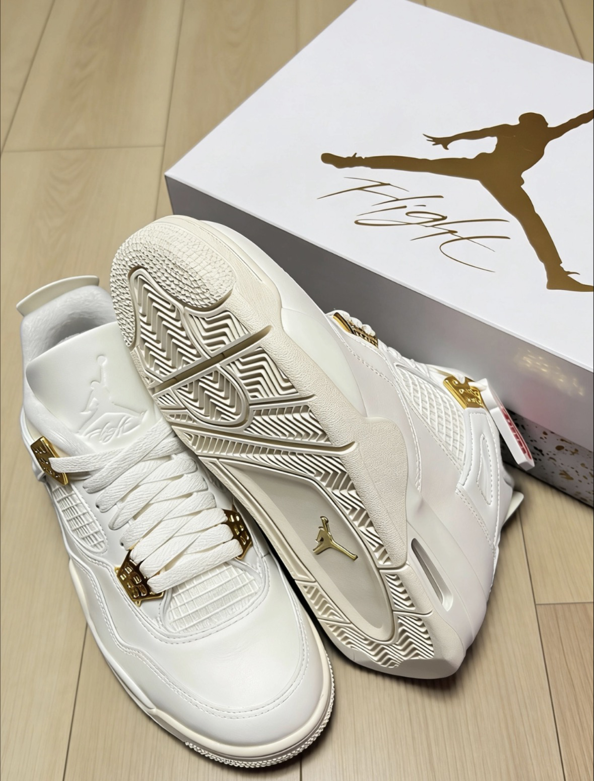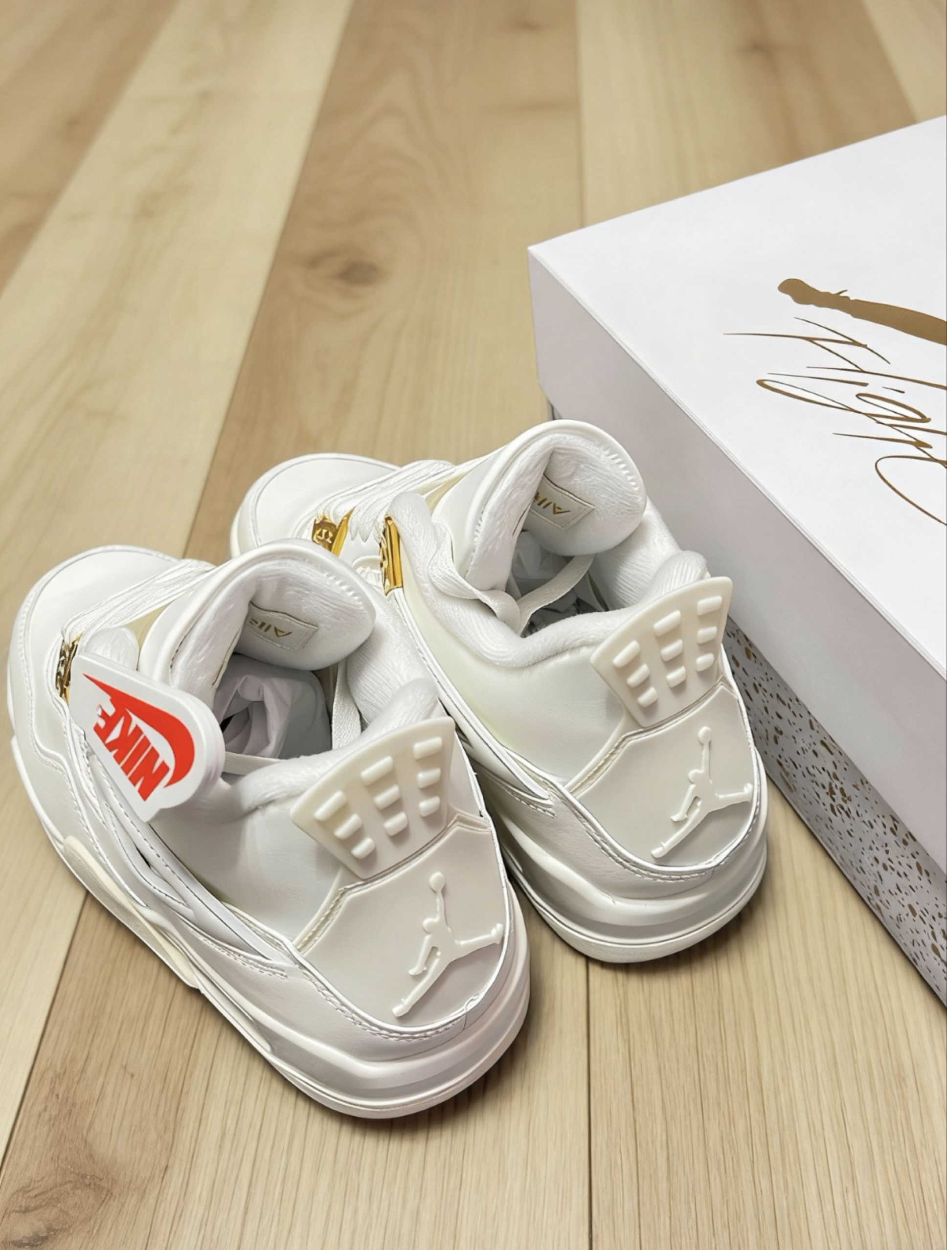 这双AJ4白金真的是近期最爱,全白皮革+金色扣眼,质感直接拉满。鞋舌和后跟的飞人logo是压印的,细节很到位,鞋口加了毛绒,冬天穿也不冻脚。日常搭牛仔裤、运动裤都好看,通勤、逛街、约会都能穿,上脚显脚小,走路也舒服。不管是自己穿还是送对象,都很有面儿,属于那种越看越香的款~