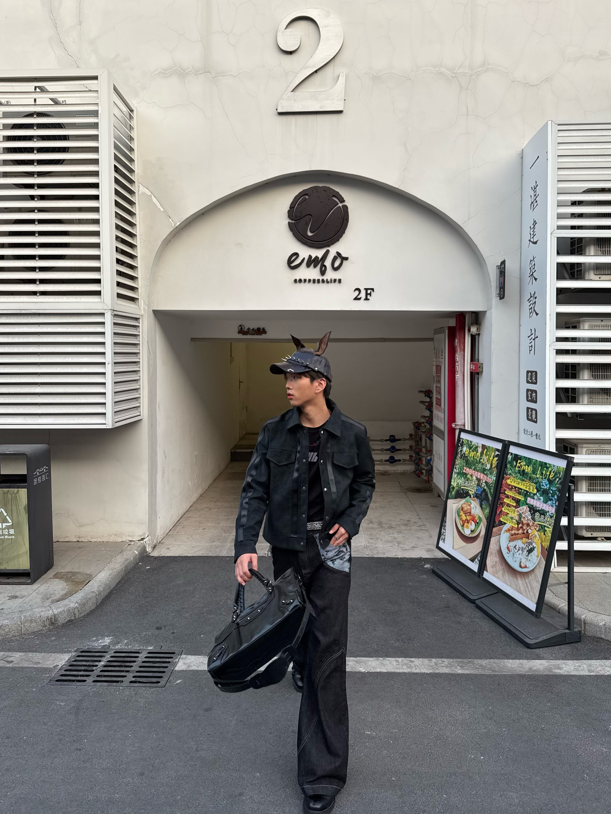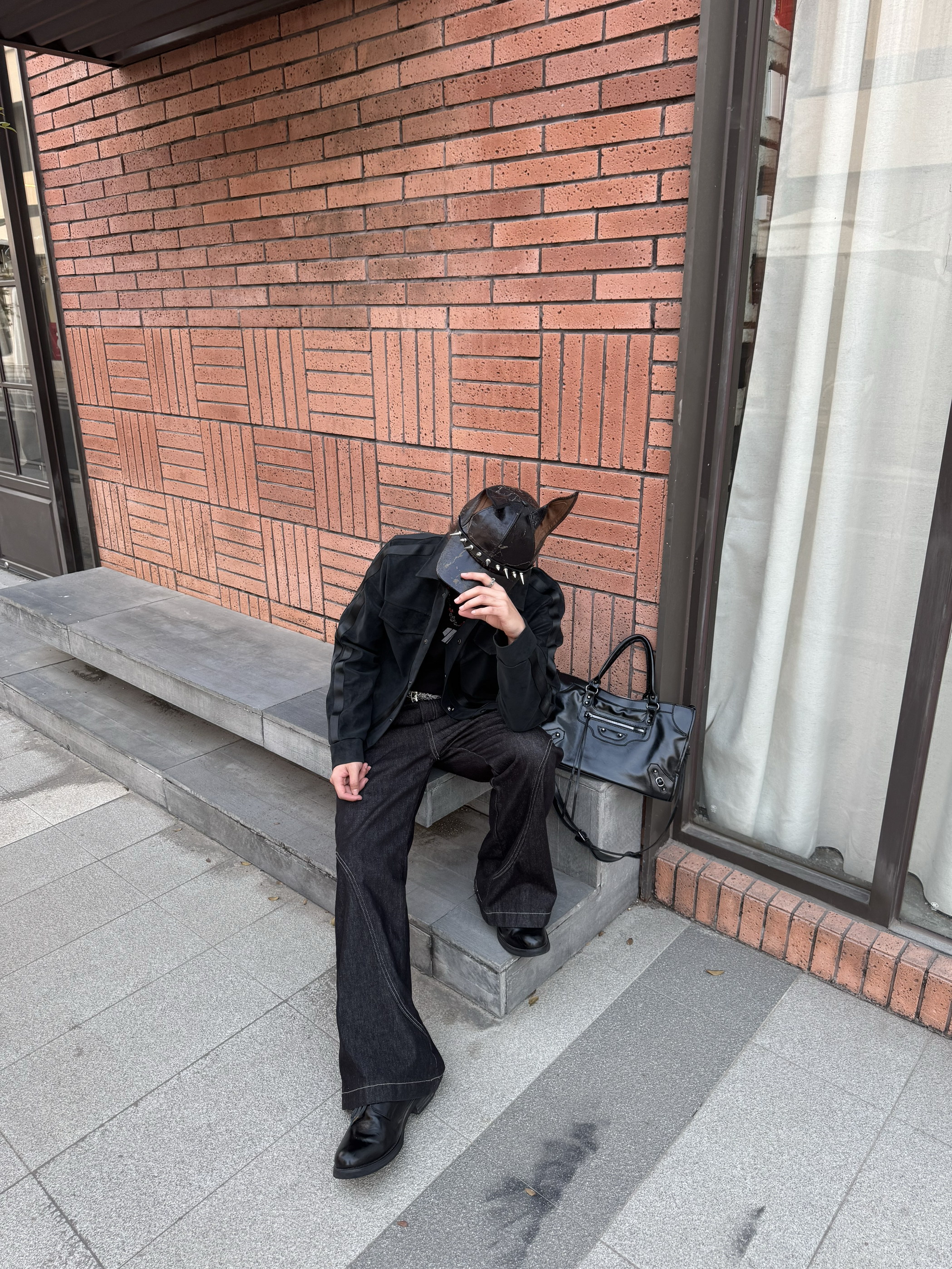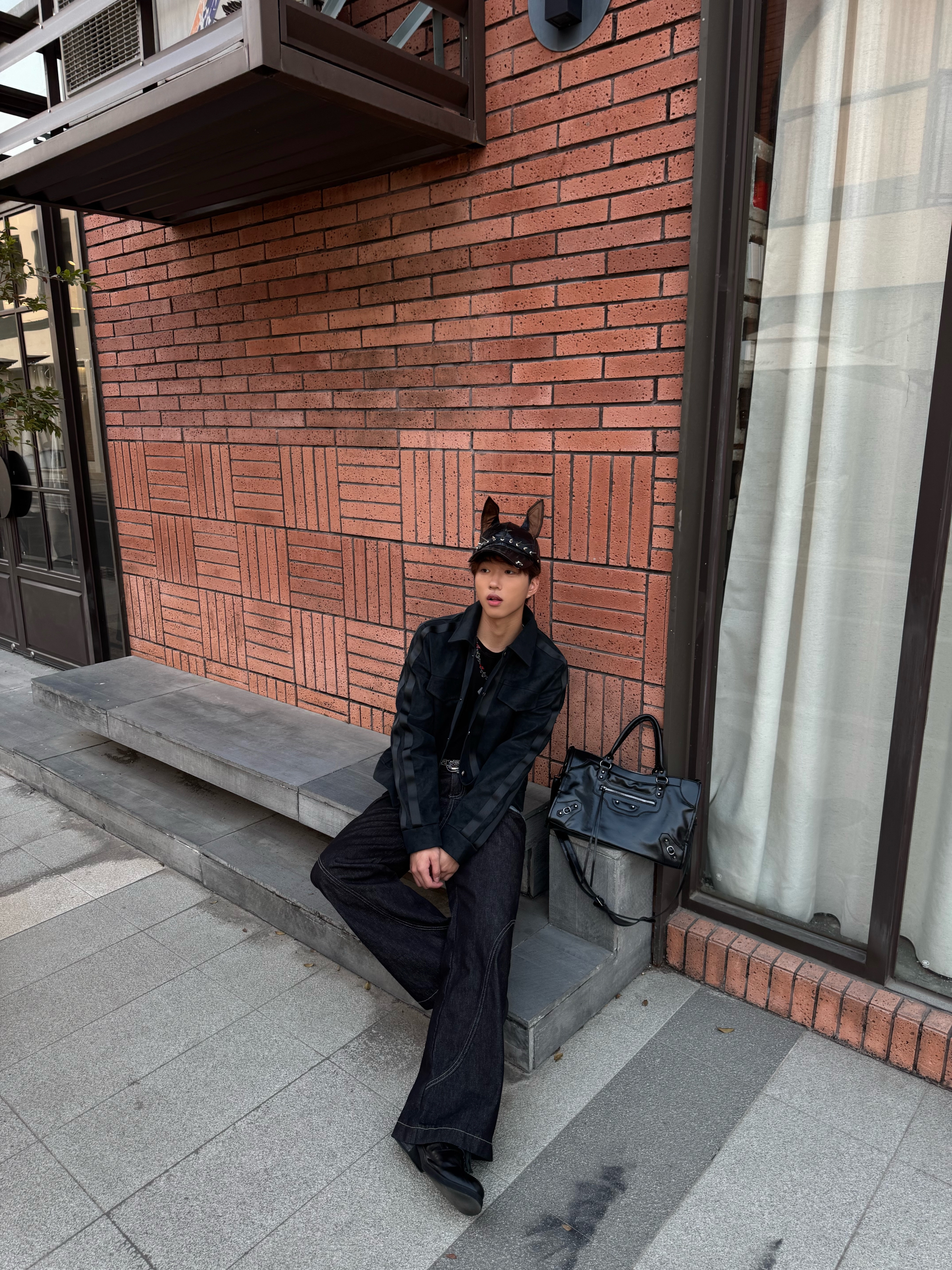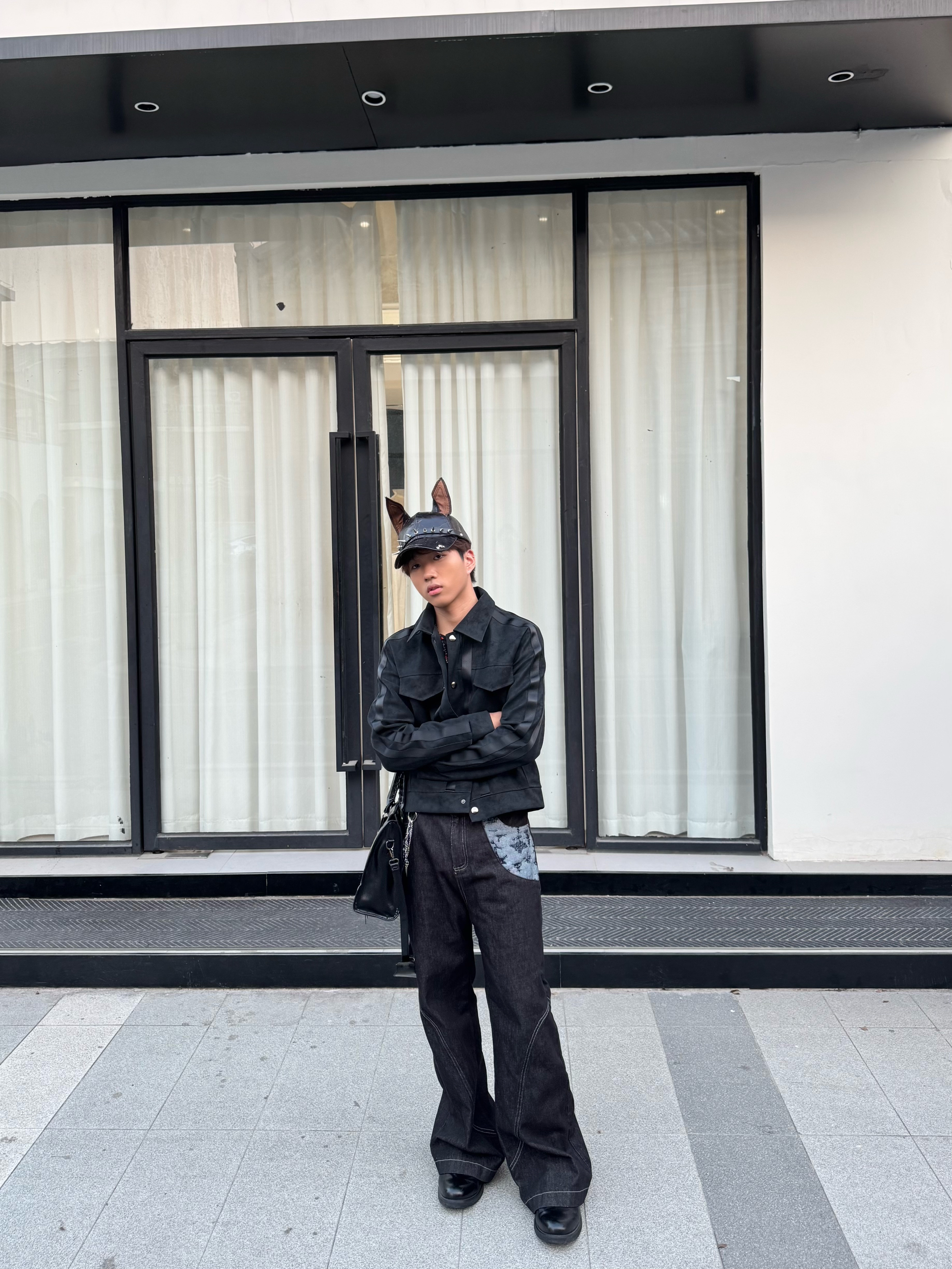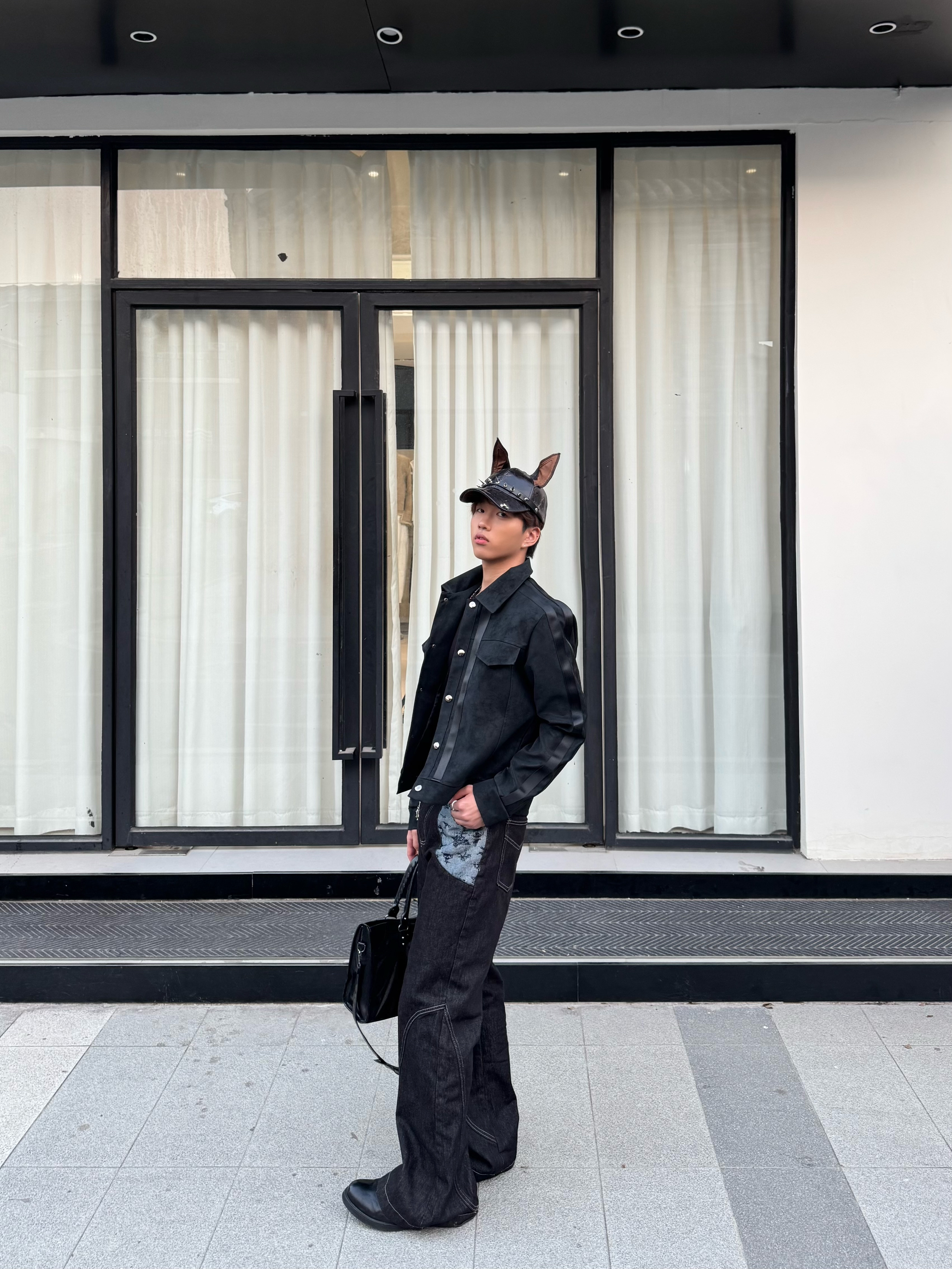 今天走的是全黑酷感路线,麂皮夹克的拼接设计增加了层次,阔腿牛仔裤的做旧贴布和明线细节,让整体不那么沉闷。再配上带兔耳的铆钉帽,把甜酷感拉满,走在街上就是最有态度的“黑兔”玩家。