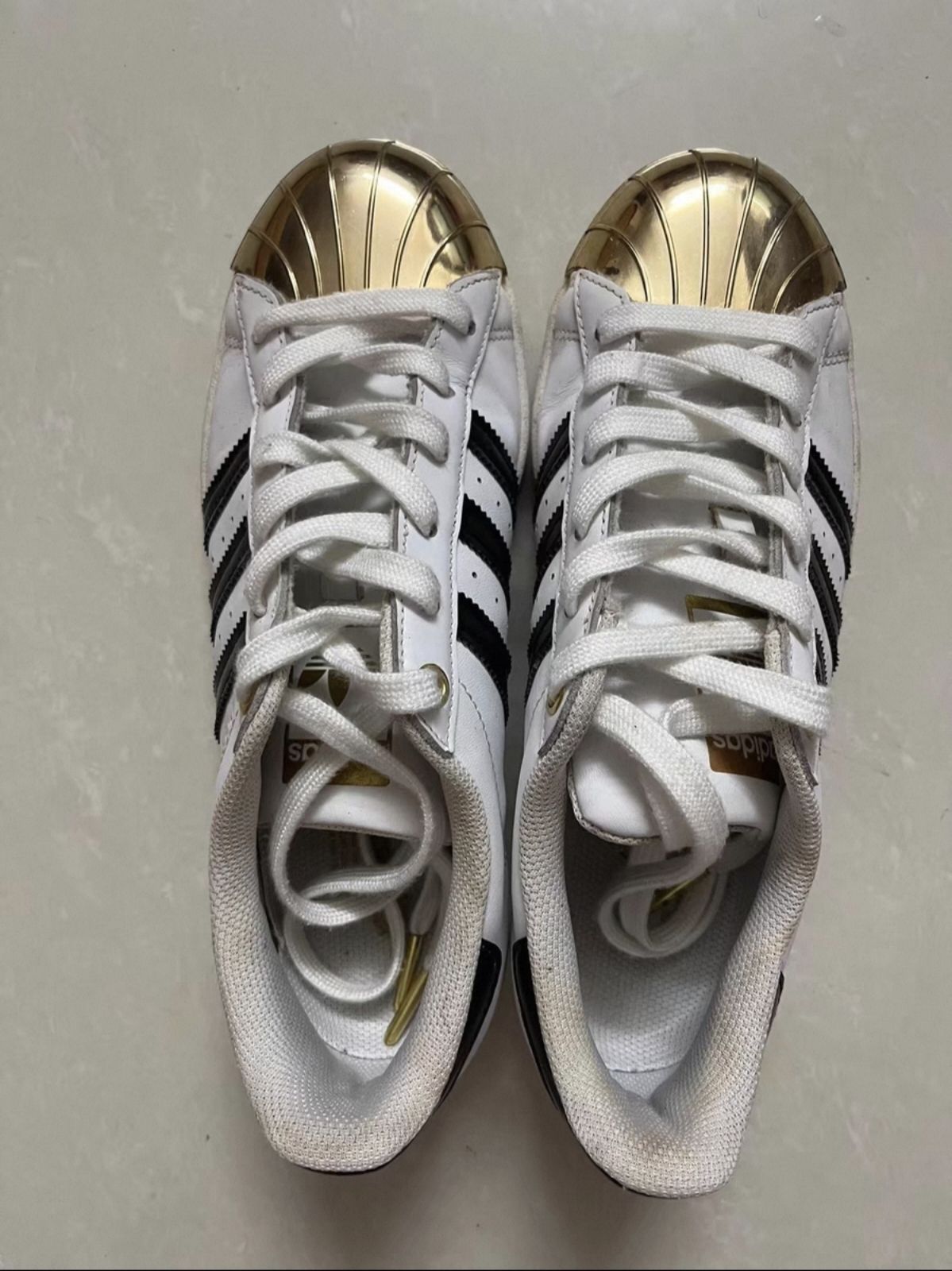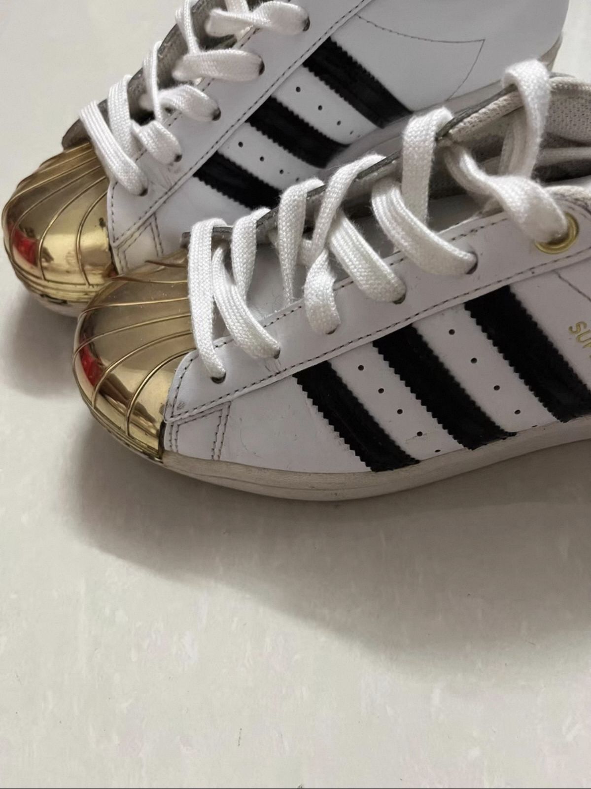 这双adidas Superstar金属贝壳头,在我鞋柜里待了快一年了。刚入手时,鞋头的金色贝壳头亮得晃眼,白皮革也干净得像刚从专柜拿出来,那时候总舍不得穿,怕刮花、怕氧化,连走路都刻意放轻脚步。 现在再看它,鞋头的金属光泽已经磨出了细微的划痕,鞋身的白皮革也有了自然的褶皱,鞋舌的金色标也褪去了几分鲜亮。可就是这些“不完美”,让它成了我鞋柜里最有故事的一双鞋。它陪我走过大学的操场,挤过早高峰的地...