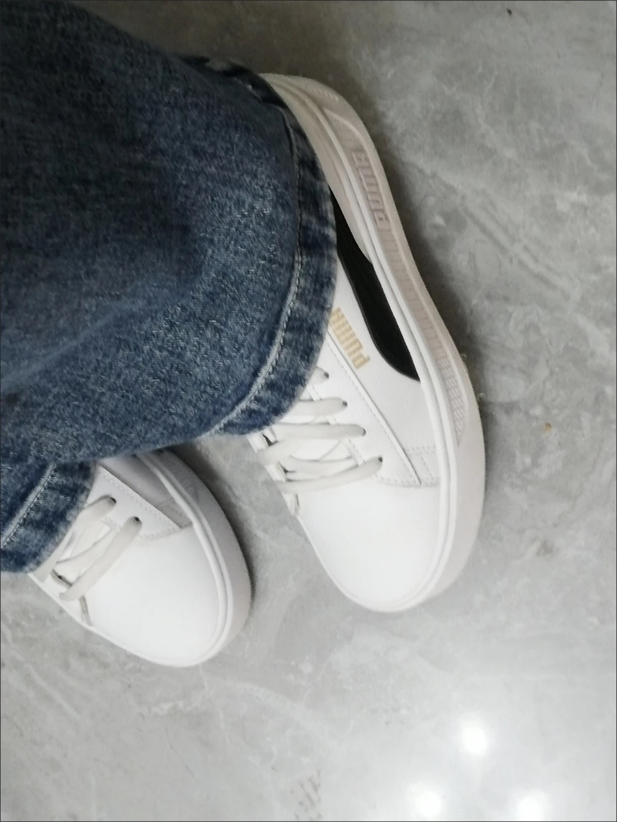这双Puma板鞋主打一个省心,通体白色配黑色Logo,看着就干干净净,平时随便抓条牛仔裤都能搭,显得人很有精神。最惊喜的是里面那圈红色,只有脱鞋或者走路时才隐约露出来,刚好满足了想穿红鞋又怕太张扬的心思。鞋底软硬适中,上下班通勤穿一天脚也不累。记得选码时要买小半码,不然走路容易不跟脚,这性价比日常穿挺合适的。👟👌
