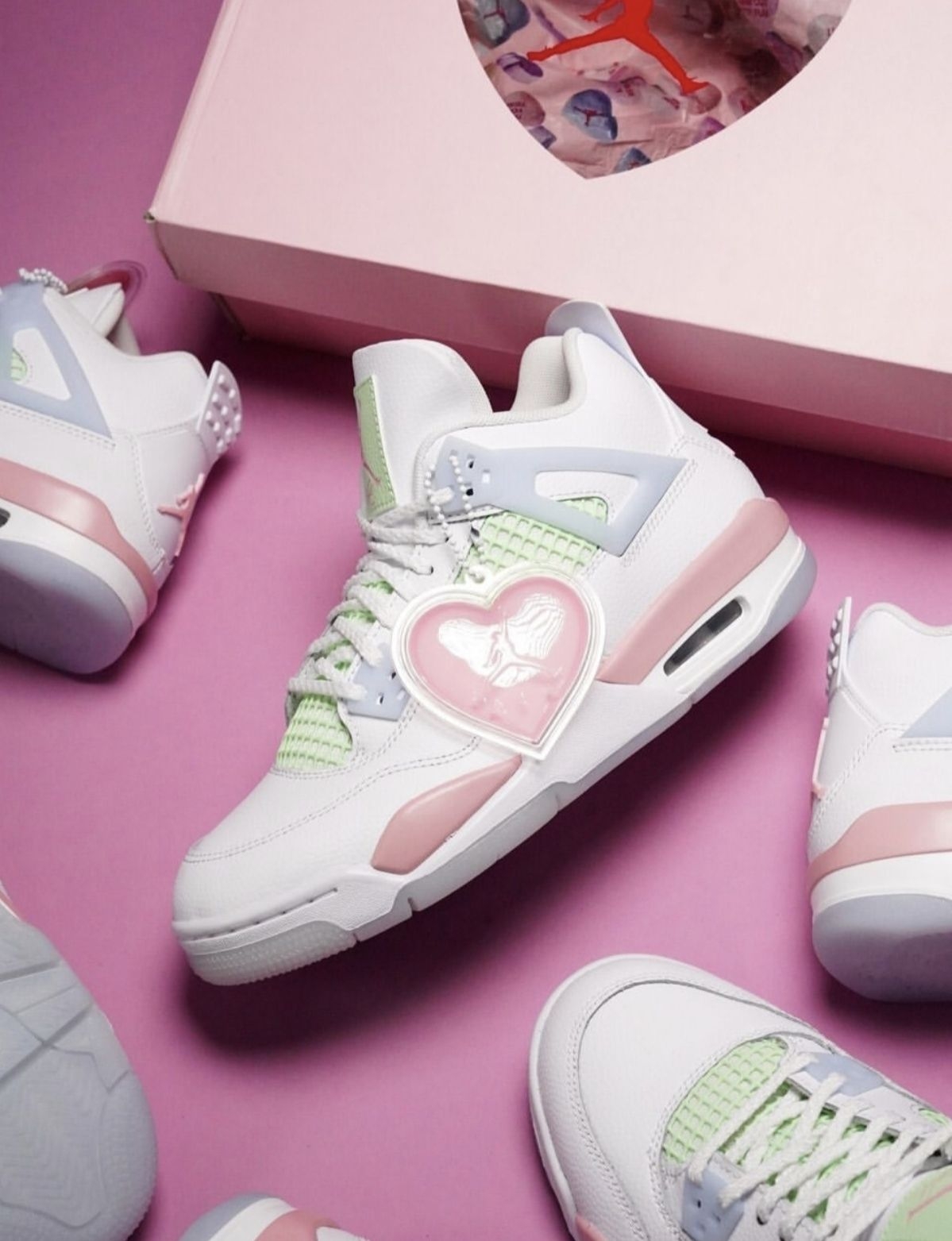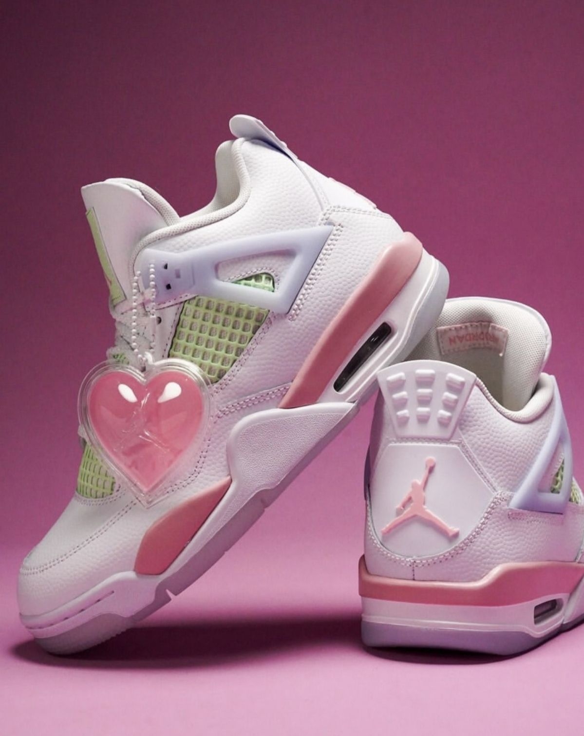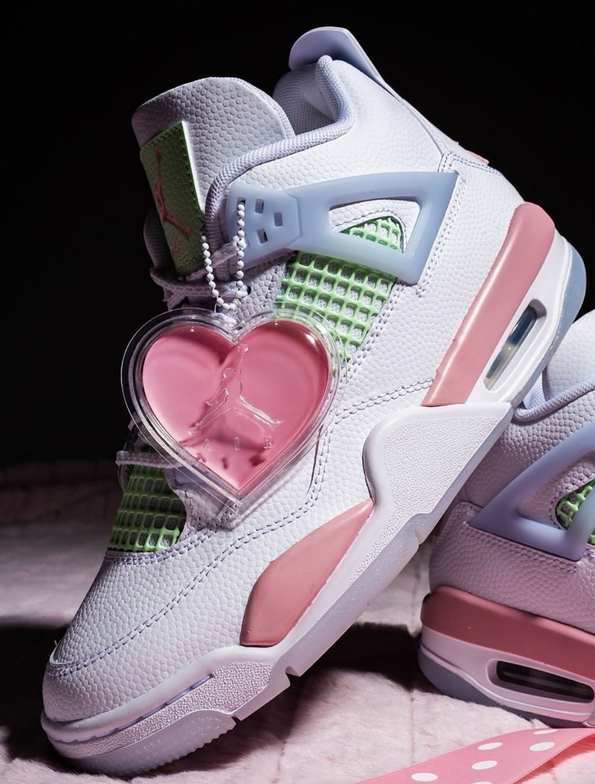 情人节还在愁送什么?这双AJ4情人节GS直接封神!奶白鞋身+淡粉点缀,鞋侧的爱心吊饰藏着专属浪漫,薄荷绿网布中和了甜腻感,甜酷平衡得刚刚好。无论是自留还是送礼,都能让对方一眼沦陷,把情人节的仪式感穿在脚上,每一步都踩在心动上。