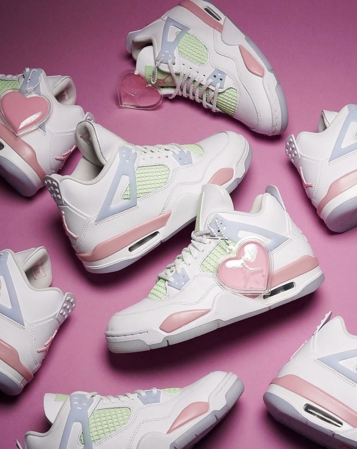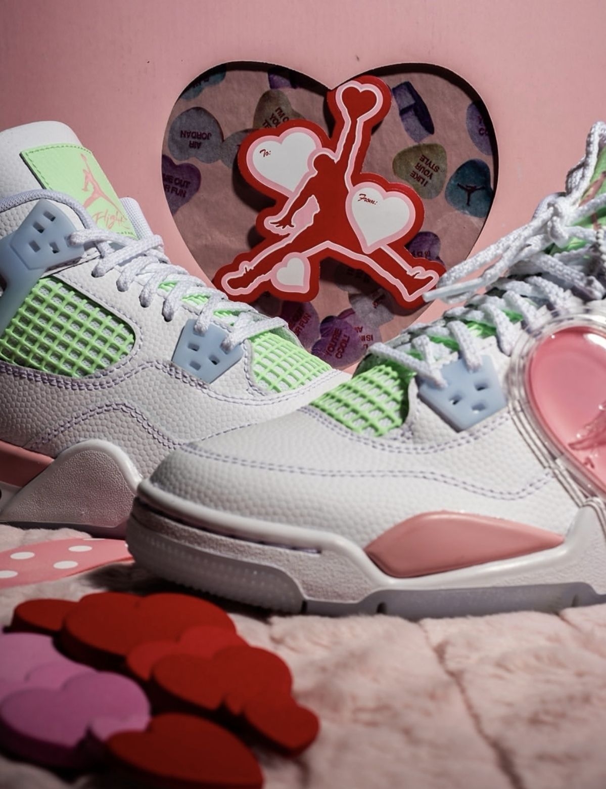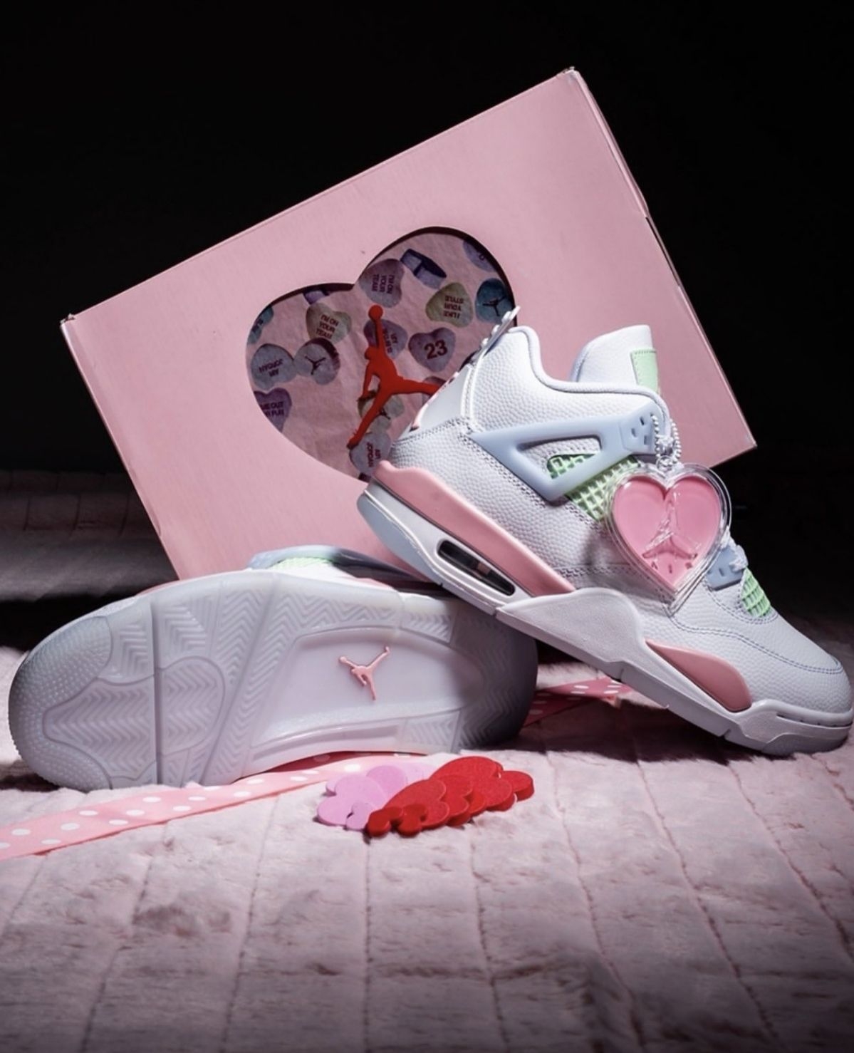 情人节还在愁送什么?这双AJ4情人节GS直接封神!奶白鞋身+淡粉点缀,鞋侧的爱心吊饰藏着专属浪漫,薄荷绿网布中和了甜腻感,甜酷平衡得刚刚好。无论是自留还是送礼,都能让对方一眼沦陷,把情人节的仪式感穿在脚上,每一步都踩在心动上。