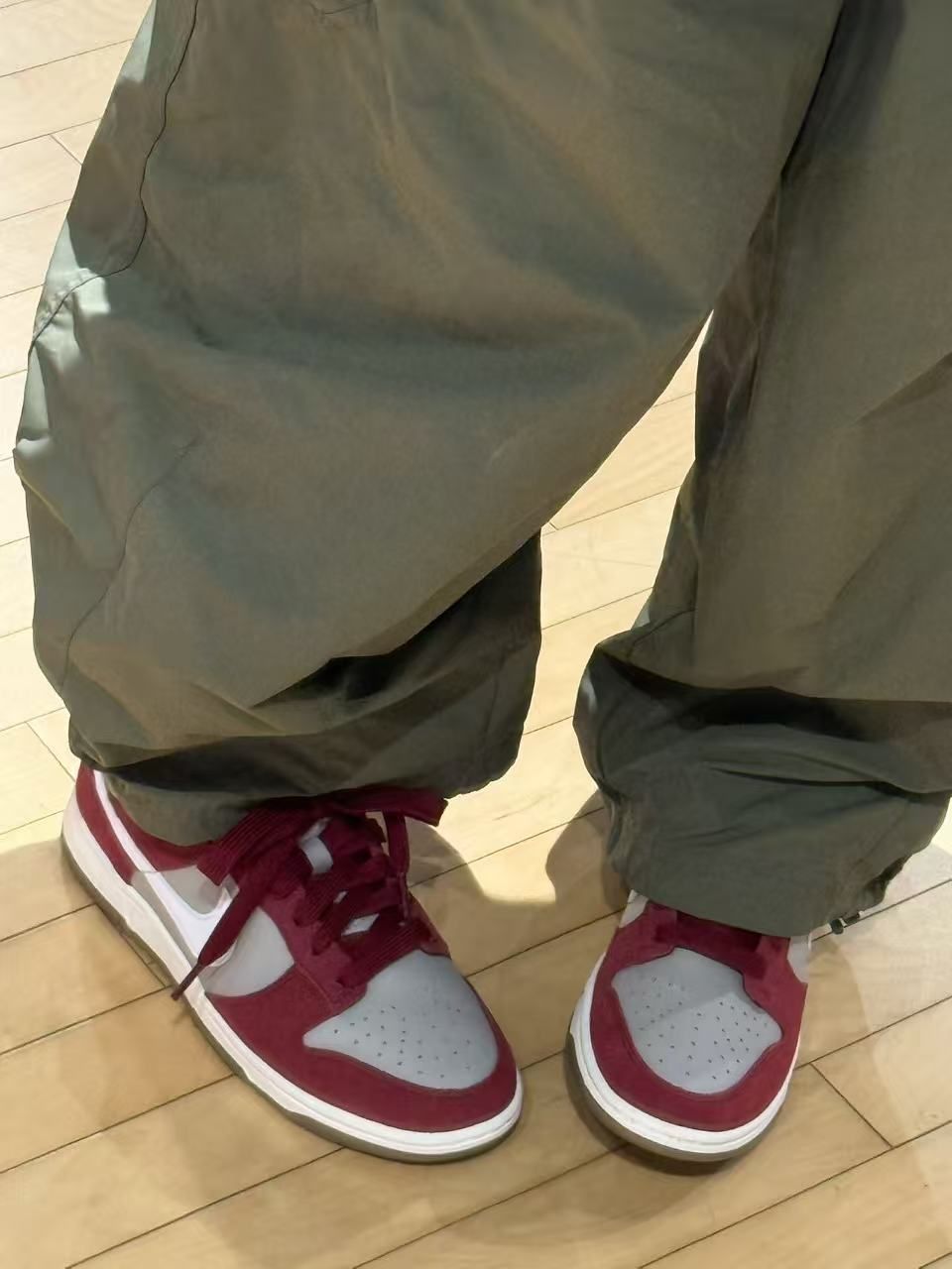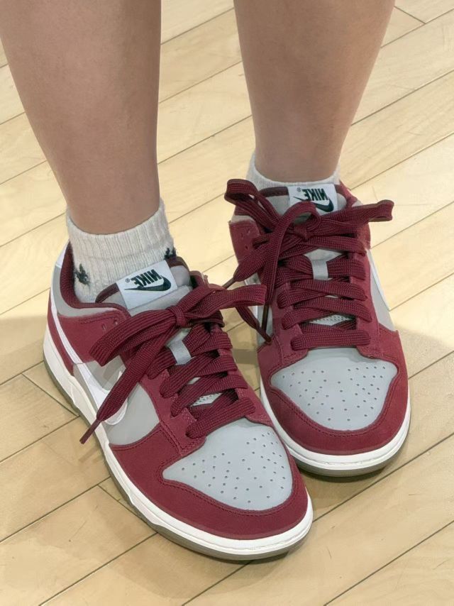 这双Nike Dunk Low红灰配色真的太戳我了! 酒红翻毛皮像微醺的红酒,浅灰皮革则像清冷的月光,撞色设计既有复古感又不失高级感。生胶底的细节,让整双鞋更具质感,搭配同色系的上衣,瞬间变身美式复古女孩。 不管是约会还是出街,它都能完美适配,是这个春天最值得入手的一双鞋!