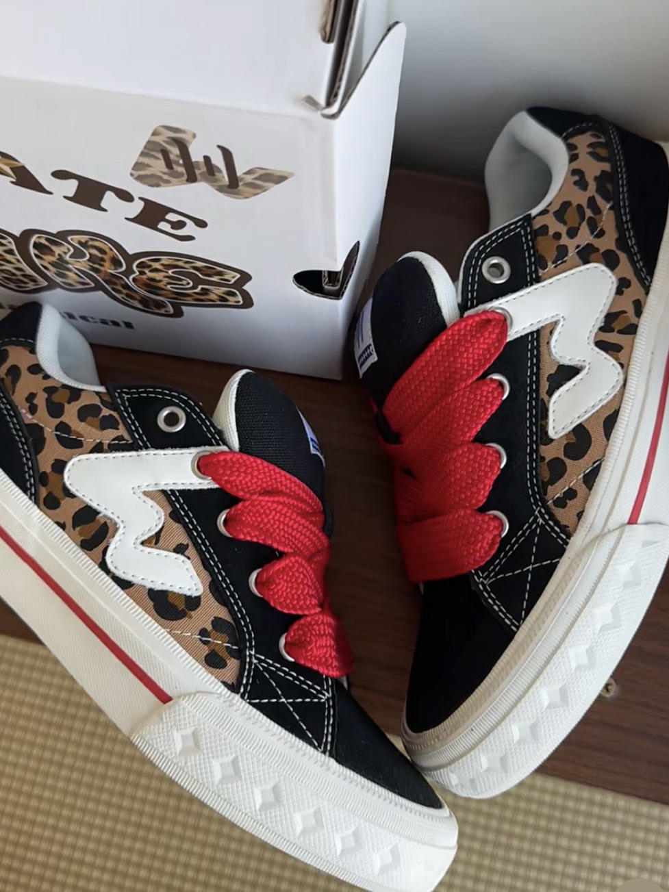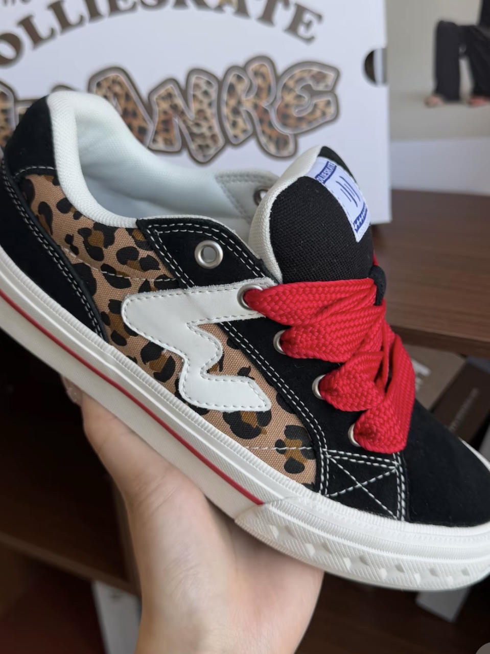 这双顽刻豹纹鞋真的很有个性!它是黑底的豹纹拼接,再配上亮眼的红鞋带,复古又带点野劲儿。而且我感觉它的翻毛皮和帆布的质感很不错,上脚舒服还挺百搭,不管是搭牛仔裤还是运动裤都ok。日常出街或者滑板穿都可以,属于那种越看越上头的款~