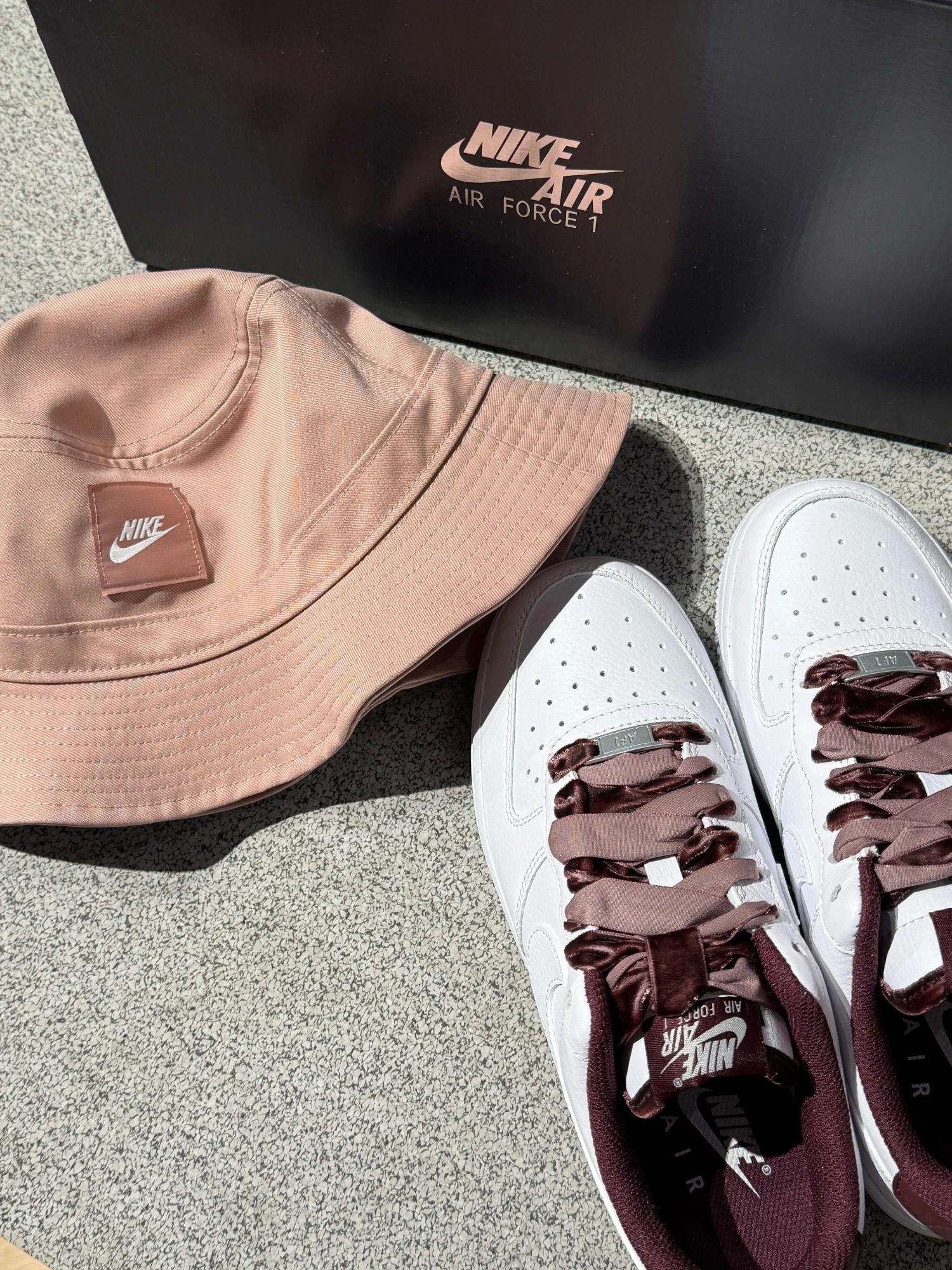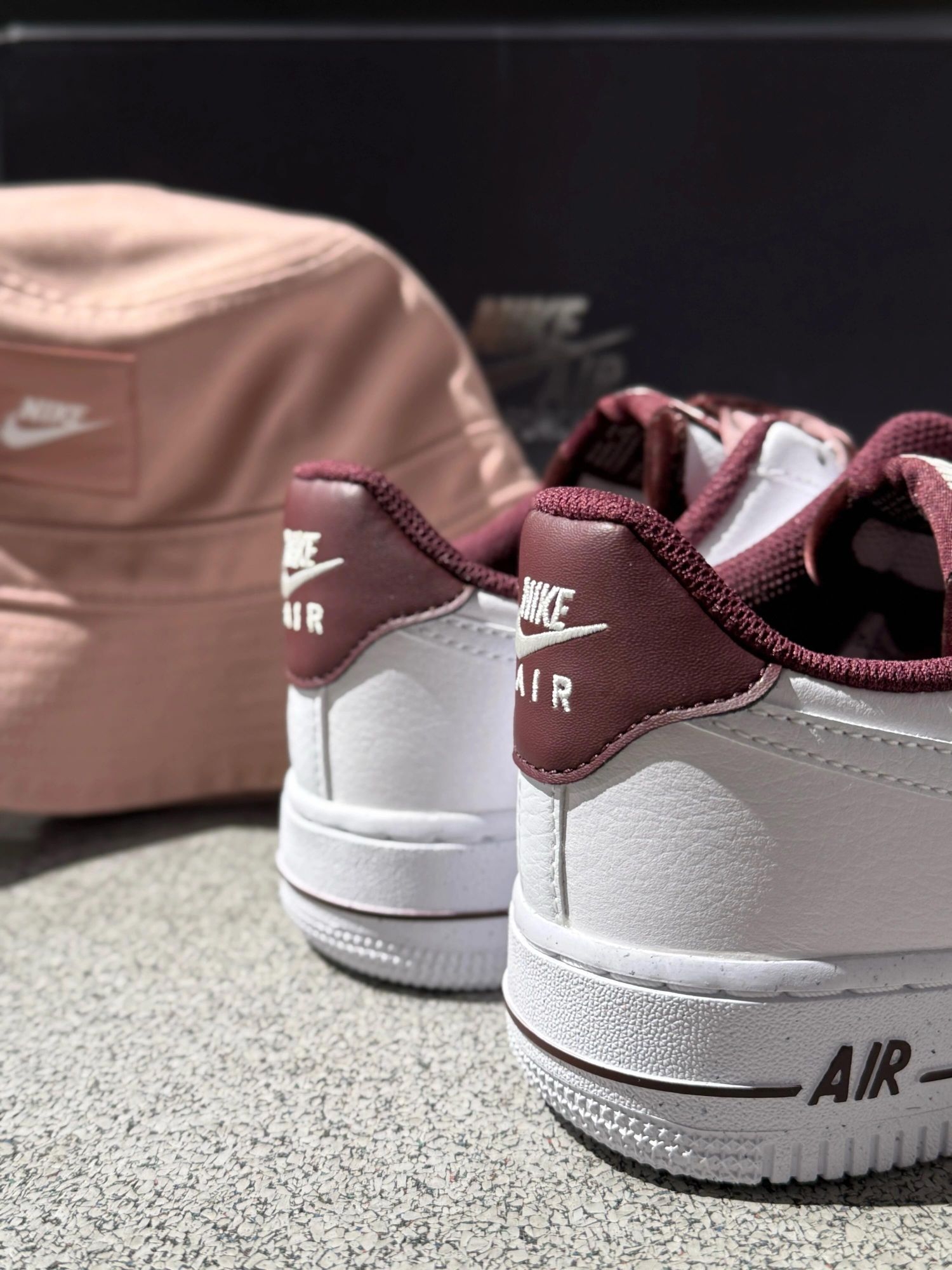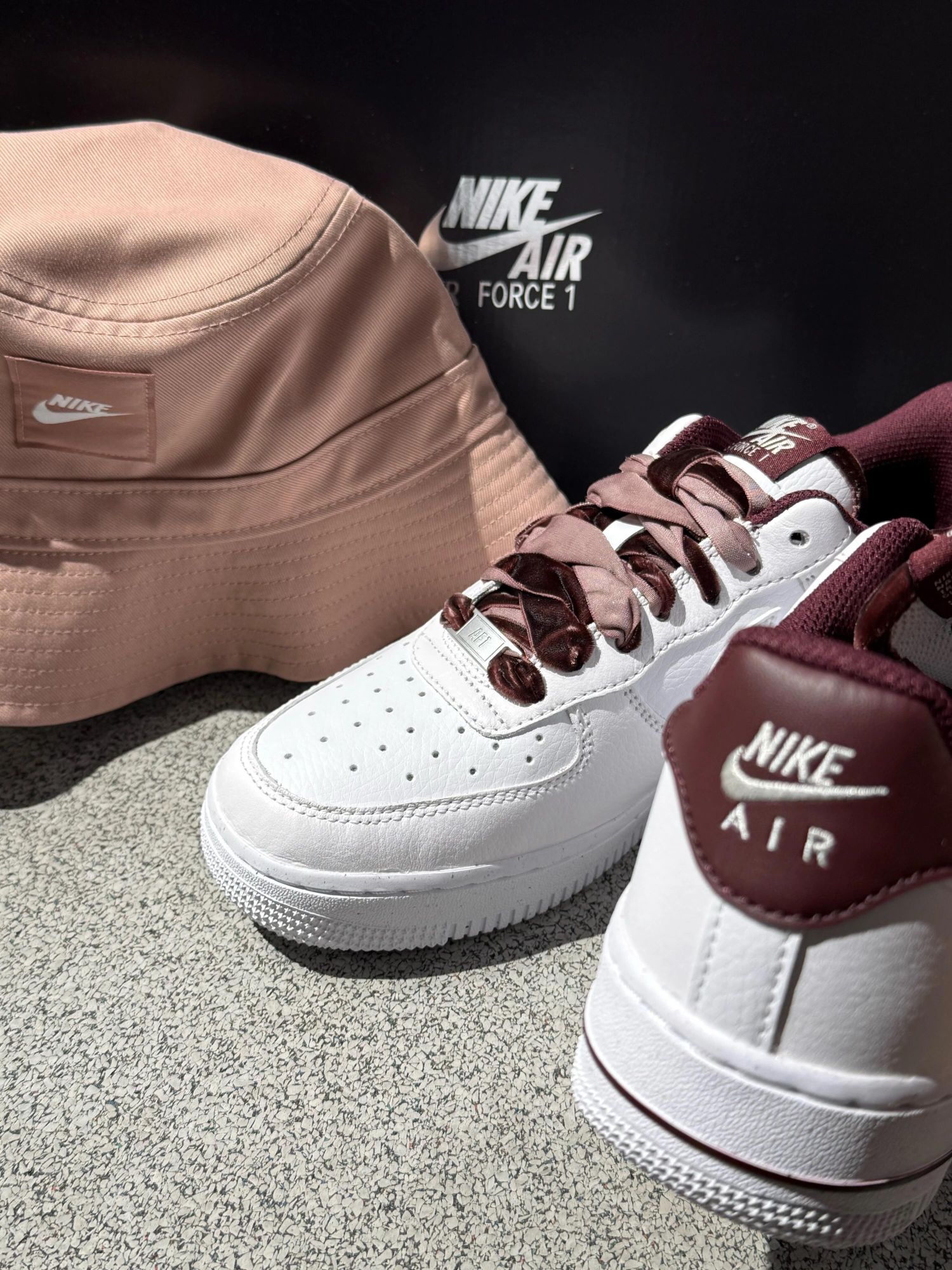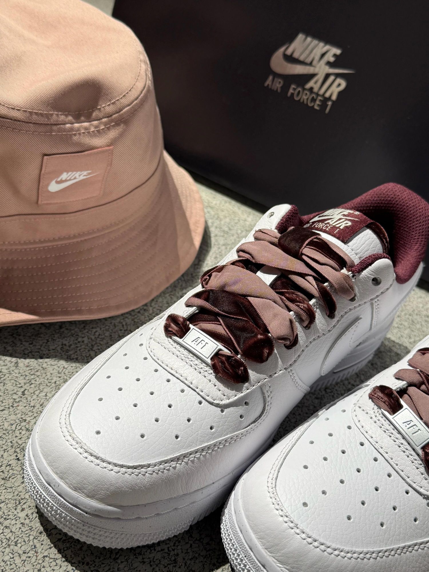 我的天🤦🏻谁能拒绝一双自带丝绒buff的AF1啊! 奶白色荔枝纹皮面柔软又高级! 搭配酒红➕裸粉丝绒鞋带🩰甜酷感拉满 鞋舌和鞋口的丝绒真的很细节啦! 上脚显贵还自带温柔滤镜哦🥰 配同色系Nike渔夫帽出街回头率满分~ 搭牛仔裤、连衣裙都很美 国庆出游选它✌🏻