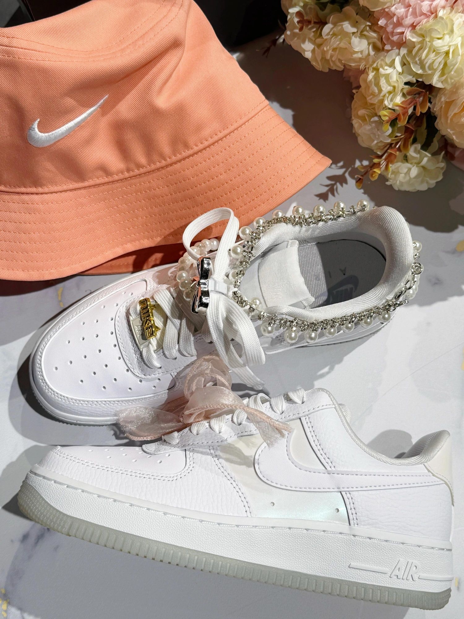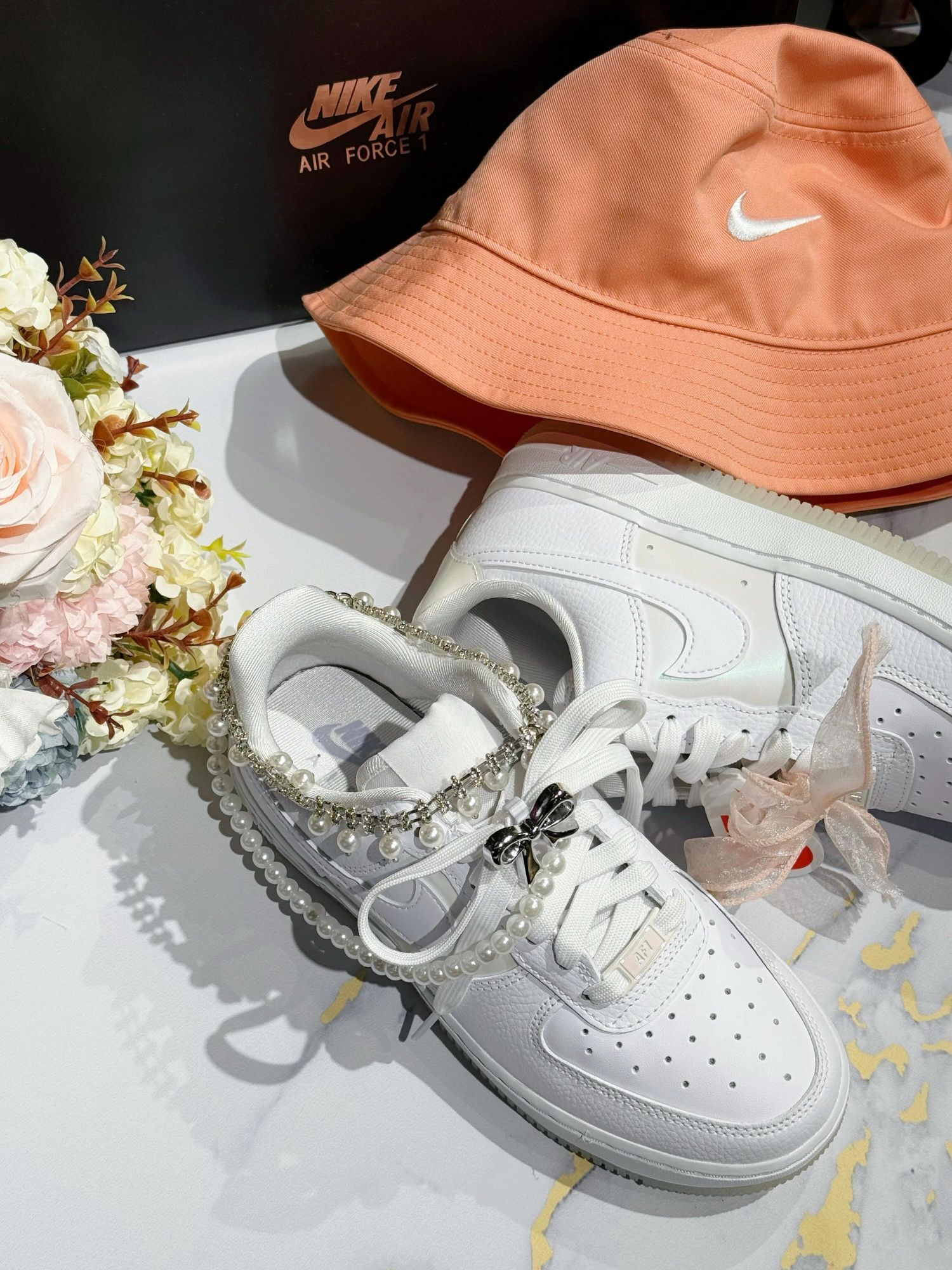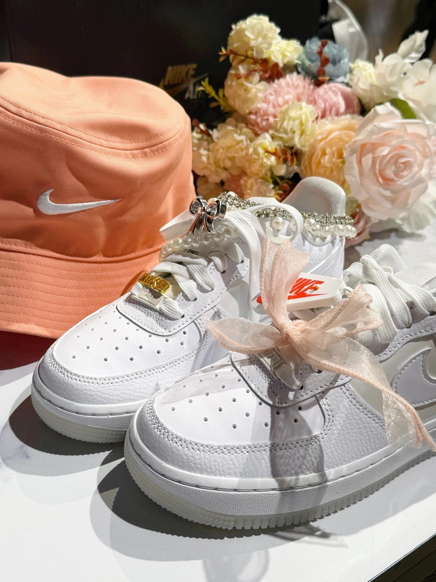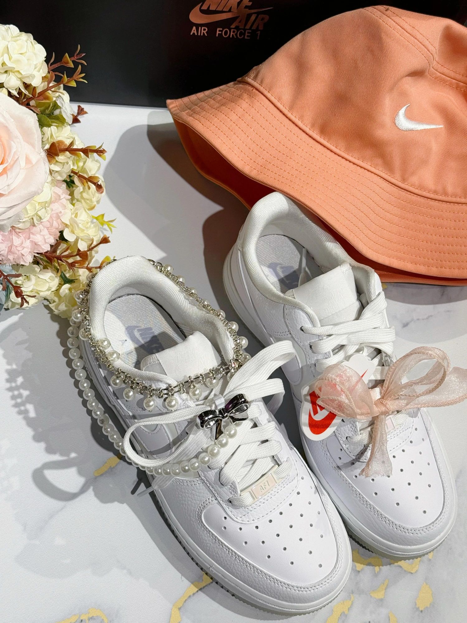 被问爆了🫠这空军穿上谁穿上都很甜酷呀~ 把空军一号改成公主风也太美了! 左边珍珠链➕蝴蝶结扣🎀甜妹本妹 右边欧根纱丝带 直接温柔到骨子里~ 鞋侧偏光真的很有细节 好精致呀🌟 谁能想到AF1也能这么嗲!真的百搭! 日常通勤出游搭配都好穿 很有氛围感🫧