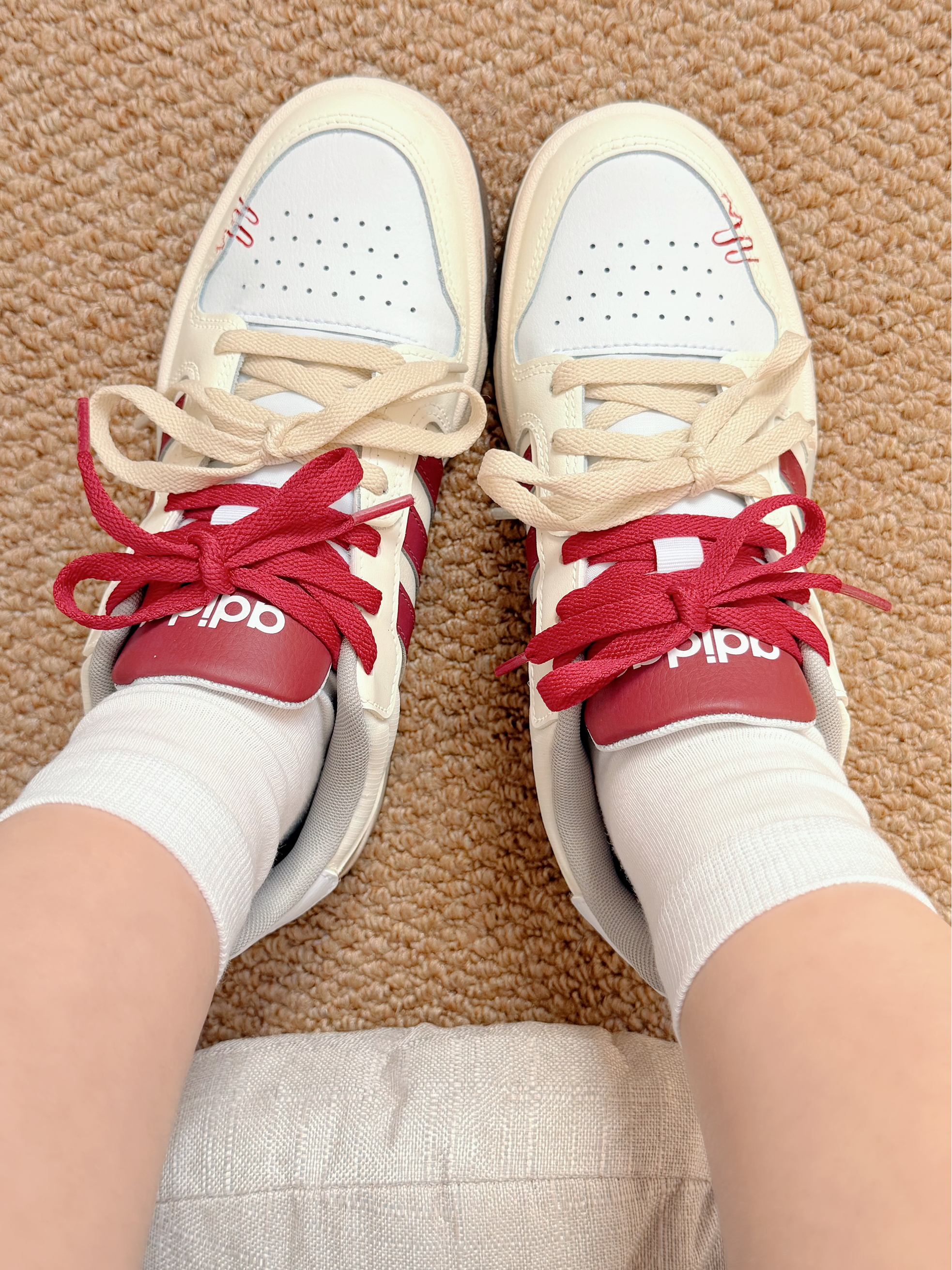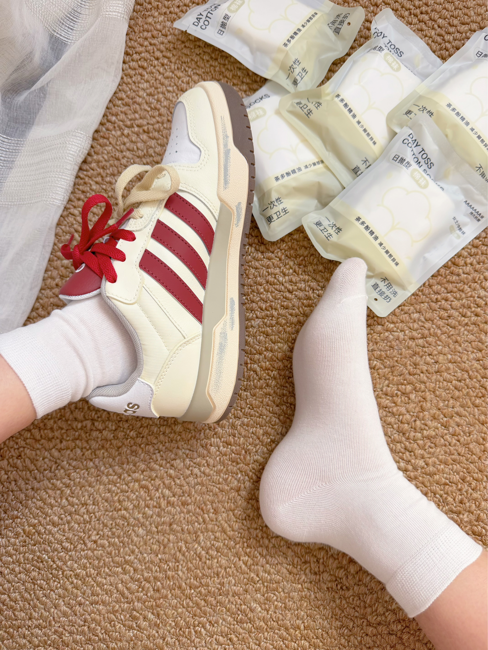 北贝我尊嘟吼喜欢今天滴这个搭配 个人觉得百搭又好看还挺适合新年和春天的~ 阿迪定制板鞋和纯棉的小白袜 纯棉材质敲舒服的还有淡淡的香味 厚度属于那种薄一点的不会闷脚包裹性也不错👍 每一双都是单独包装出去旅游必备不要忒方便了✌️ 穿着去逛街走很久脚也不累 也没有捂脚臭脚~