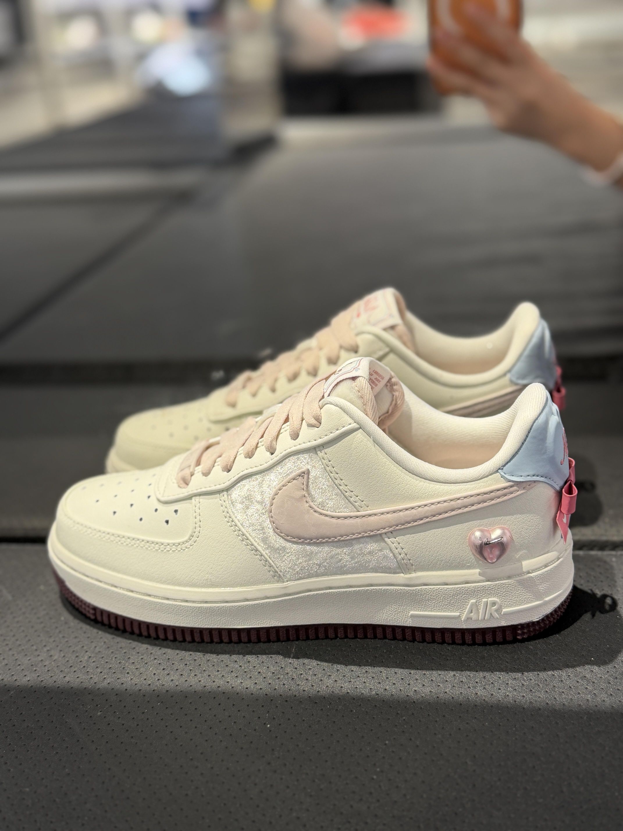谁懂啊!Nike Air Force1情人节限定真的戳中少女心了米白色的鞋身搭配藕粉色的勾子,还有丝绒材质的拼接,温柔感直接拉满~鞋侧的小爱心装饰超精致,鞋头的爱心气孔细节也超用心,细节控真的会爱!