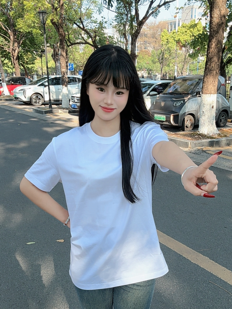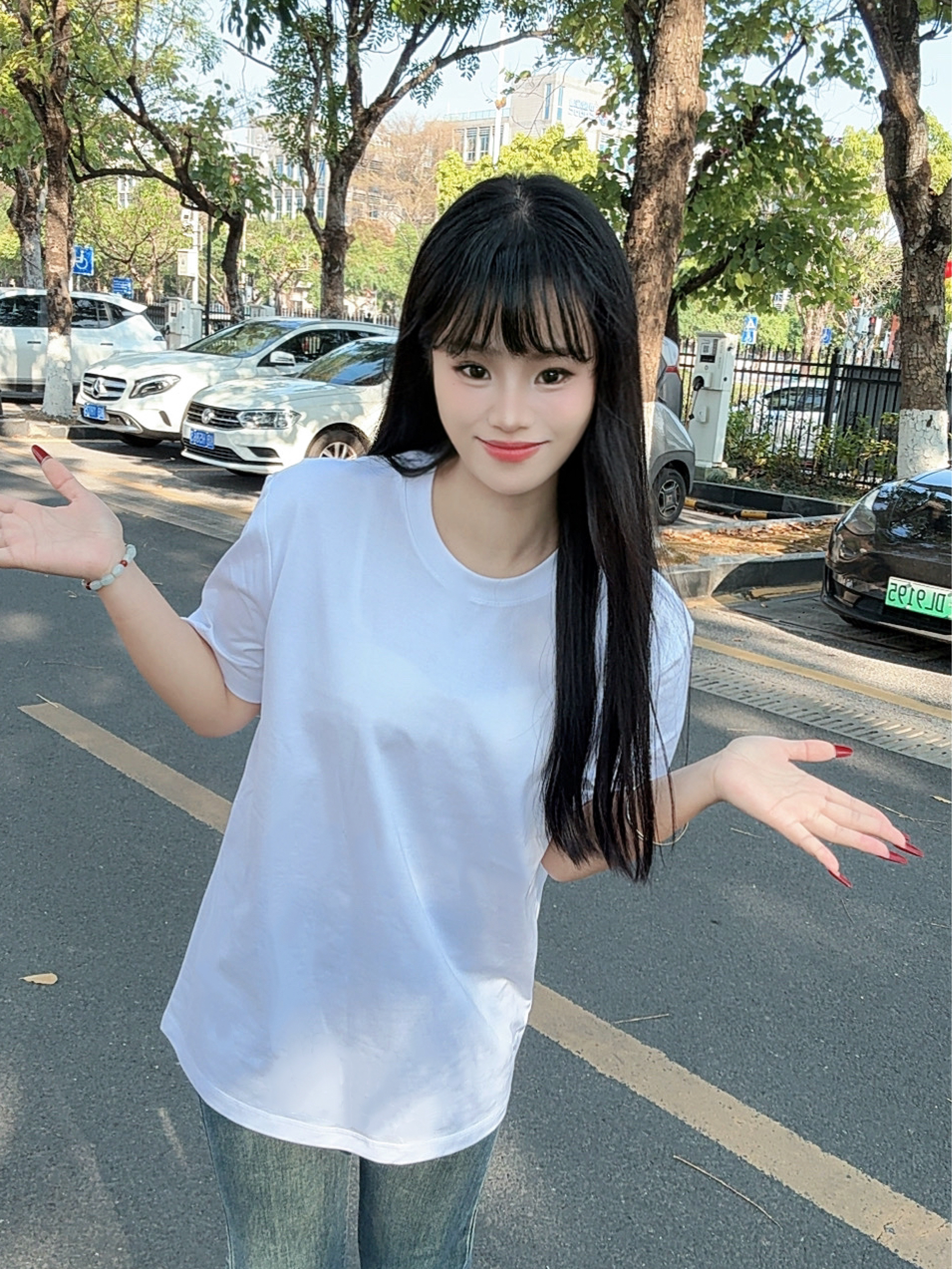 纯色基础款,白T经典百搭,搭牛仔裤真百搭啊🥹🥹而且男女同款都能穿👍👍穿上不勒脖子,版型超正的,本人160体重98穿上m码的刚刚好😝😝这件衣服都不挑人的