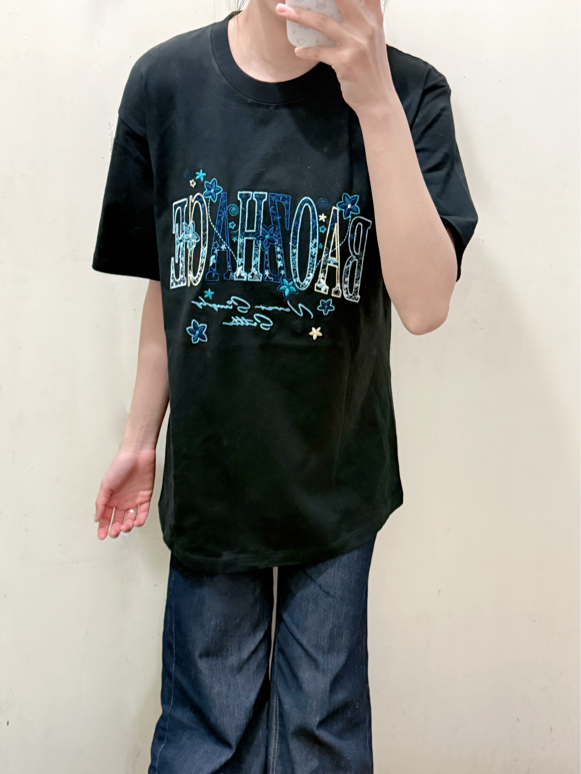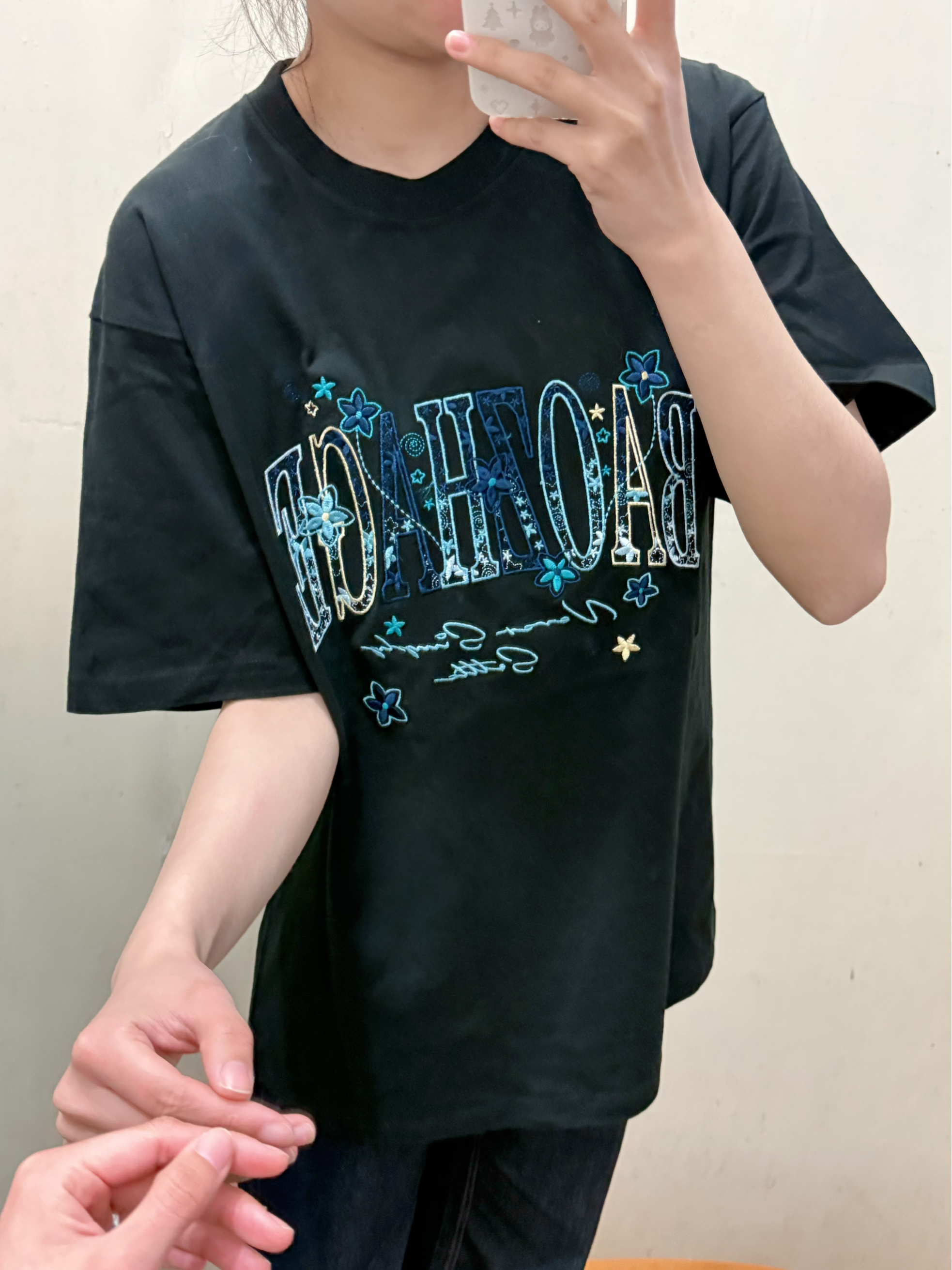 166 102穿的是M码 是纯棉的短袖哟 而且上面还有多种颜色的刺绣 上身很有质感 穿上也不会闷热 喜欢的宝宝可以参考一下哦