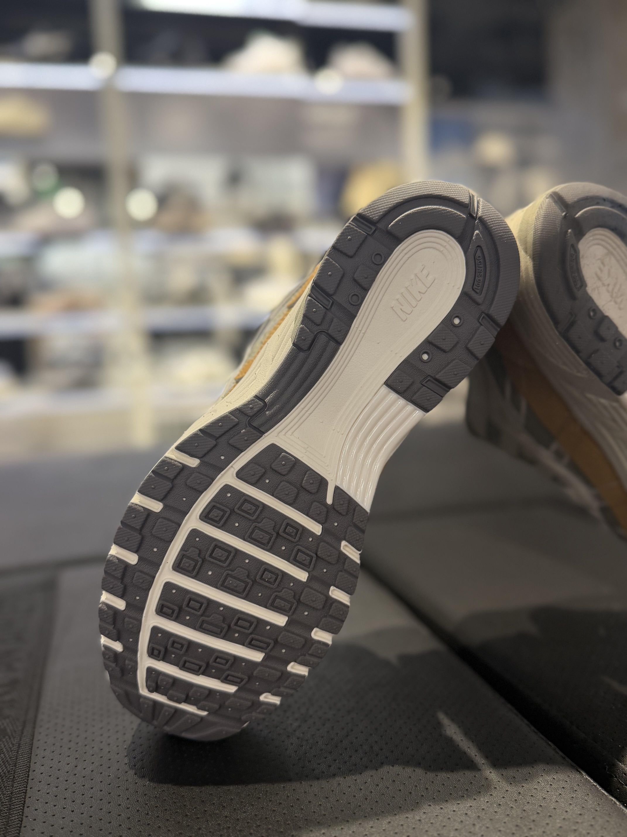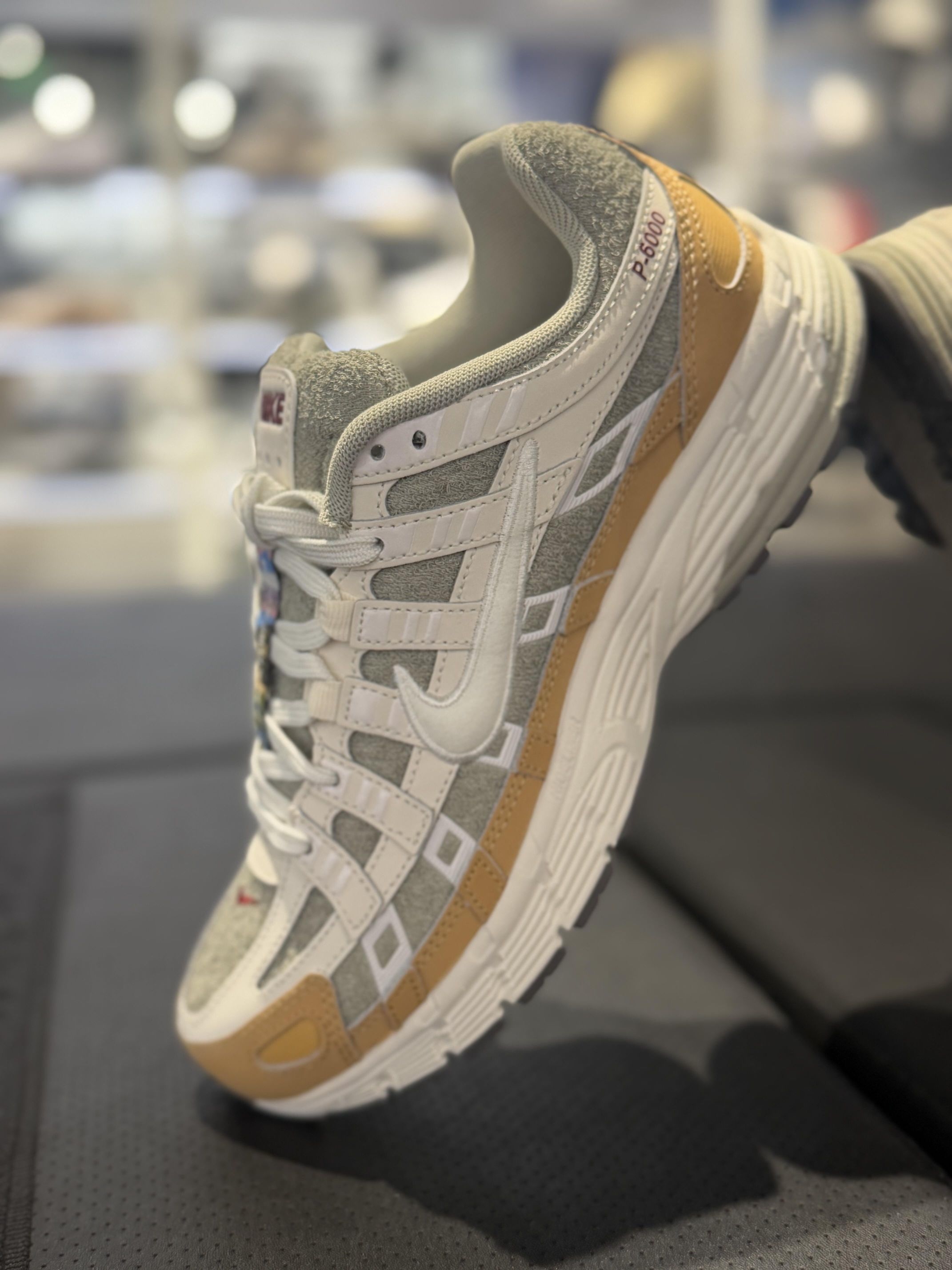 Nike P-600以米白+焦糖棕为主调,将复古跑鞋的经典轮廓与层次拼接设计完美融合。鞋身采用网眼布,麂皮与合成革多重材质叠加,浅灰色的做旧质感织物穿插其中,让鞋面肌理感十足;焦糖棕的色块在鞋跟,鞋头及中底侧沿形成视觉焦点,与米白色的基底碰撞出温暖的复古氛围。
