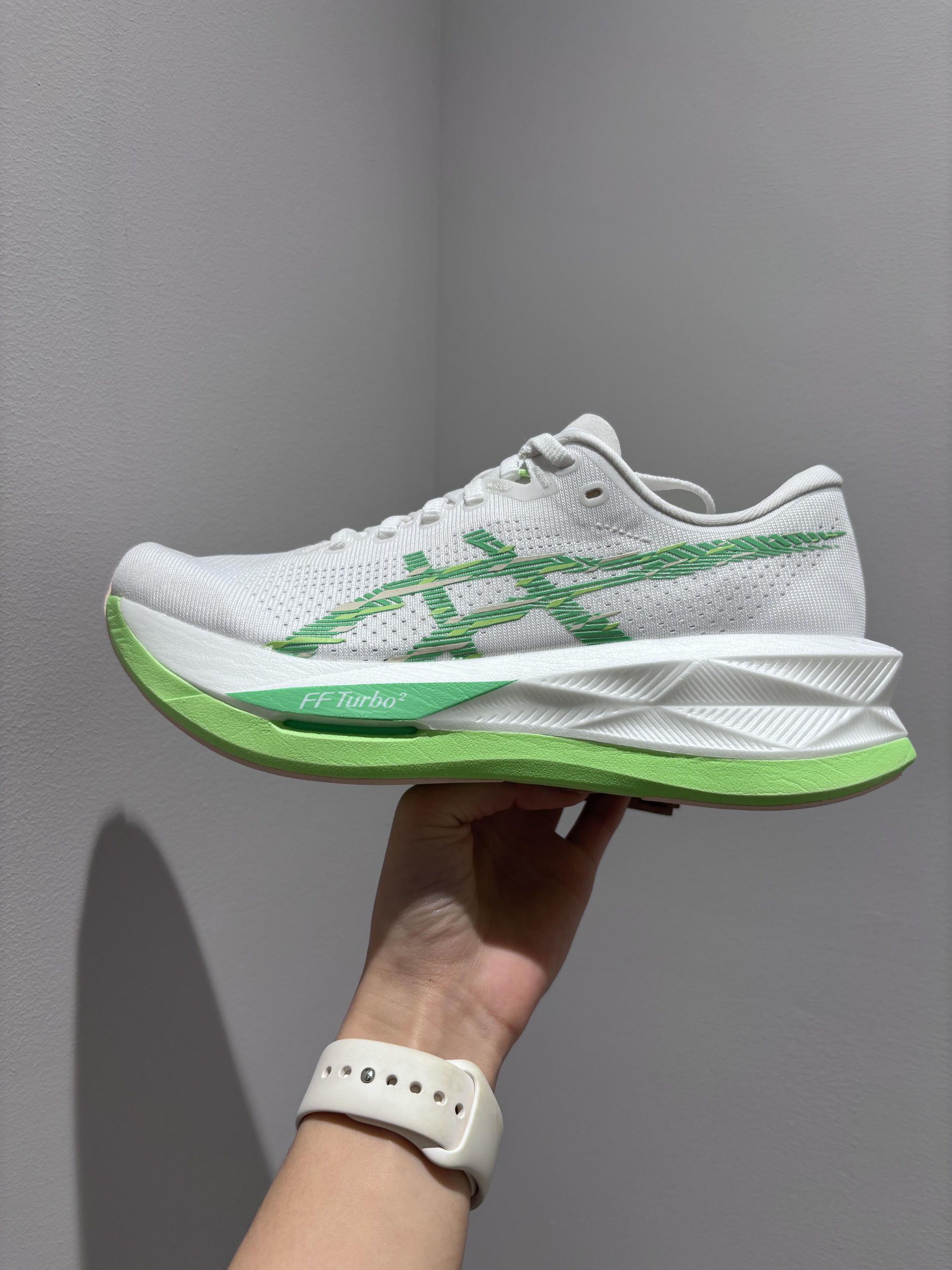 鞋子是网面的,非常透气。上脚轻盈,脚感很出色。全掌GEL胶+AMPLIFOAM中底,走路跑步回弹缓震感明显。白色款百搭