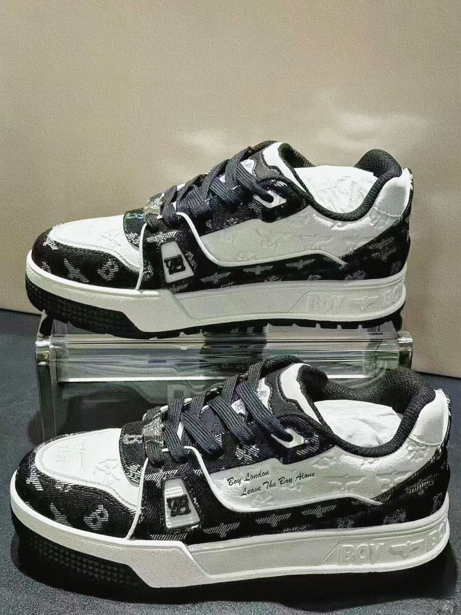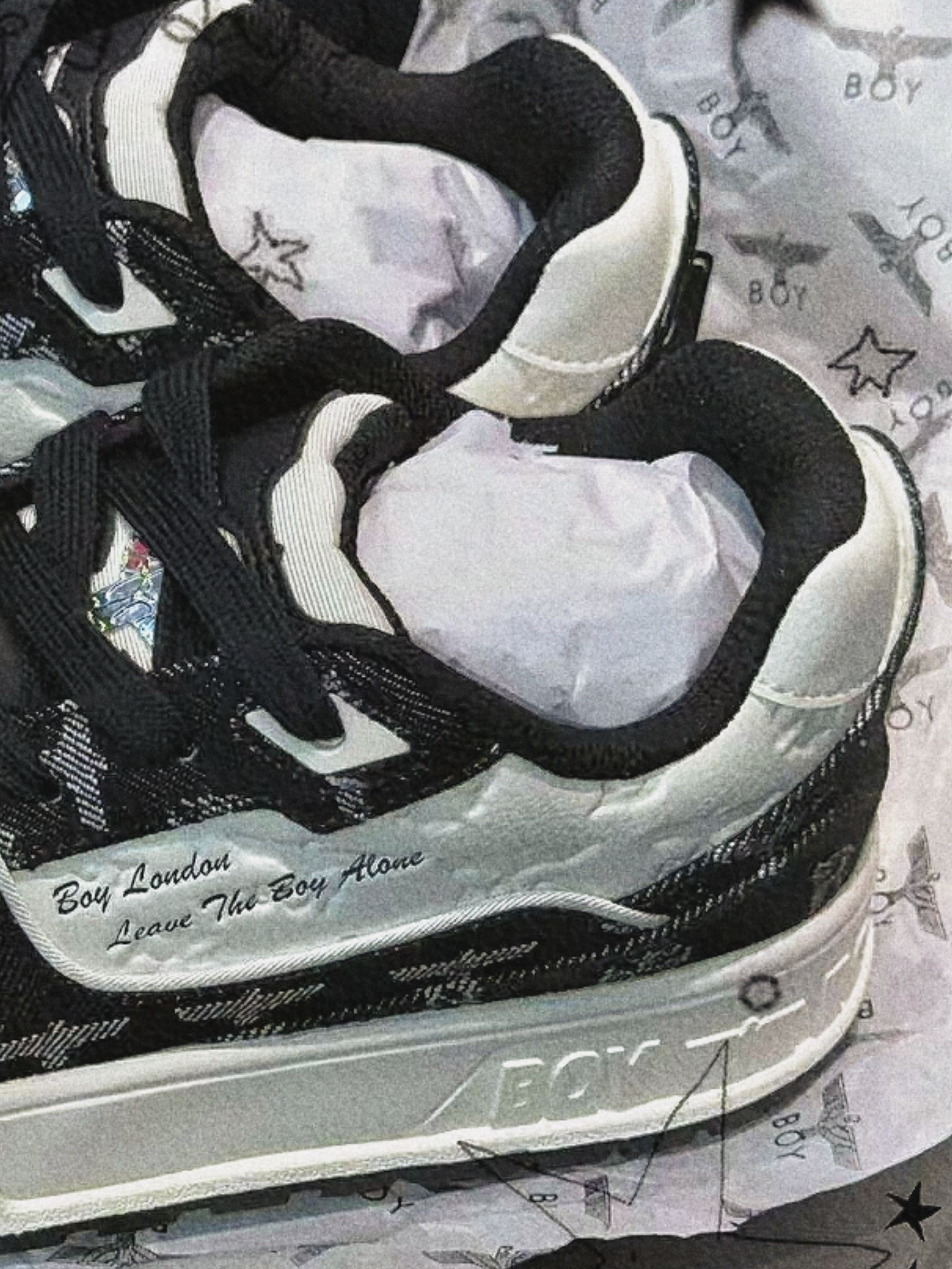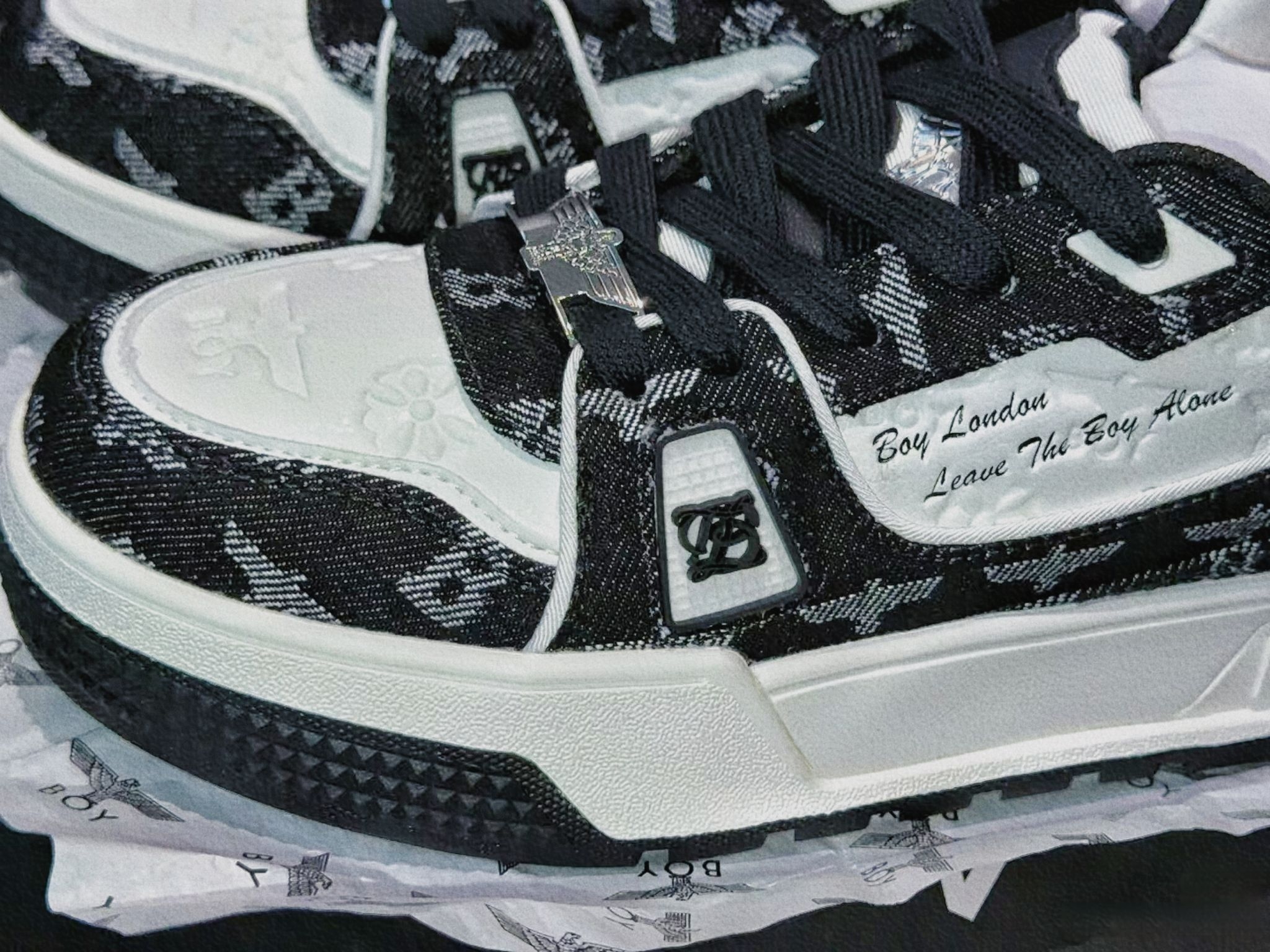 今天终于把这双BOY London的板鞋拿下了。 视觉感受 一眼沦陷的复古感这双鞋就像自带聚光灯一样,黑白提花的牛仔布面+压纹皮革,一下子就抓住了我的眼睛。 - 鞋头的压纹BOY鹰标和小雏菊,低调又有细节,摸上去的质感很扎实。 - 鞋身的满印提花,既有复古牛仔的随性,又带着品牌标志性的酷感,不会显得花哨。 - 鞋侧的“Boy London Leave The Boy Alone”字样...