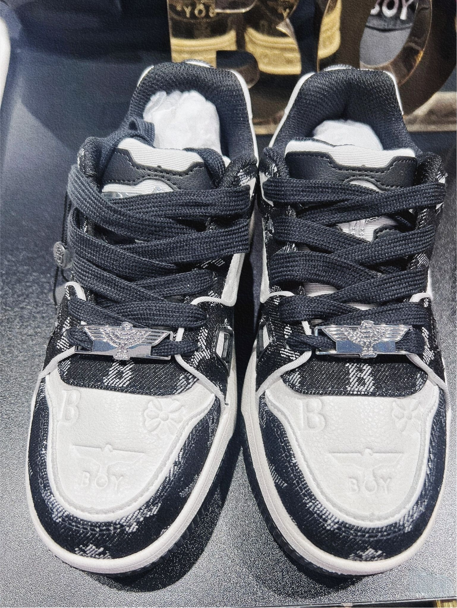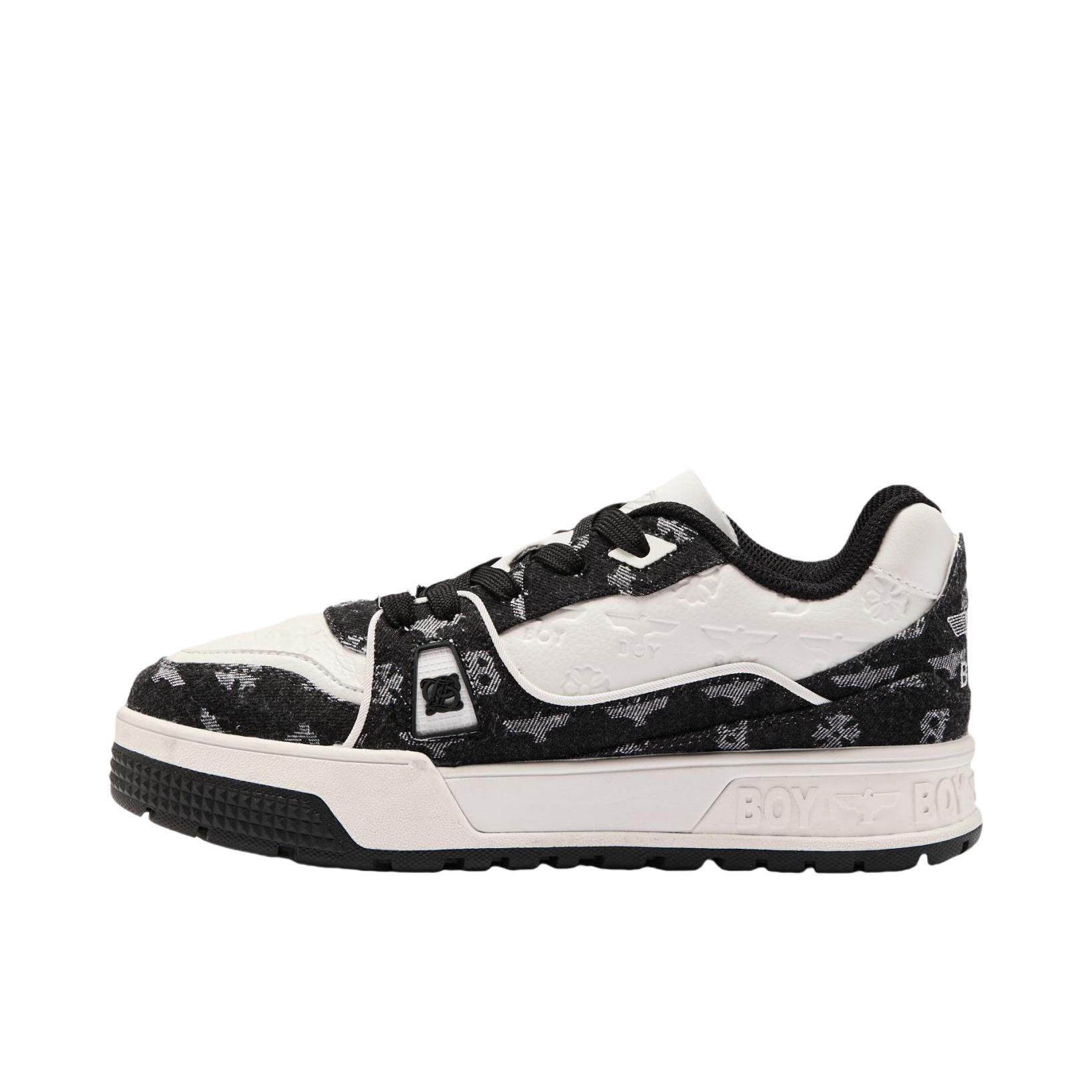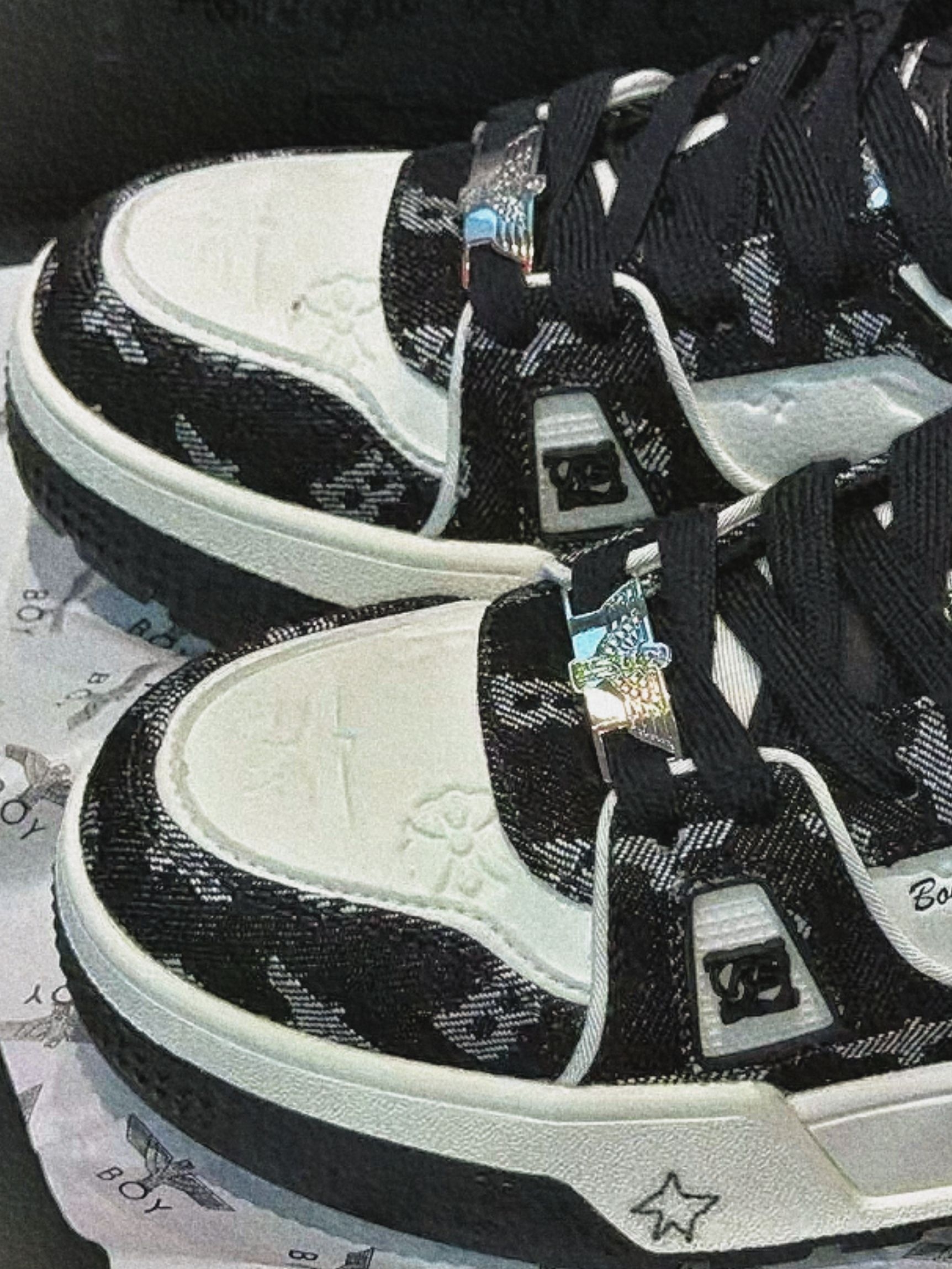 今天终于把这双BOY London的板鞋拿下了。 视觉感受 一眼沦陷的复古感这双鞋就像自带聚光灯一样,黑白提花的牛仔布面+压纹皮革,一下子就抓住了我的眼睛。 - 鞋头的压纹BOY鹰标和小雏菊,低调又有细节,摸上去的质感很扎实。 - 鞋身的满印提花,既有复古牛仔的随性,又带着品牌标志性的酷感,不会显得花哨。 - 鞋侧的“Boy London Leave The Boy Alone”字样...