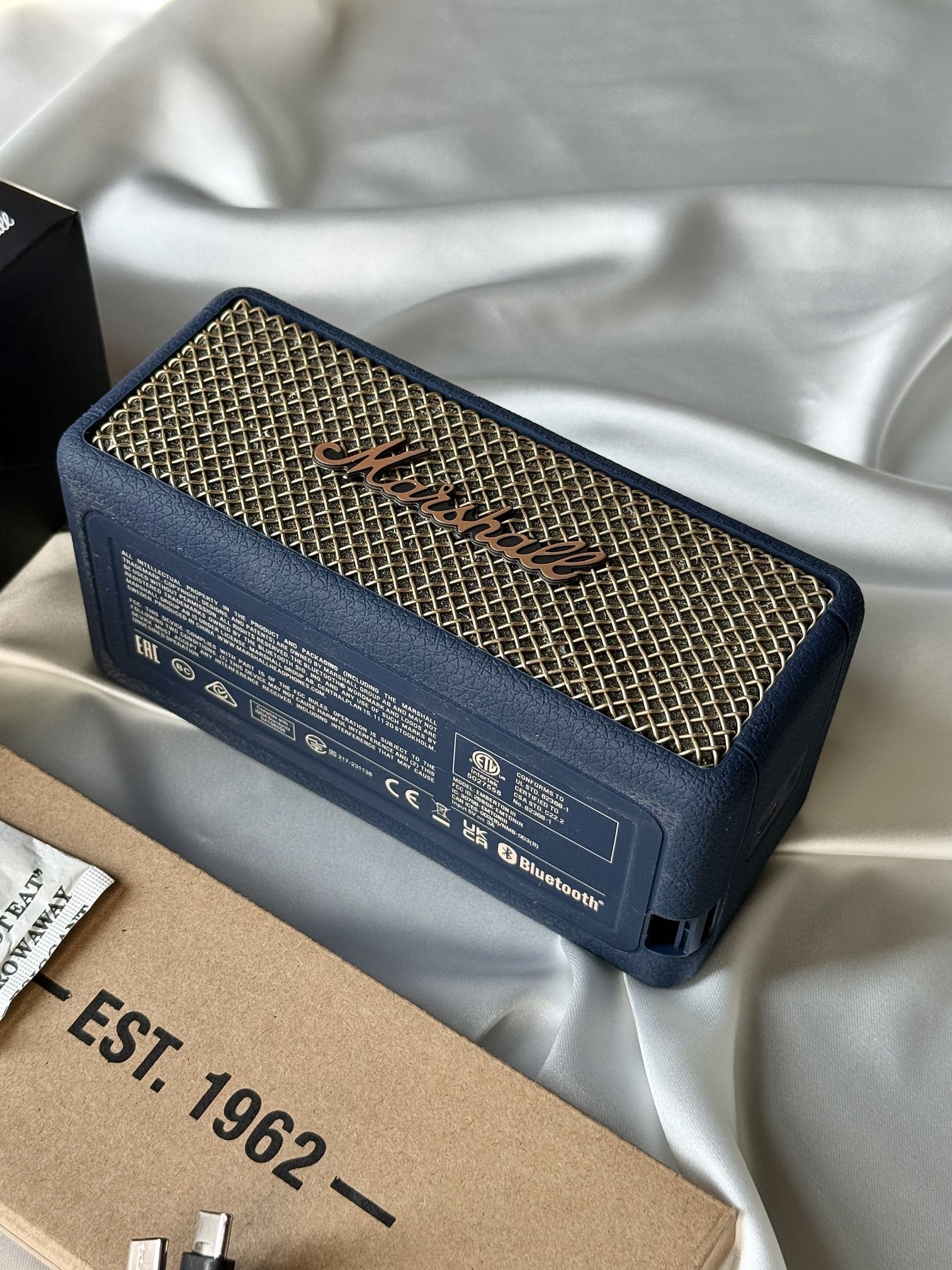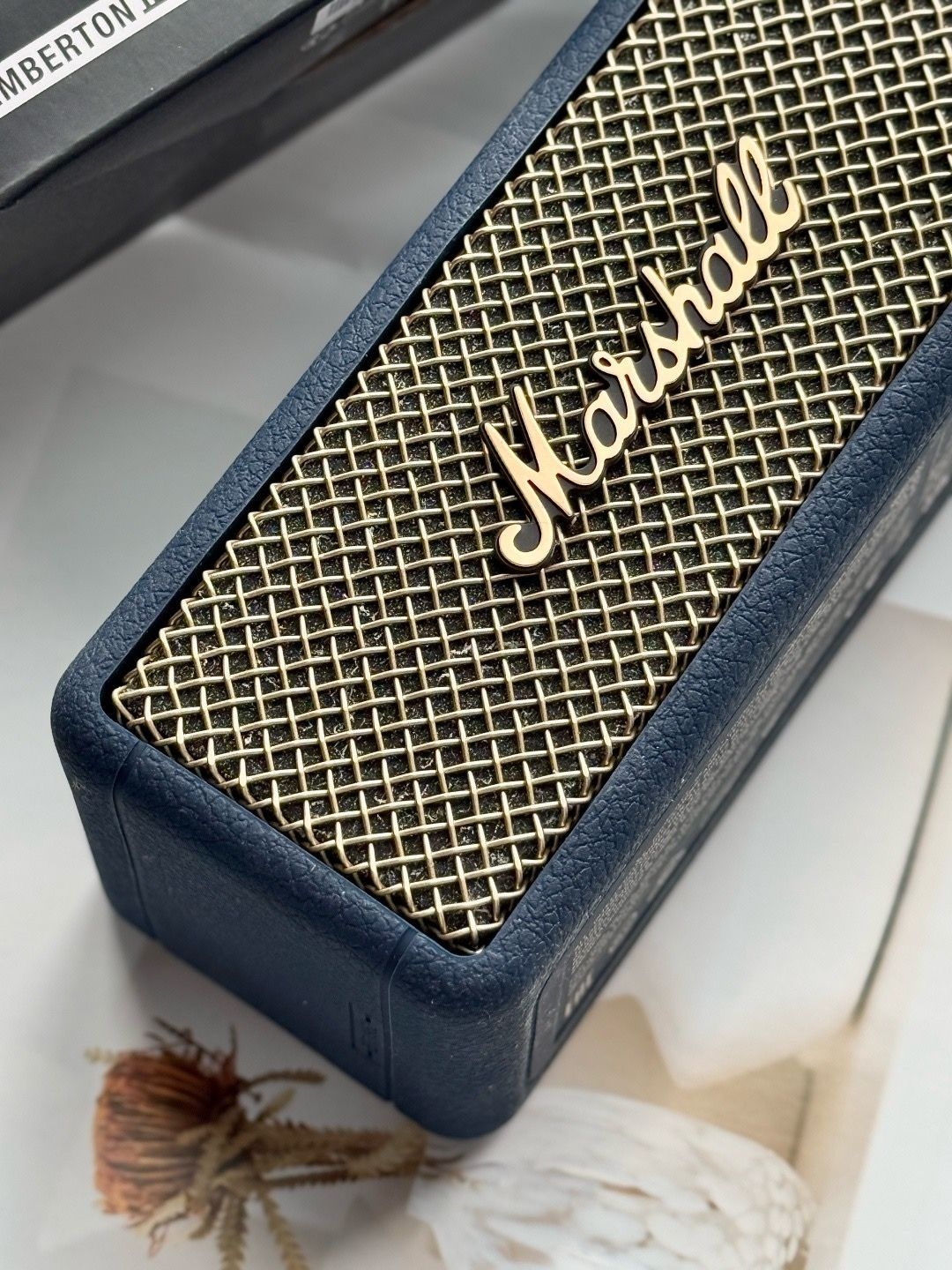 我选的深蓝色。磨砂机身摸上去有细微的颗粒感,不容易留指纹。最抓人的是正面那块覆盖了大半面积的金属网格,以及居中浮雕的金色“Marshall”手写体logo。这个设计语言直接复刻自他们经典的吉他音箱,看一眼就知道血统。它不像很多数码产品追求光滑或科幻感,这种粗犷的、带有工业复古味的设计,反而成了它最独特的潮流标签。巴掌大小,重量适中,挂绳孔的设计很贴心,可以轻松挂在背包或单车把上。它摆在我的露营桌或咖啡店窗边,不像个电器,更像一个很有态度的复古摆件。