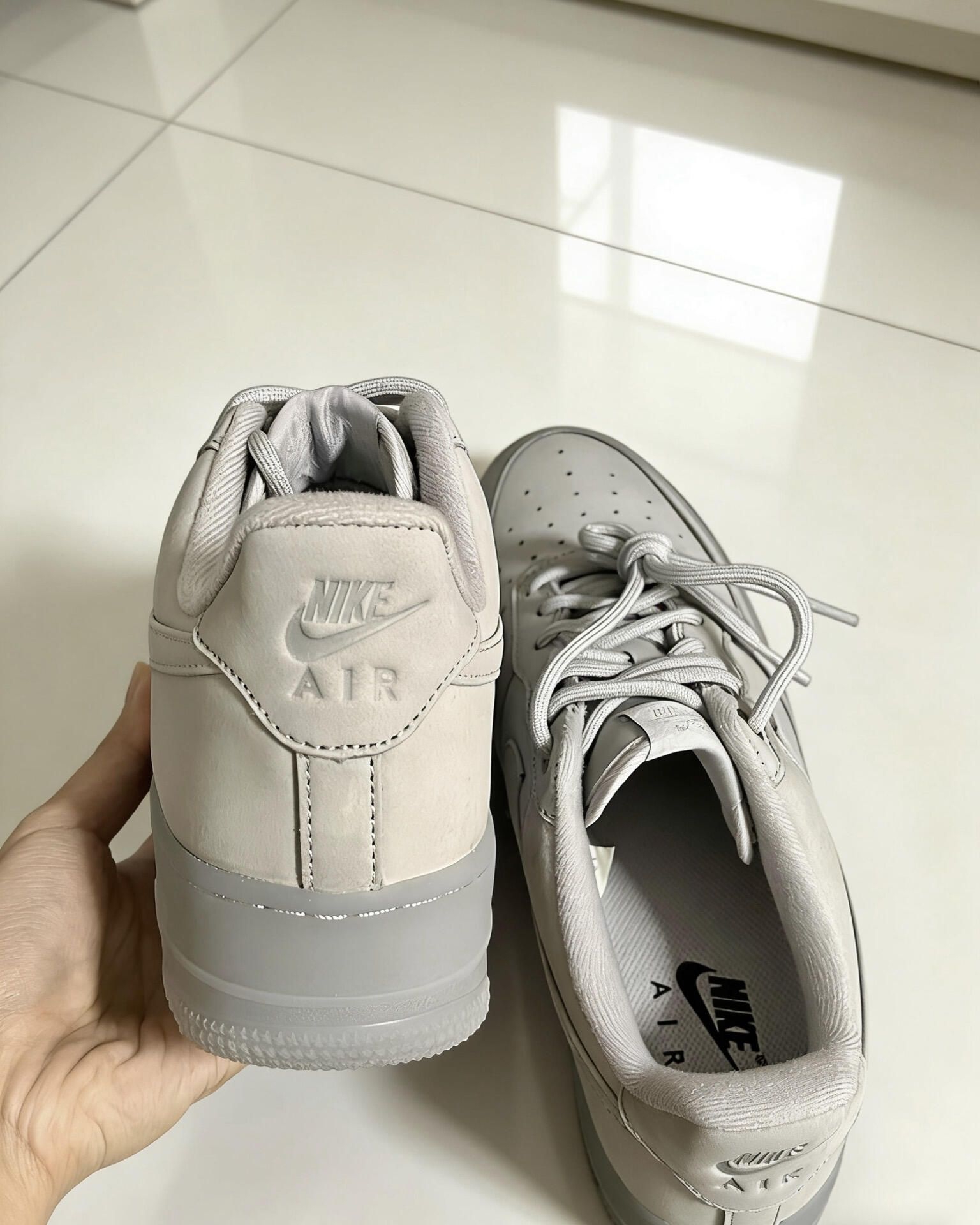 这双空军一号是全灰色麂皮材质,鞋身的Nike Swoosh和后跟的AIR标识都是同色压印设计,细节很耐看。脚感是空军一号经典的软弹脚感,搭休闲裤、工装裤都合适,通勤、约会或者日常出门穿都很适配👟,整体简约又有质感。