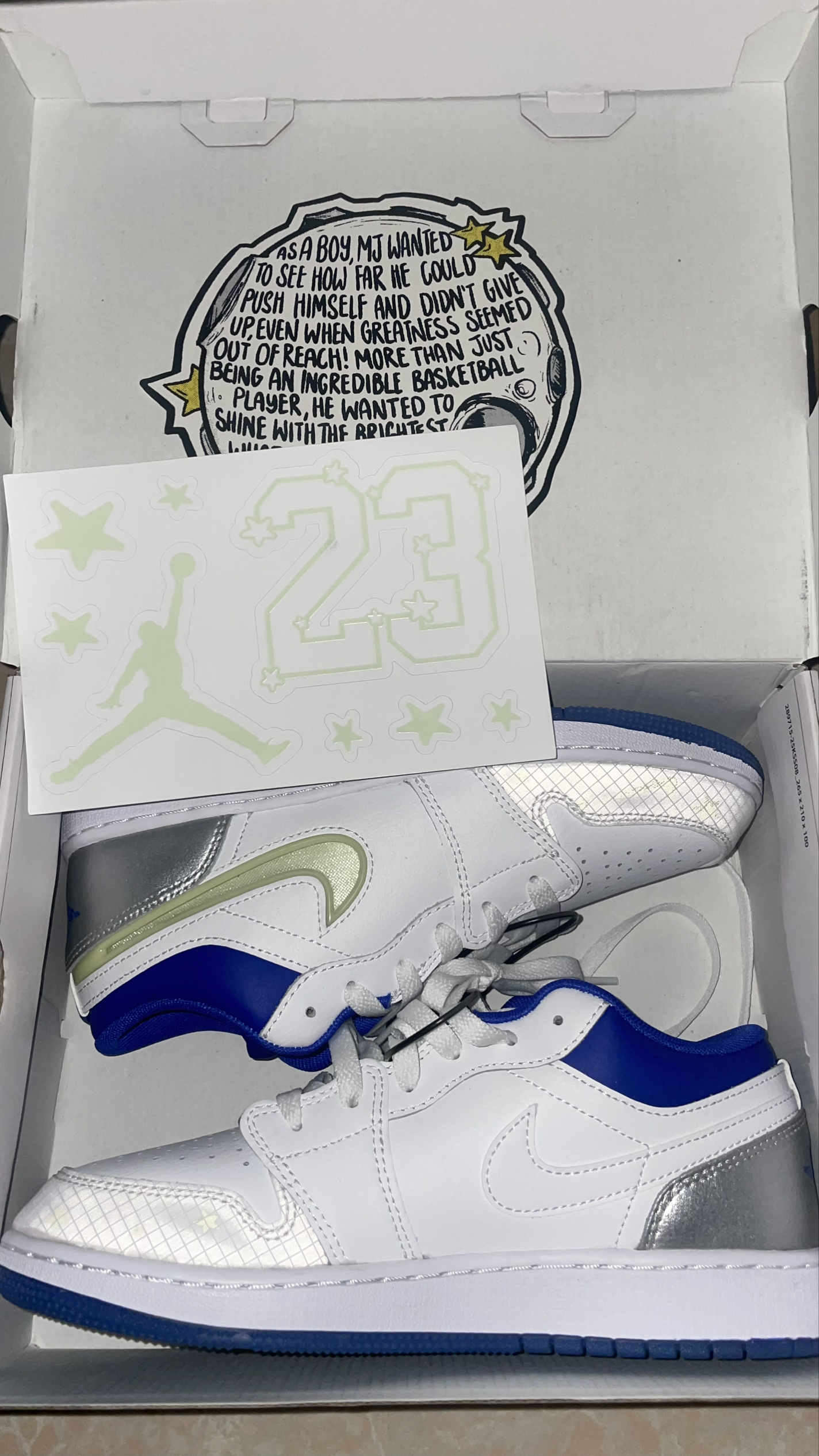 鞋子超级百搭好穿 配色简单大气 鞋底和鞋边的花纹是荧光的 蓝白配色搭配任何裤子都好看 穿上去也防滑 尺码合适 非常合适 四张就可以拿下的aj很难不心动