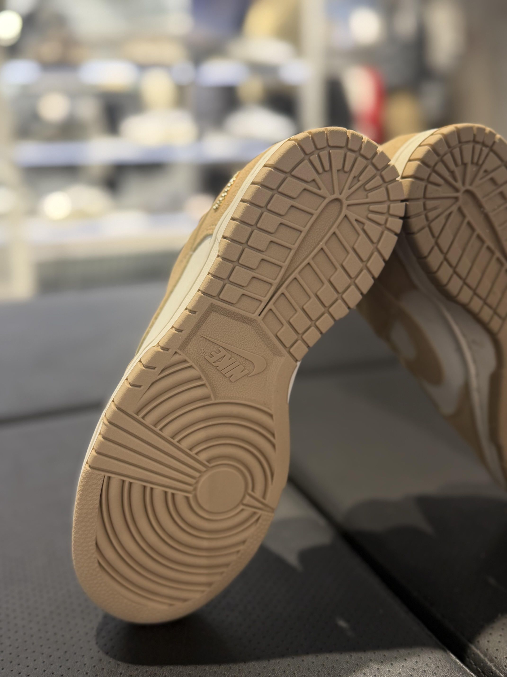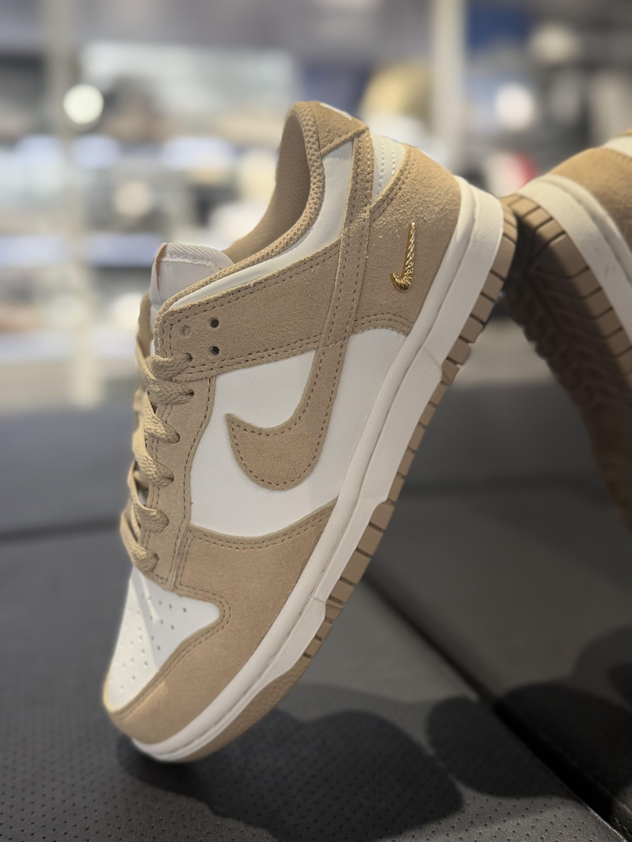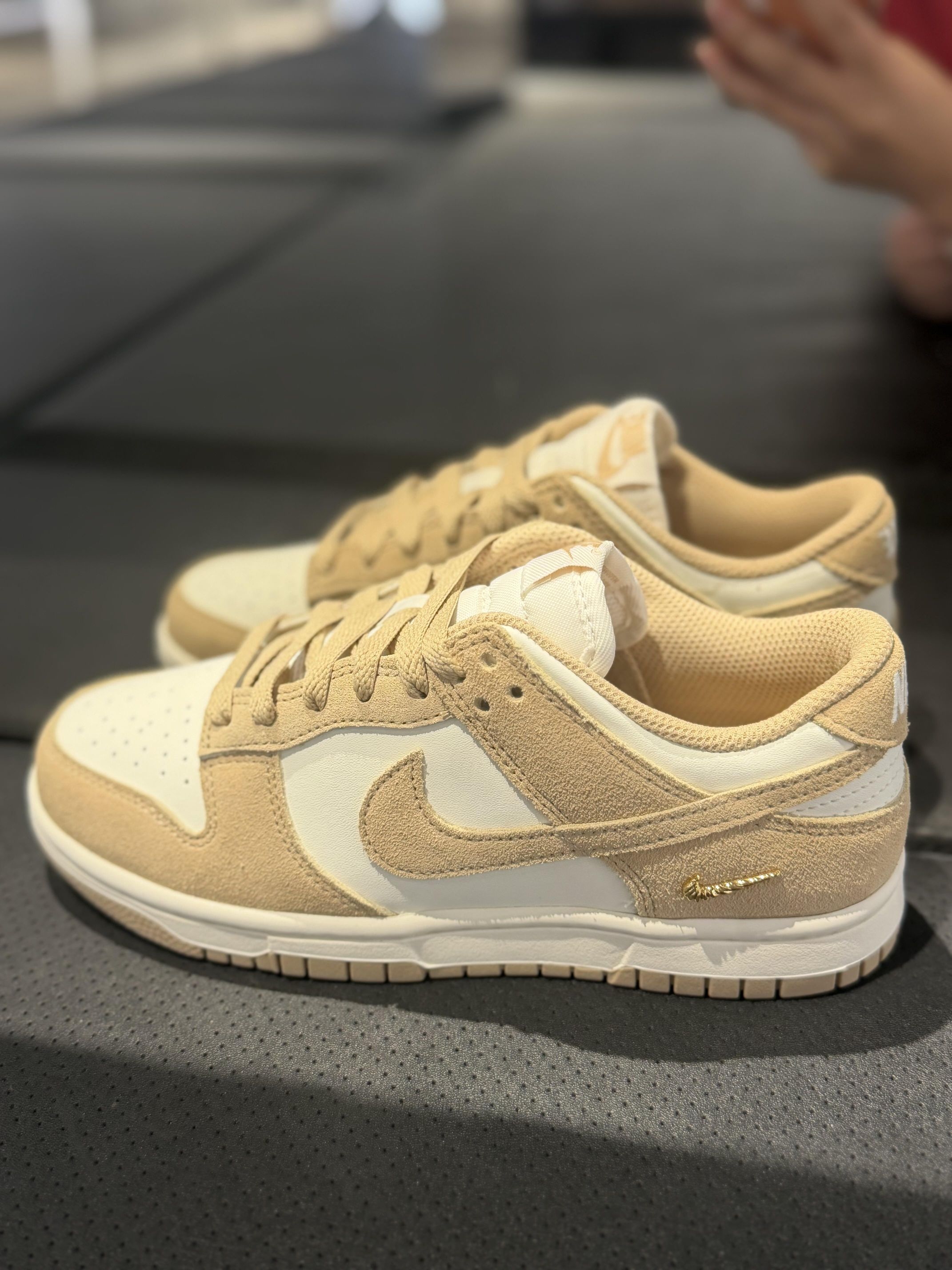 终于蹲到这双Nike Dunk Low奶茶色了😭 浅卡其麂皮拼米白的配色也太温柔了吧 上脚巨显脚小,软乎乎的质感看着就舒服 小金标细节还拉满了精致感,搭牛仔裤、小裙子都贼适配 秋冬穿这双真的氛围感直接拉满✨
