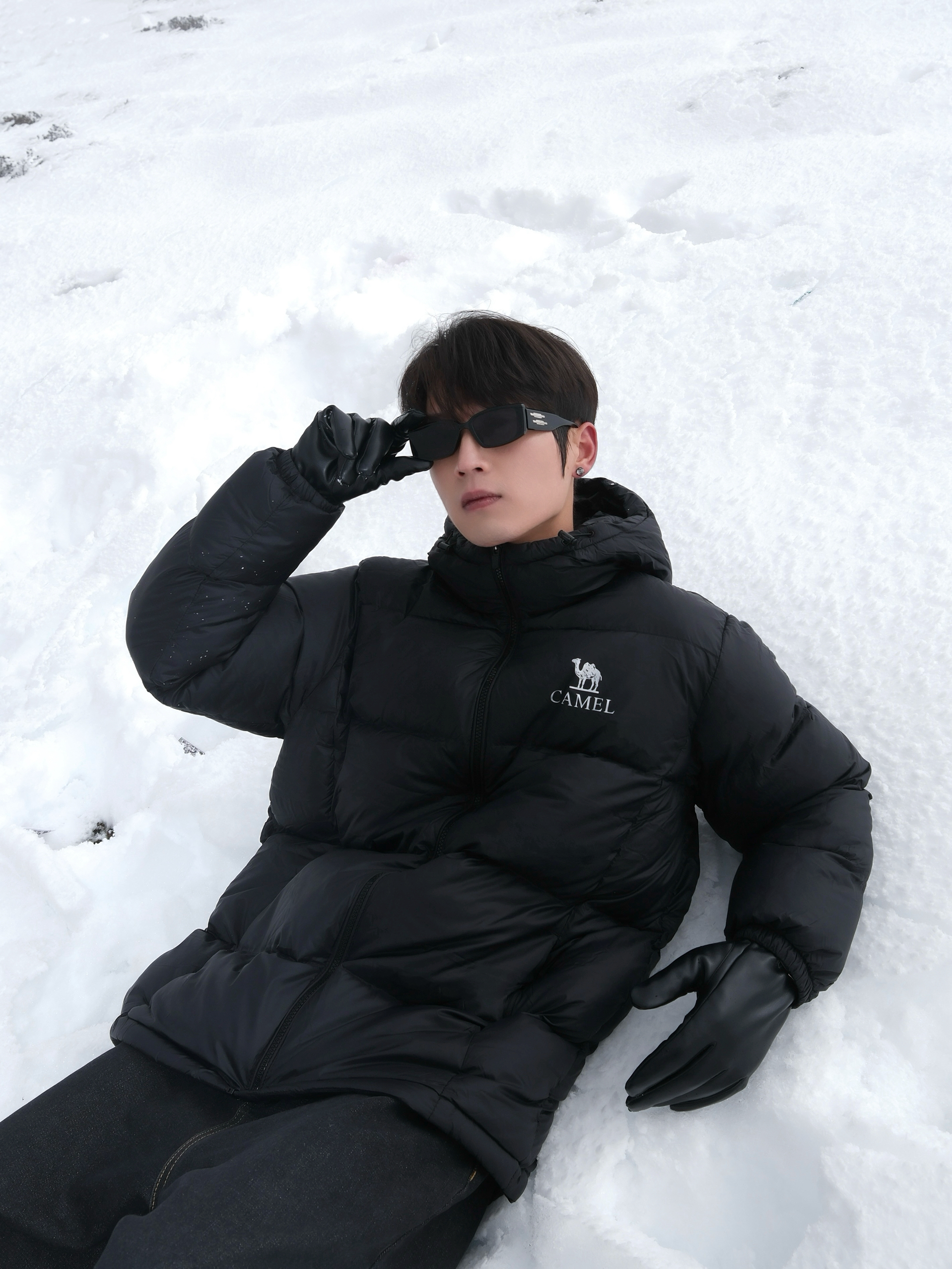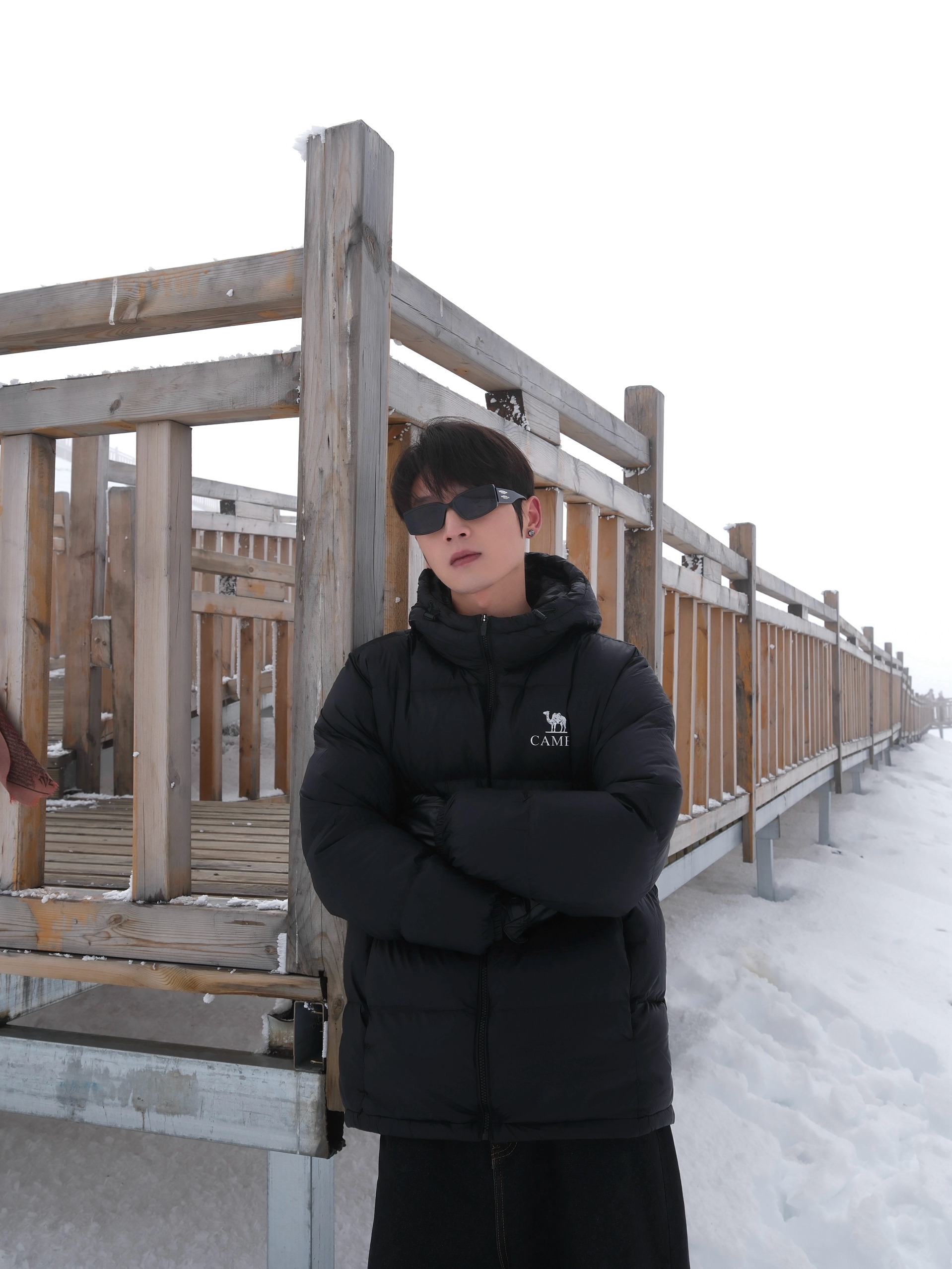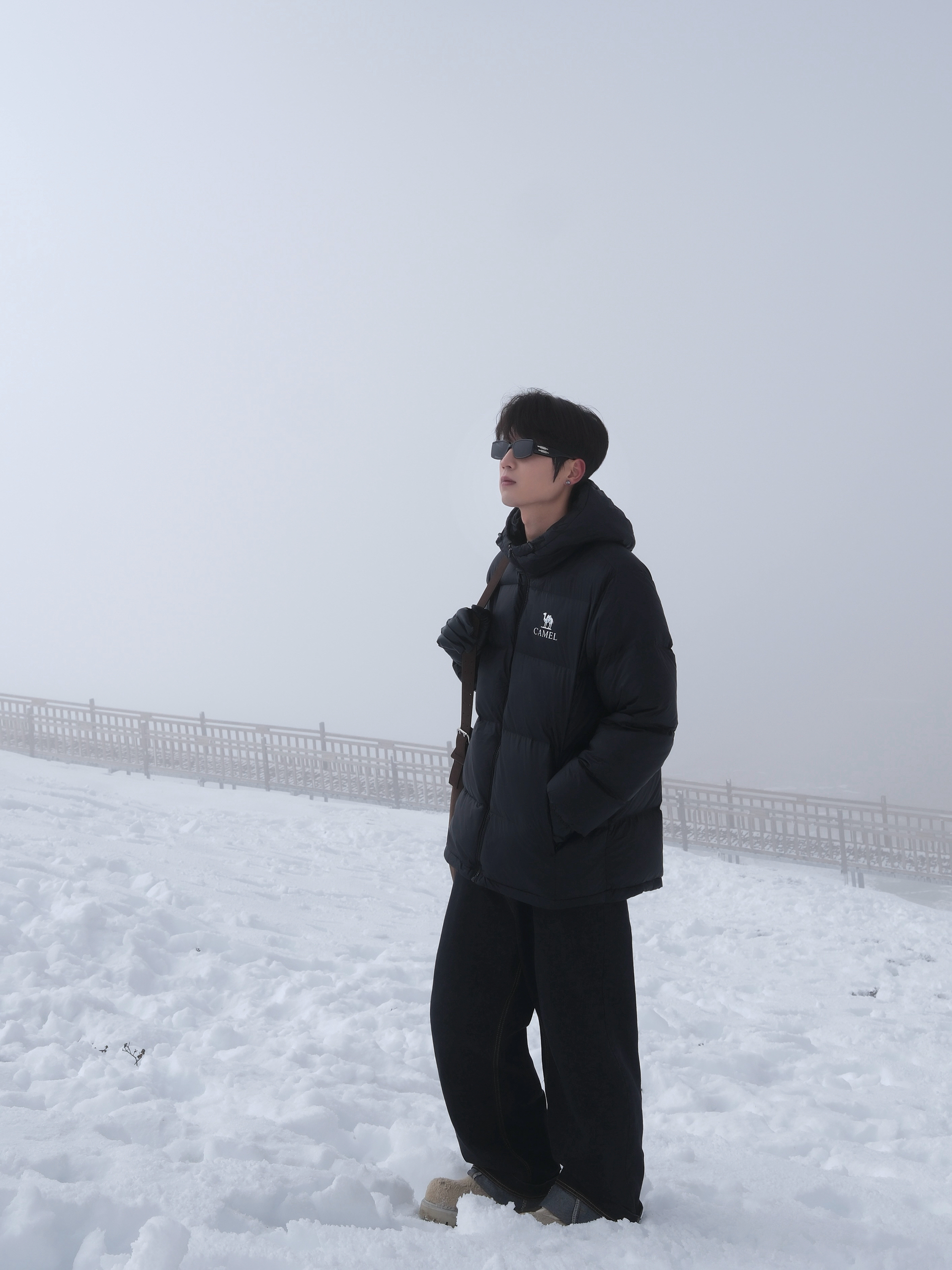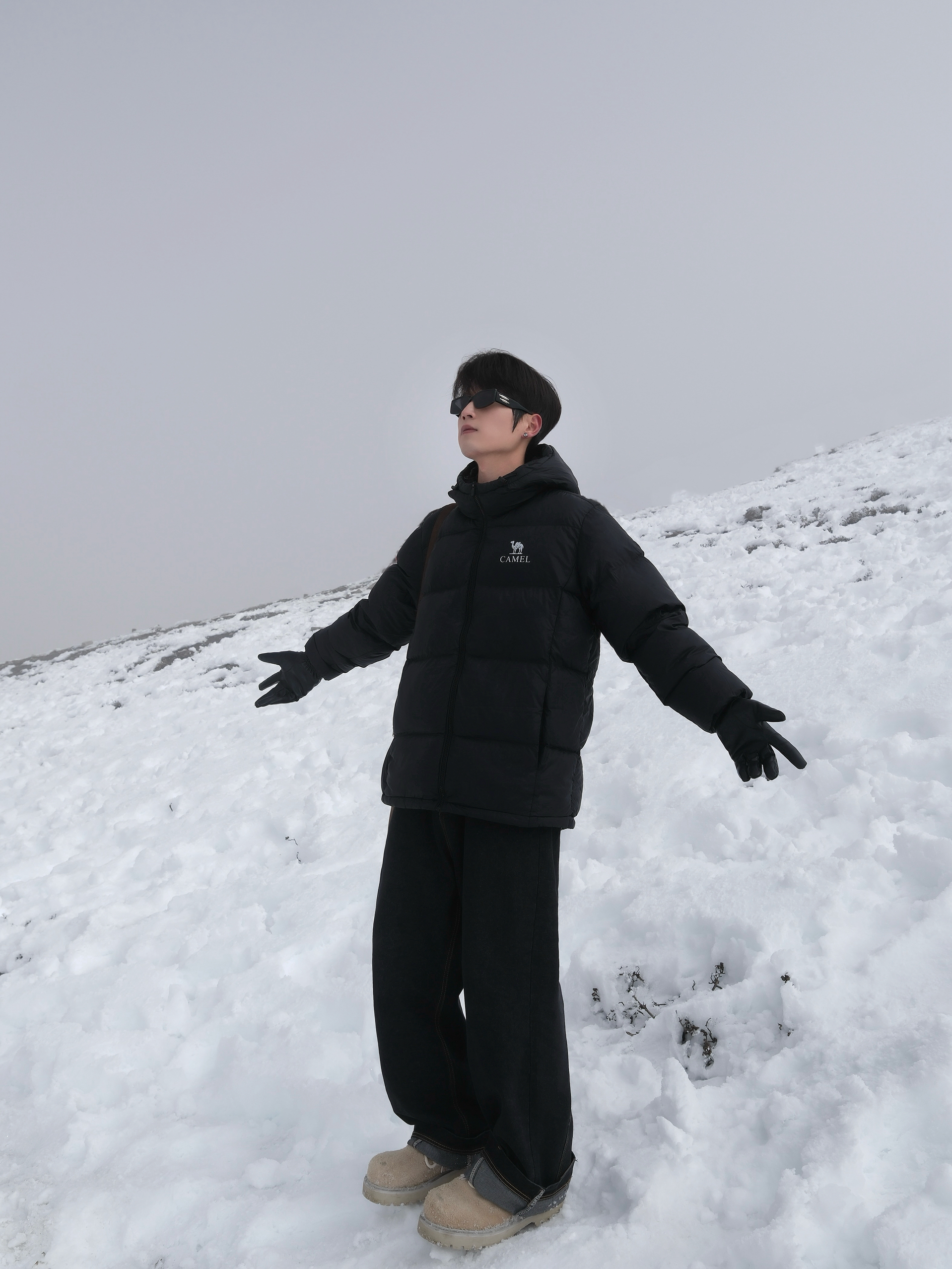 自驾川西 到折多山 没想到下雪了 穿上暖暖的衣服 玩雪也不怕 黑色羽绒服搭配牛仔裤 搭配马丁靴 穿搭酷帅干练