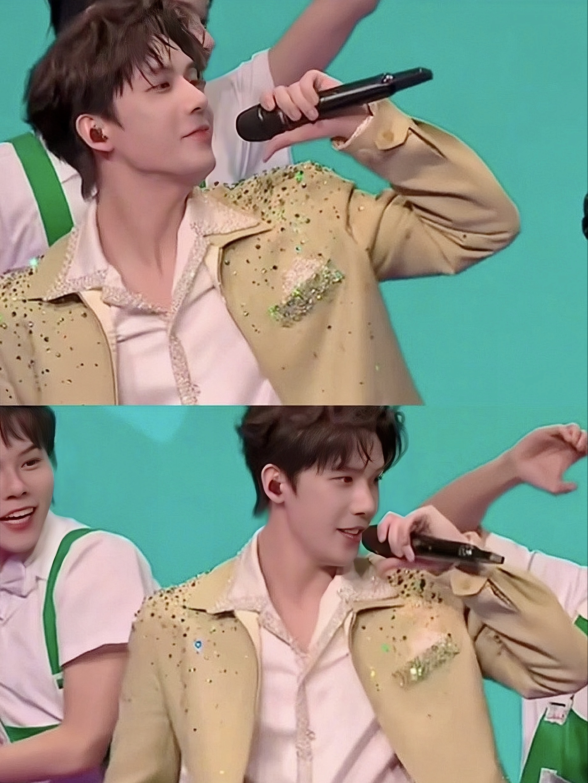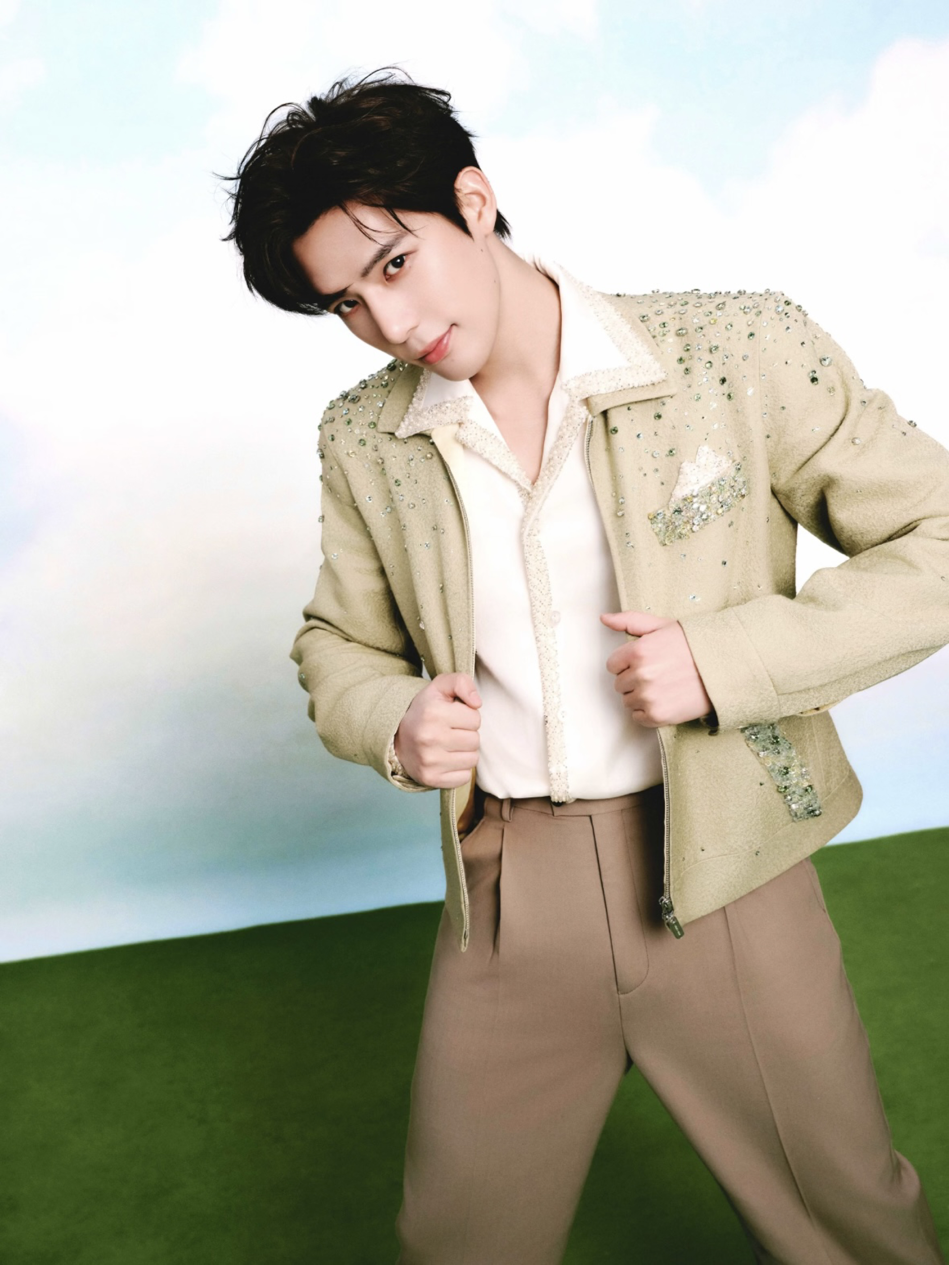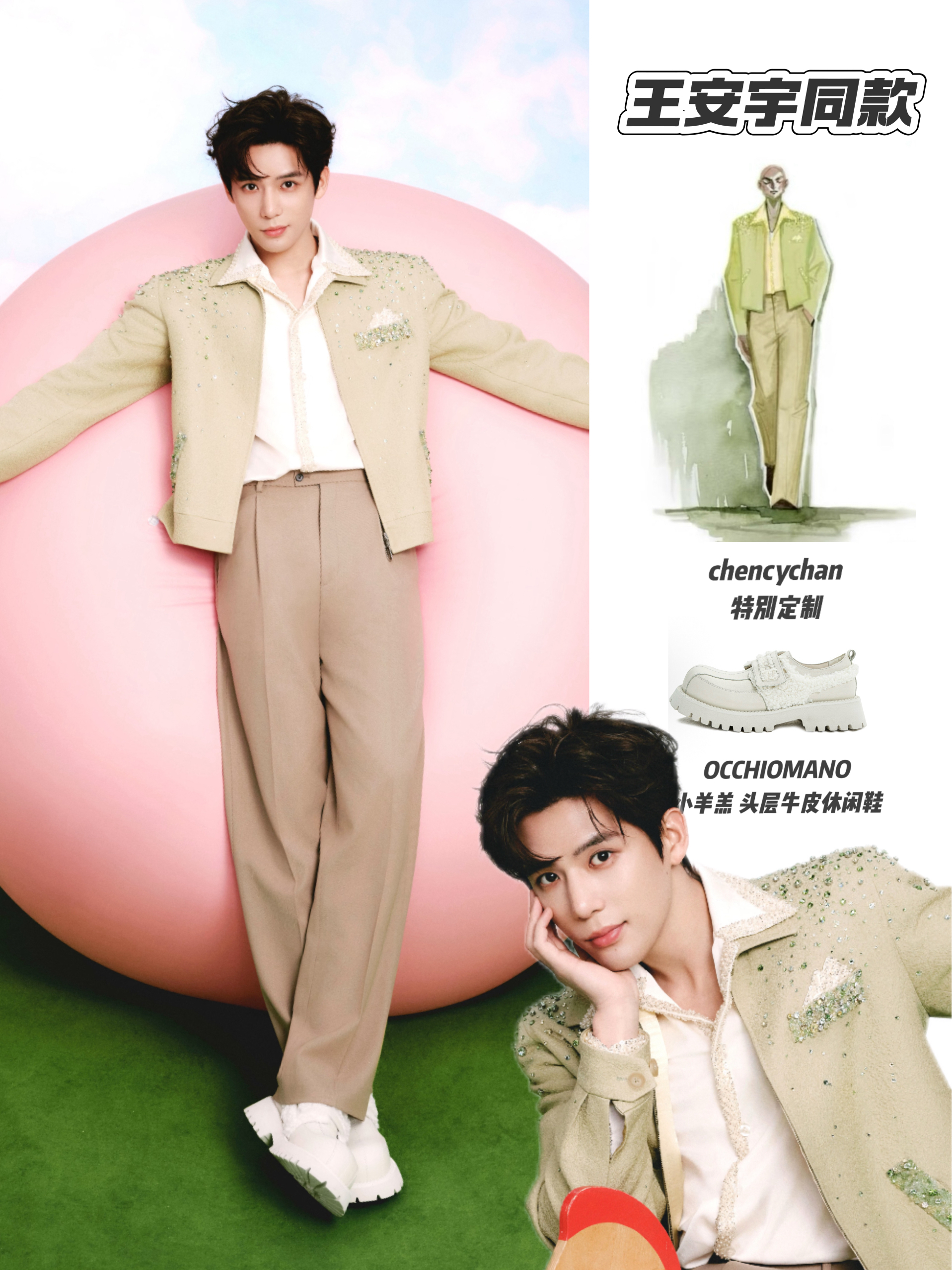 王安宇春晚这套春日贵公子造型太圈粉! 薄荷绿定制外套缀满细闪,搭配卡其色阔腿裤,配色温柔又高级。脚踩小羊羔皮鞋,贵气中透着松弛感。俊朗五官配上慵懒卷发,满屏都是富家少爷的清爽范儿~