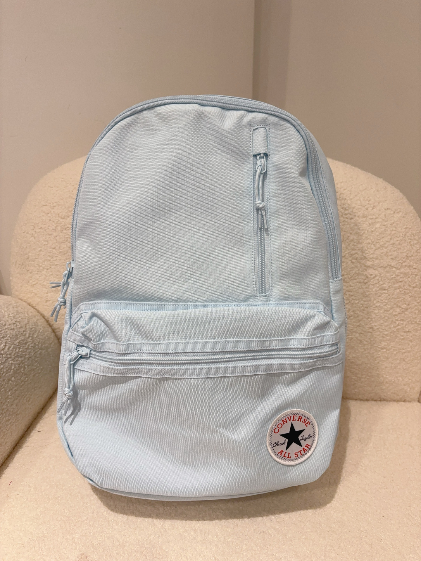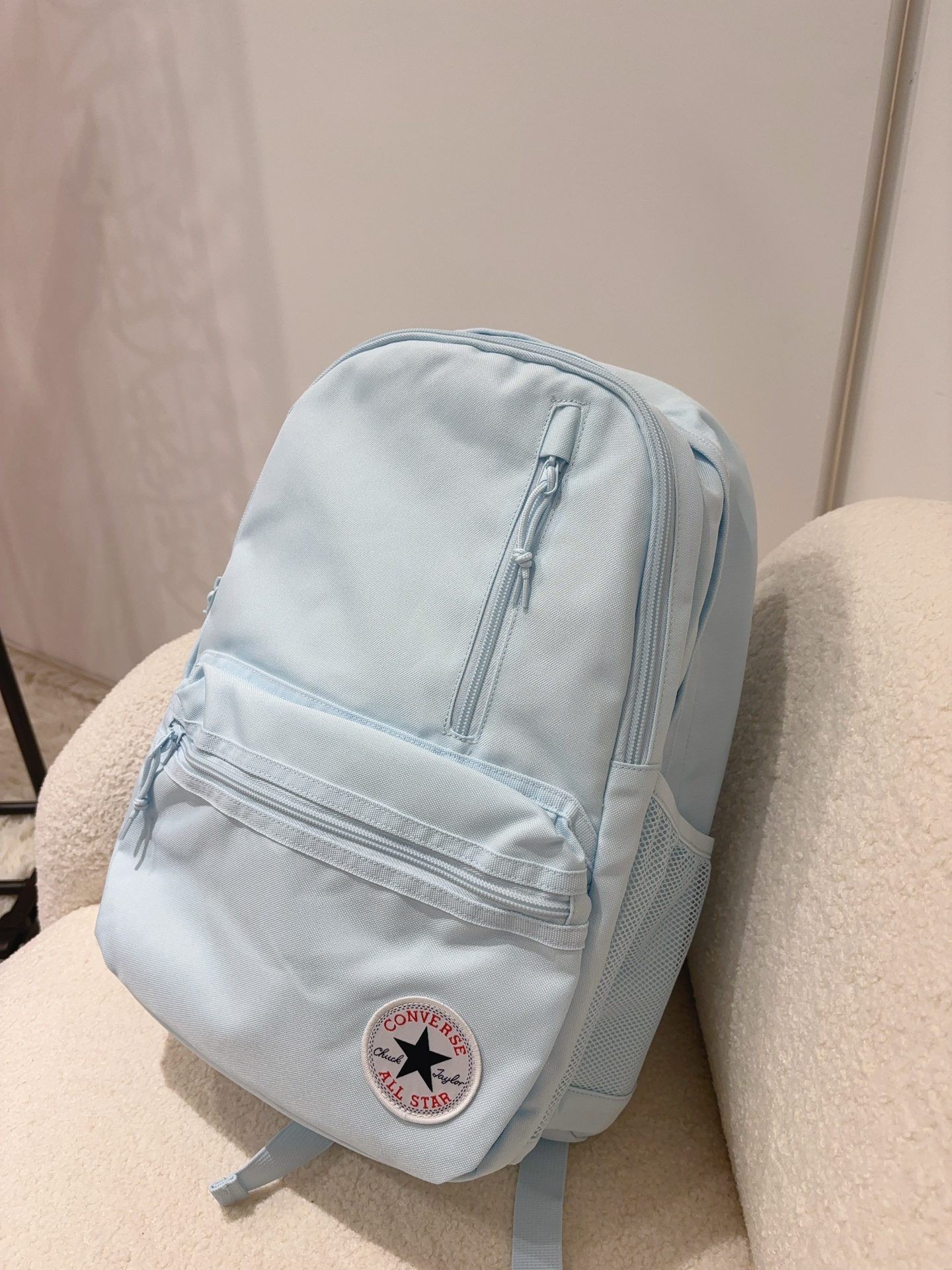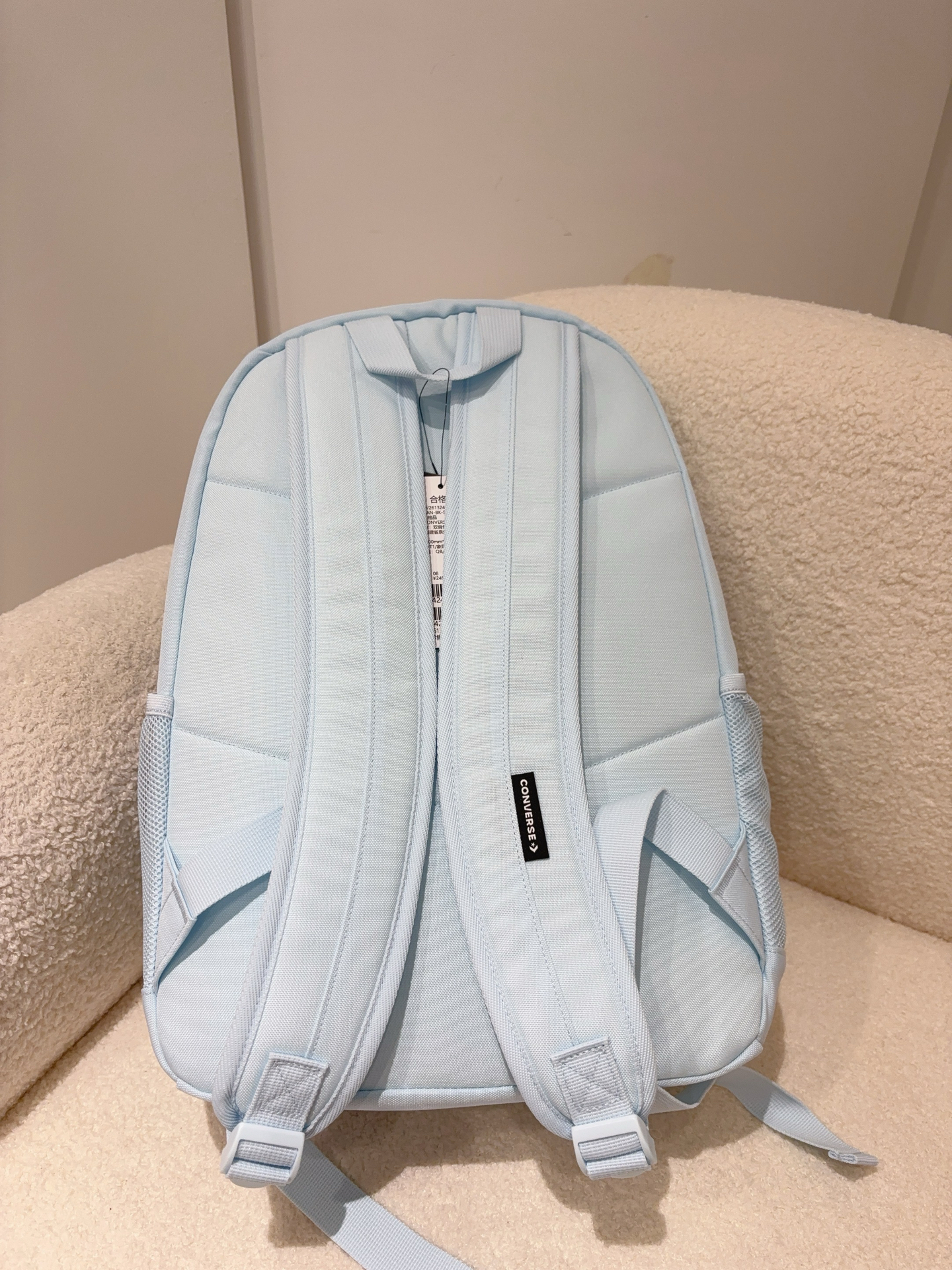 谁懂啊!💙我新入的浅蓝匡威双肩包,奶fufu的配色好戳少女心~出门玩背它超吸睛✨ 容量17L能装不少东西,还有夹层分类放小物件~不过背久了肩带会有点勒,整体还是很爱!🥰 #少女感双肩包 #出游包包分享