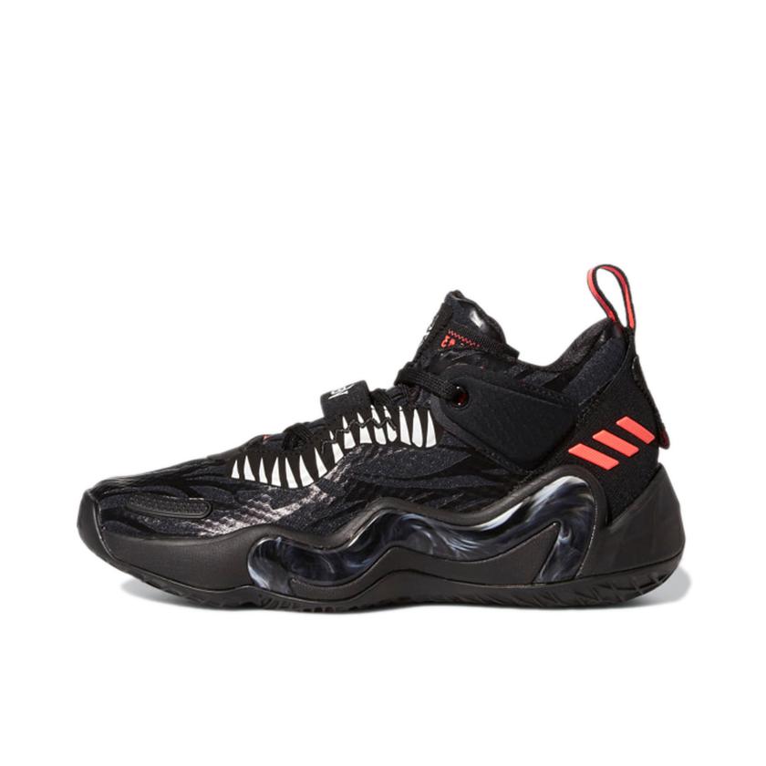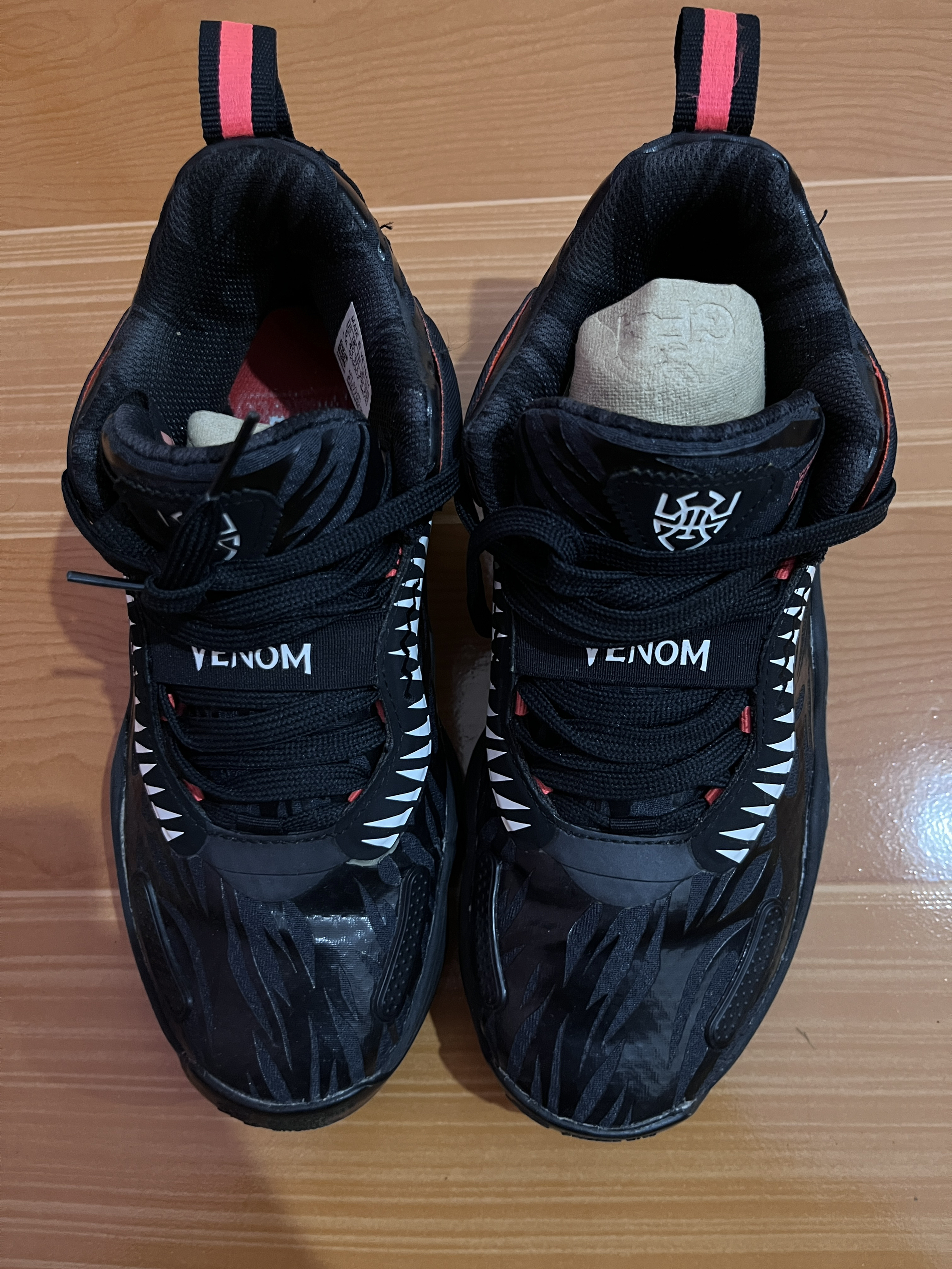 这双是阿迪达斯D.O.N. Issue #3漫威毒液联名款(GZ5495),黑红配色超吸睛,鞋身的毒液纹路和鞋舌上的蜘蛛Logo,把共生体的野性拉满,鞋带扣上的“VENOM”字样直接点明身份。 实战时,中底Lightstrike科技回弹跟得上变向,抓地和包裹都很稳,突破、急停都不拖沓。脚感软弹适中,长时间打球也不累,日常出街也能靠颜值hold住全场。漫威粉和实战党闭眼冲,绝对是球场和街头的吸睛神...