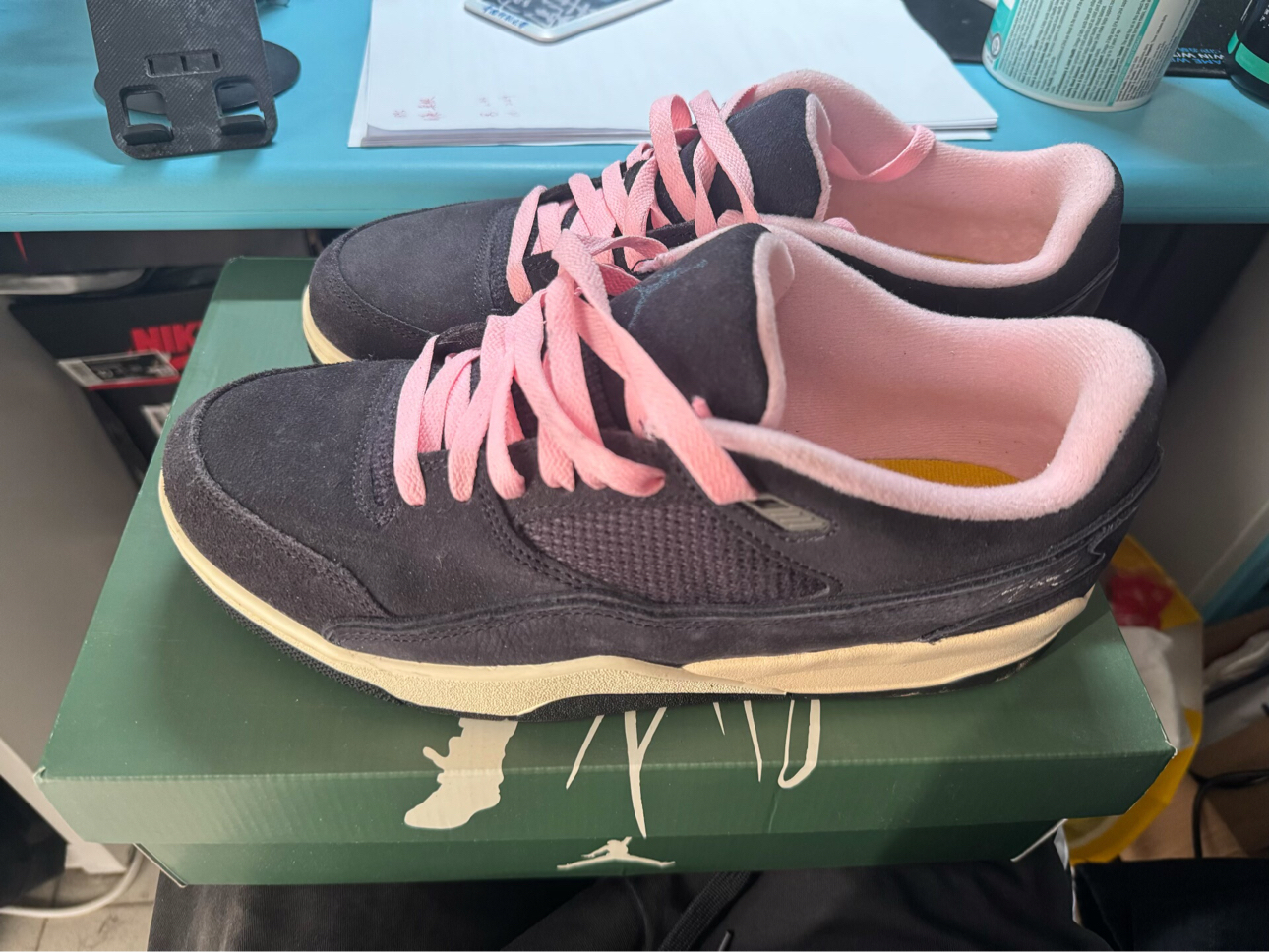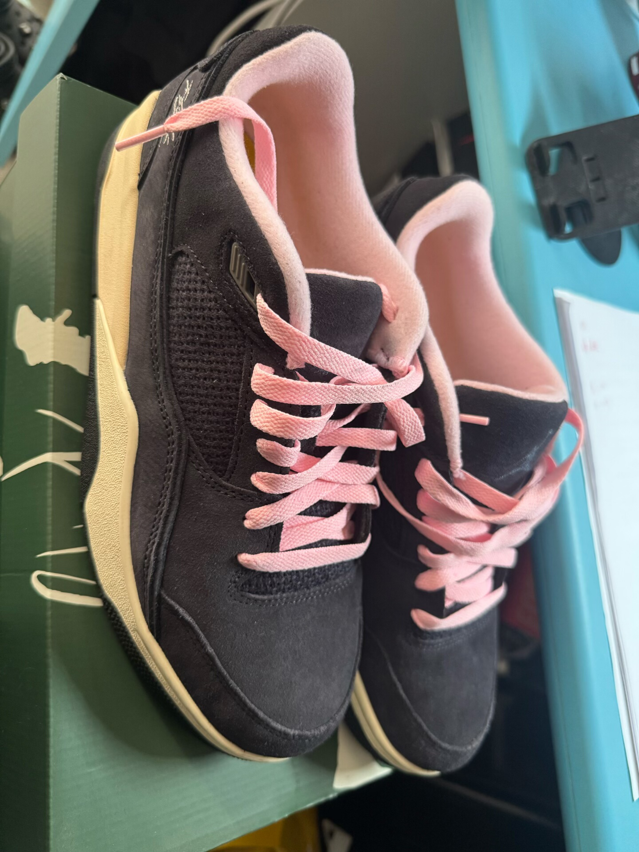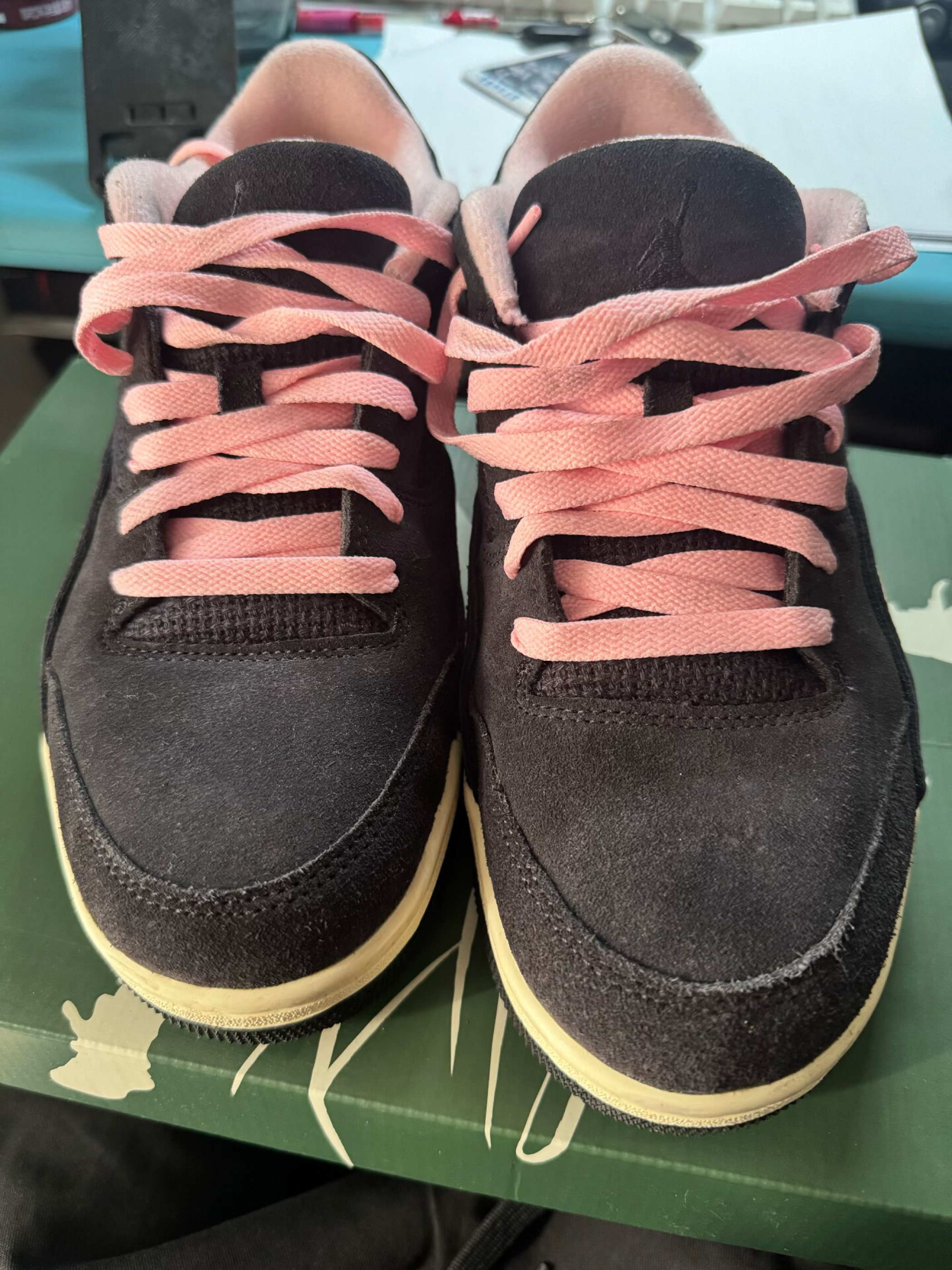谁懂啊家人们!这双Air Jordan 4 RM黑粉配色真的戳中我心巴了💖 黑粉撞色+翻毛皮质感,甜酷风直接拉满,上脚就是行走的氛围感神器! ✨ 颜值暴击|黑粉撞色太会了 • 配色绝了:深灰翻毛皮+粉色鞋带+粉色内衬,低饱和撞色完全不挑皮,甜酷平衡得刚刚好,比纯黑款更有记忆点,比纯粉款更显高级。 • 细节控狂喜:鞋身网眼透气孔+后跟飞人刺绣,翻毛皮质感摸起来超细腻,做旧米白中底自带复古滤镜,每...