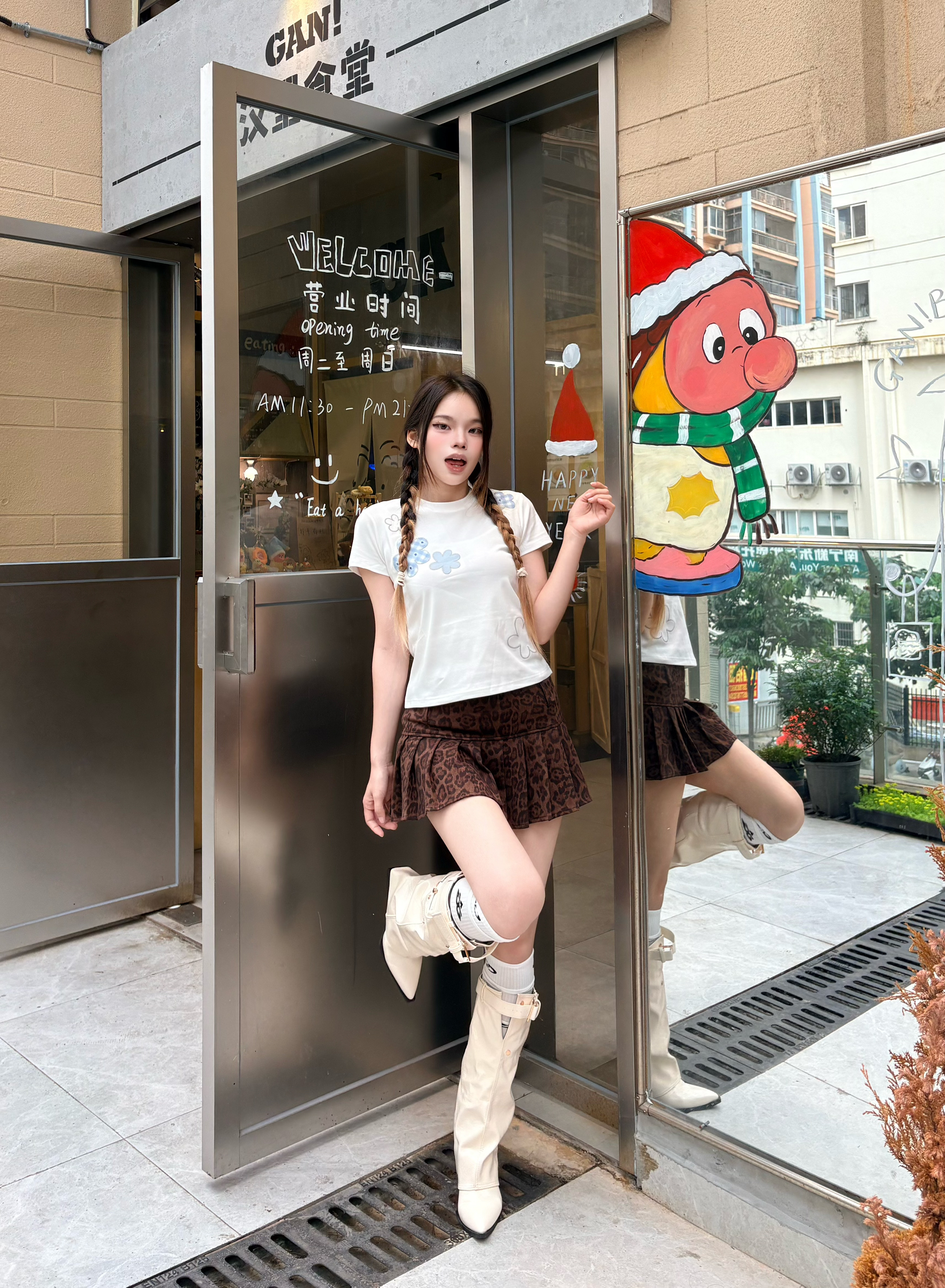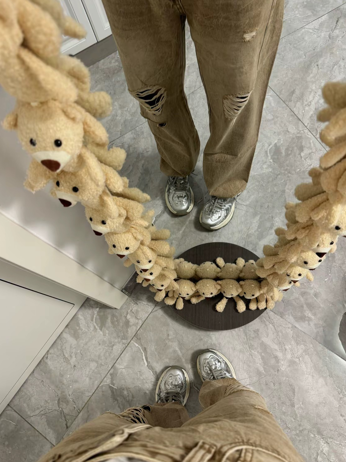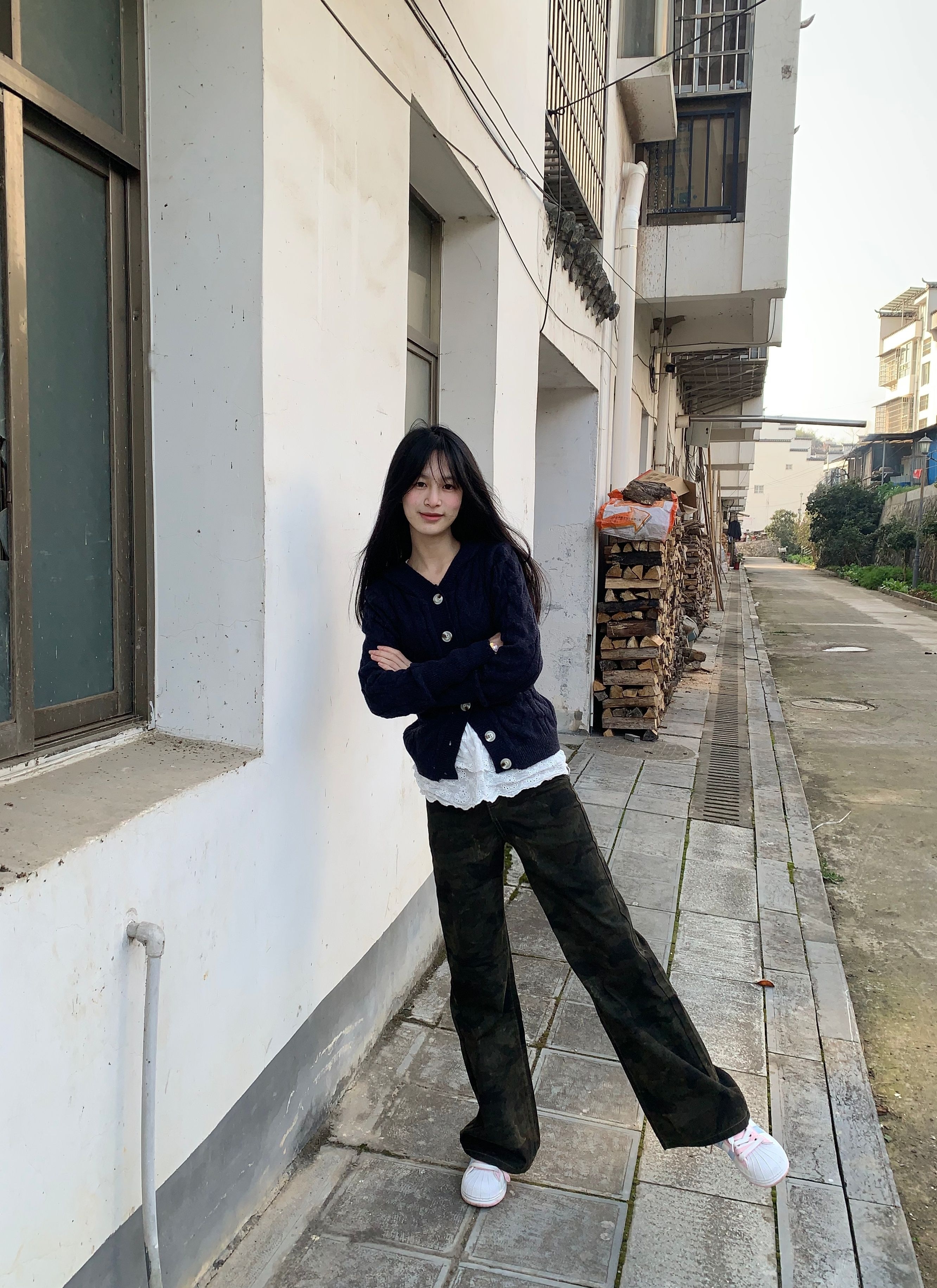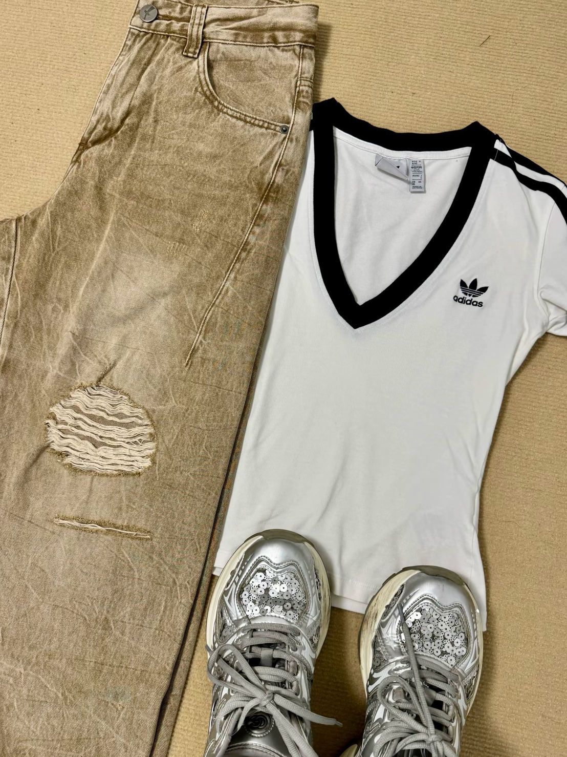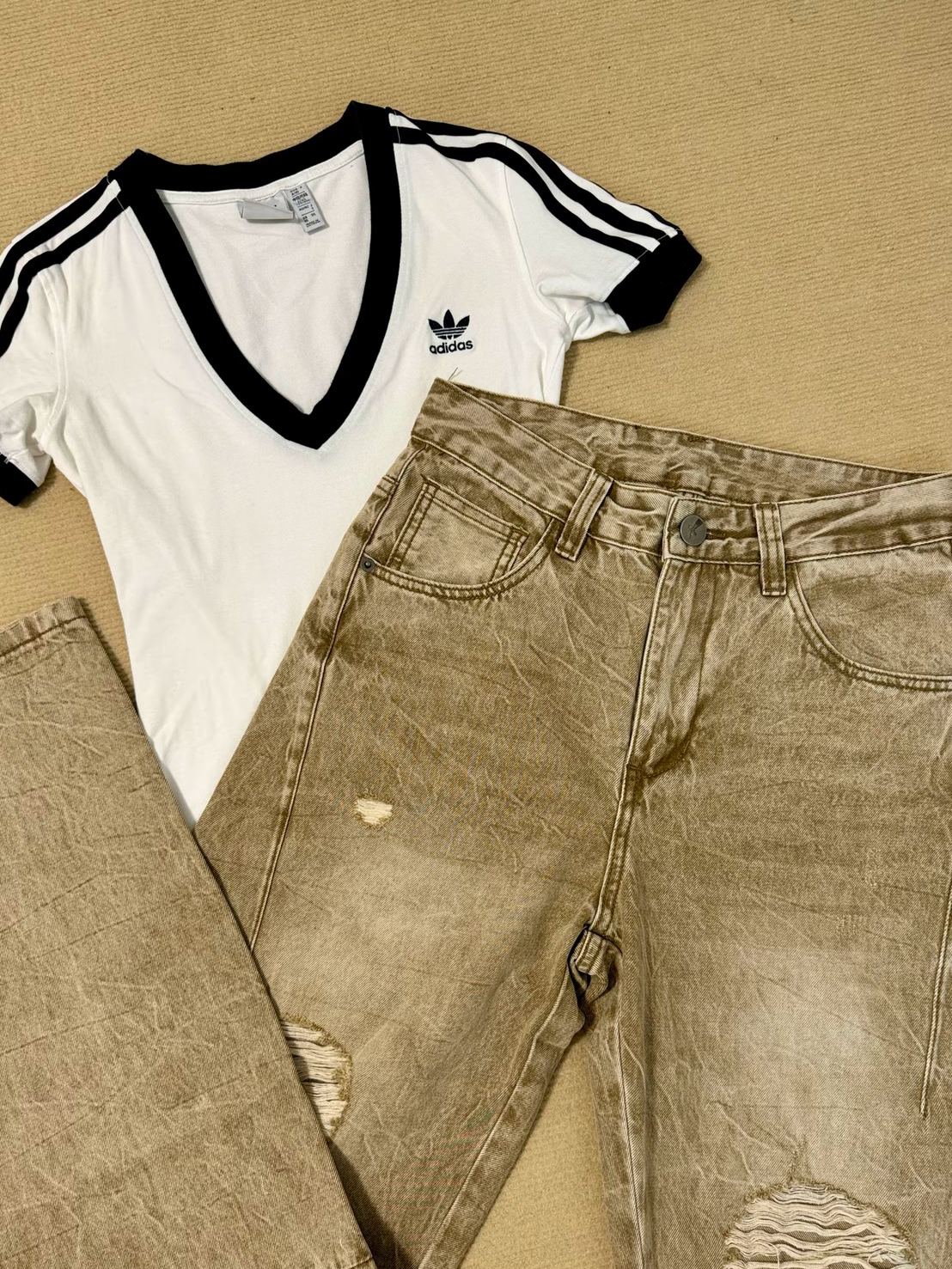 卡其色的破洞牛仔裤搭配阿迪达斯v领修身短袖真的好性感好好看😻 直接把松弛感拿捏住啦❕这一套穿搭主打一个随性又出片💗随便凹造型都很有氛围感☀️假期出游的姐妹可以参考这套穿搭😎舒适又上镜✨