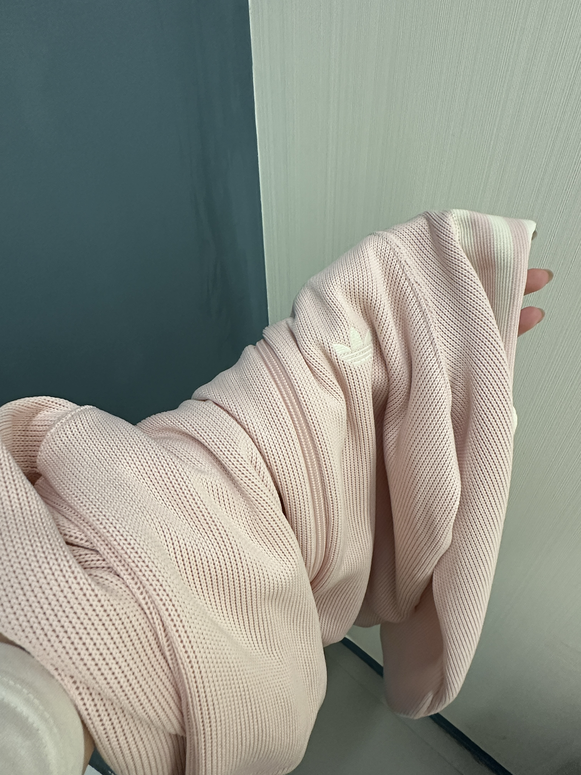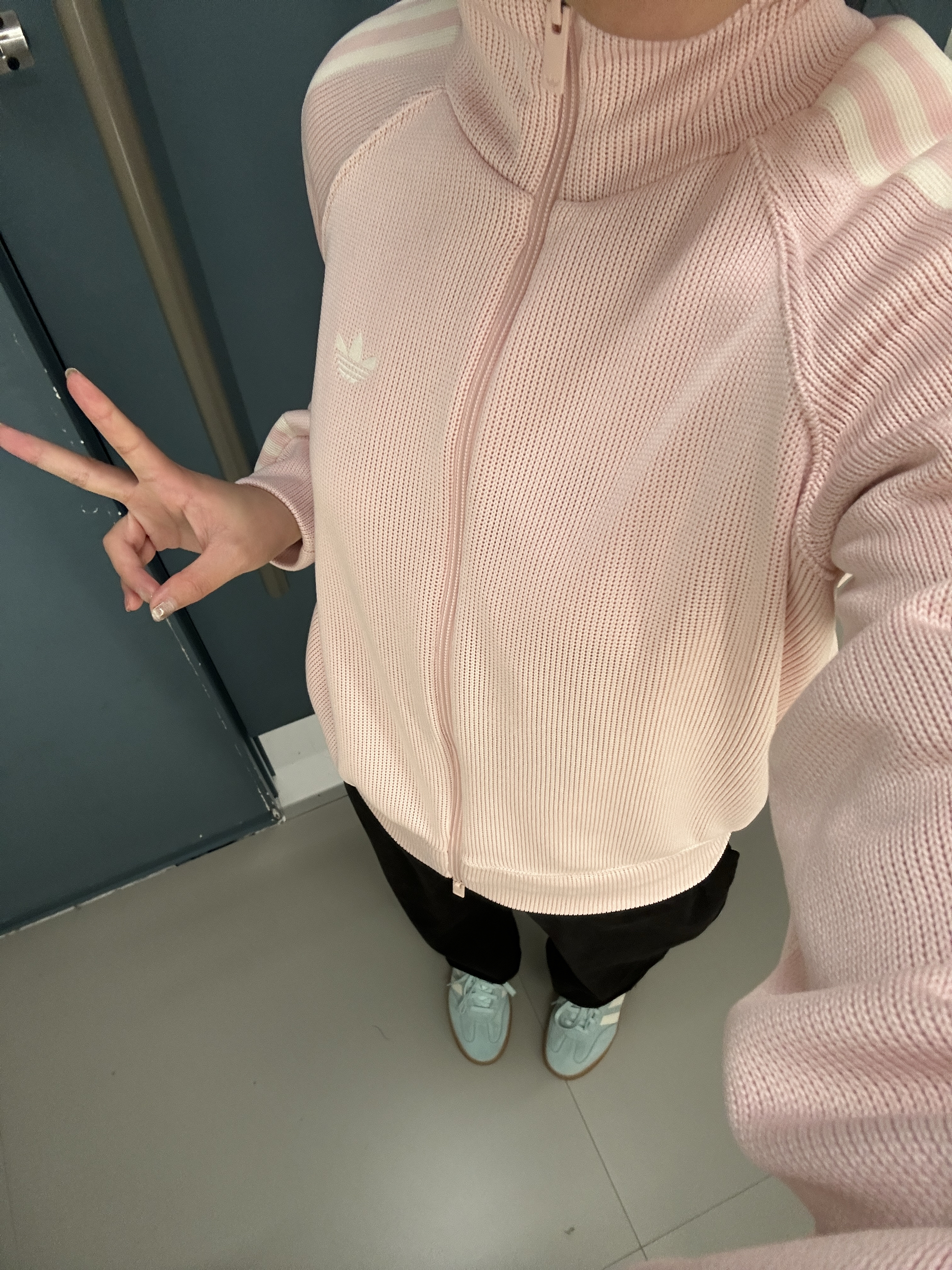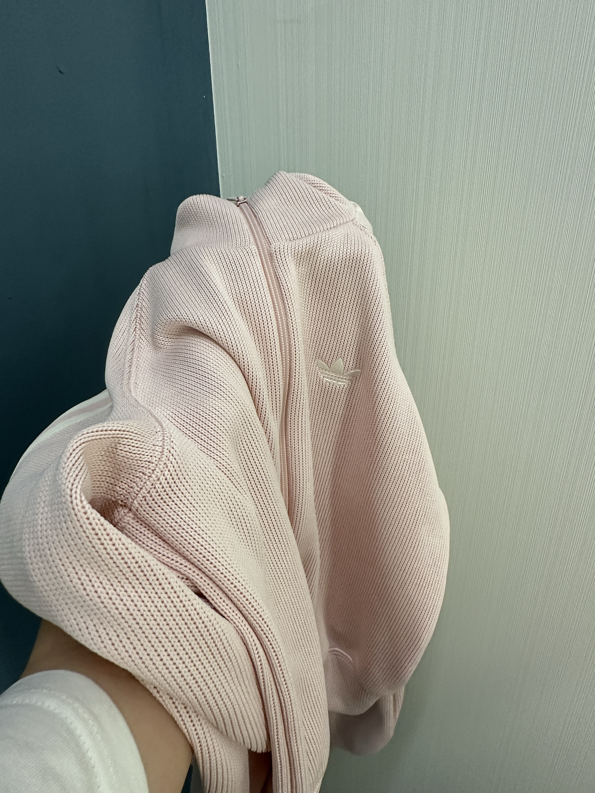 温柔女孩本命!Adidas三叶草粉色针织外套直接戳中我心巴💖 经典的三条杠设计+软糯的针织材质,温柔又显嫩,不管是搭配牛仔裤还是连衣裙都超适配。 面料柔软亲肤,春秋穿也不闷,日常出街或通勤都能hold住,温柔感直接拉满~