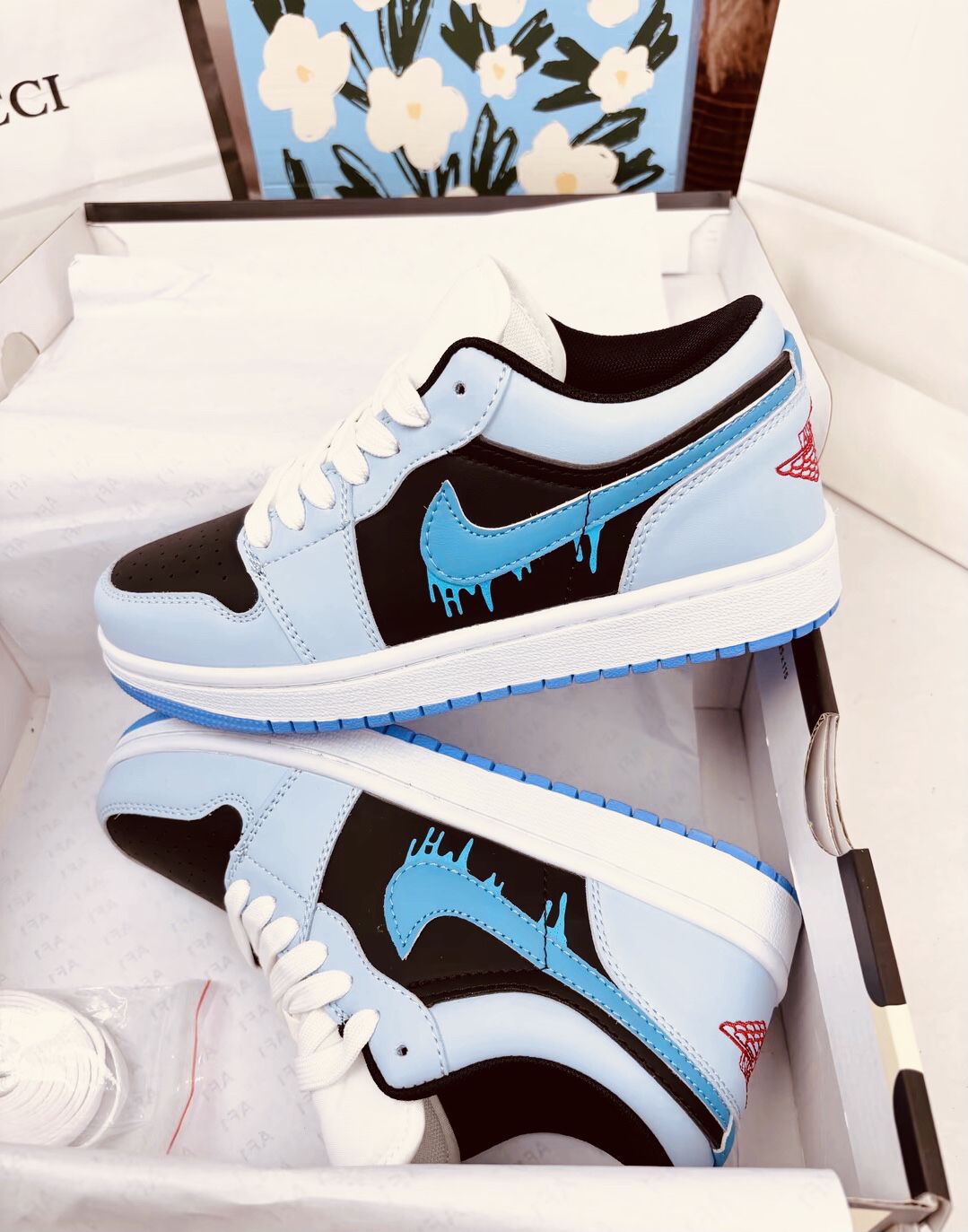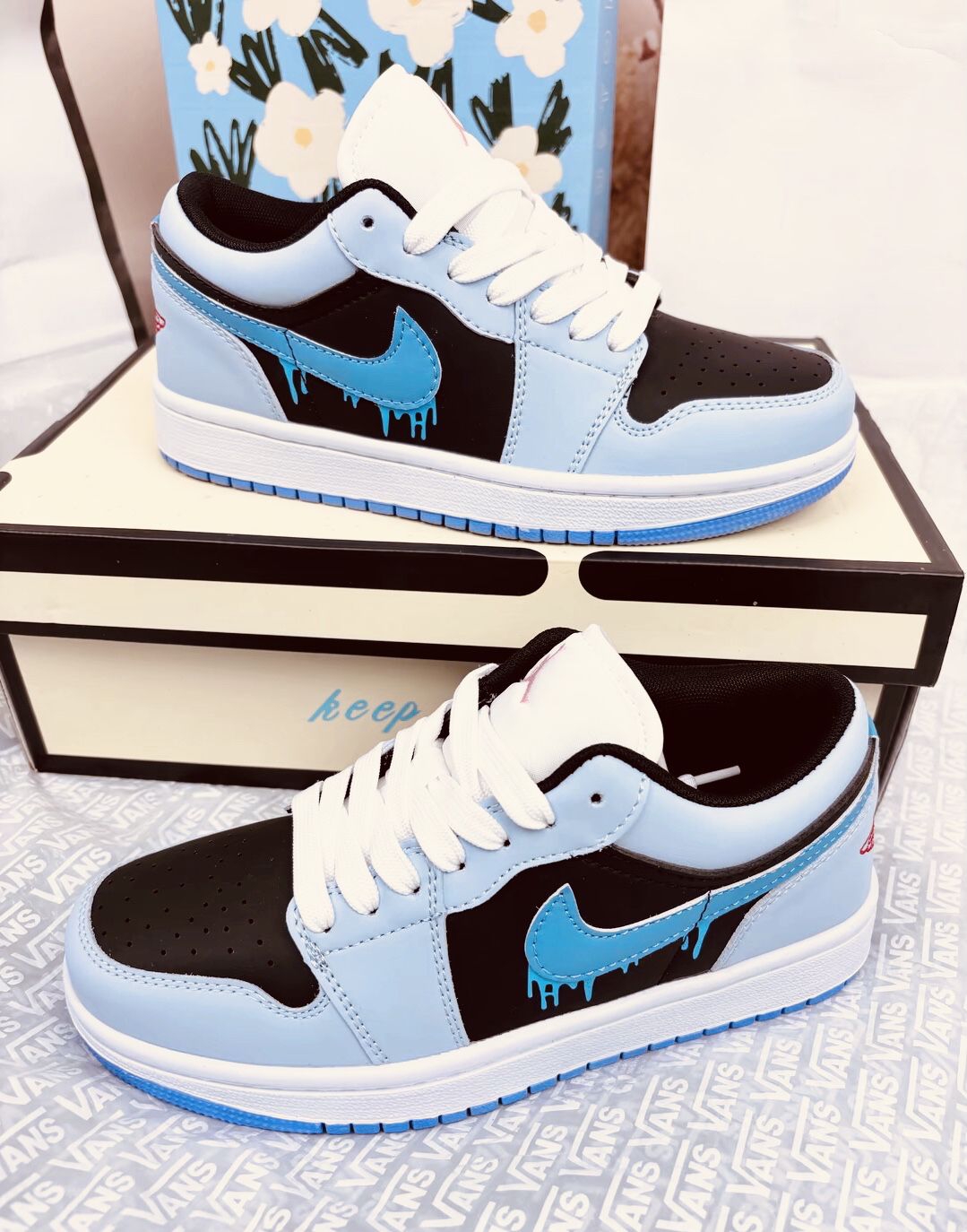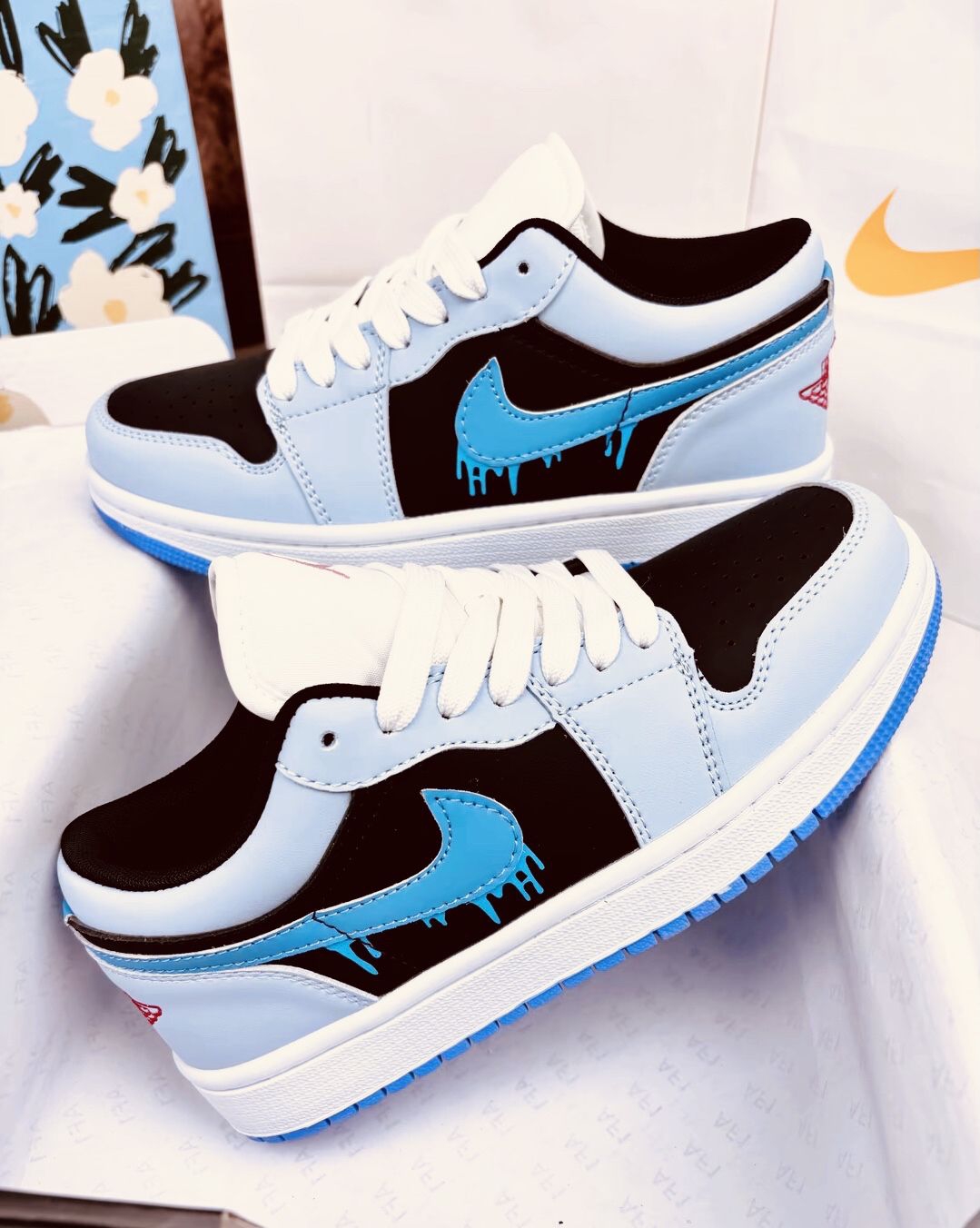 🩵 冰蓝遇上黑调 🩵 冰蓝遇上黑调,再加上标志性的融化 Swoosh,这双 AJ1 Low 就像把夏日冰饮穿在了脚上。清新配色自带降温感,走在街上回头率直接拉满,是甜酷女孩和潮流男孩都拒绝不了的夏日限定心动。 要不要我再帮你写一个更适合发朋友圈的短句版本?#AJ1冰蓝海盐 #Nikedunk白蓝