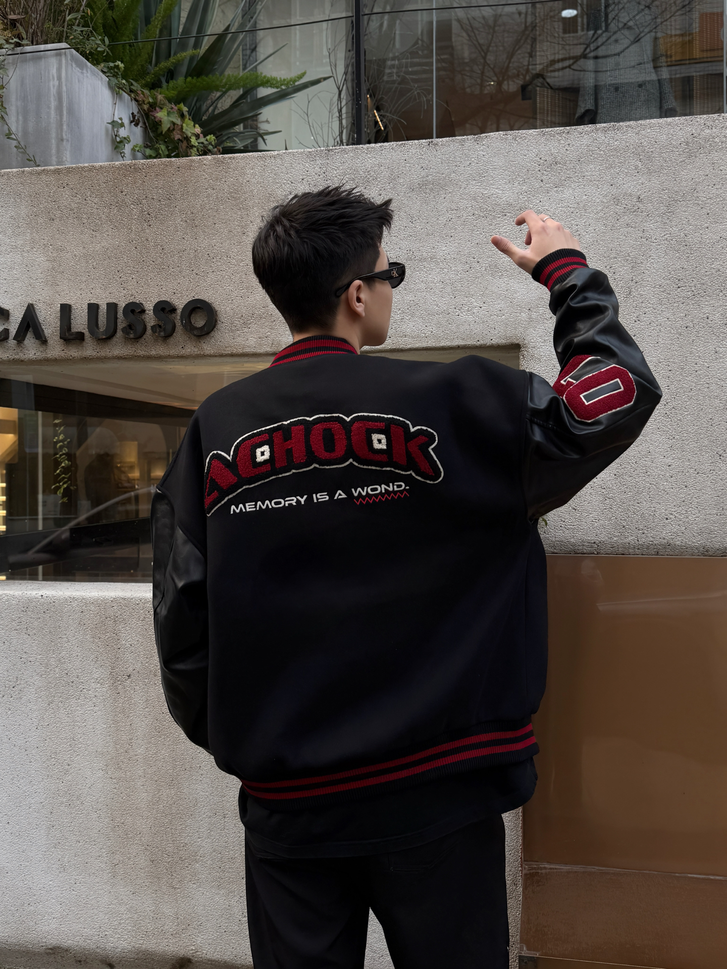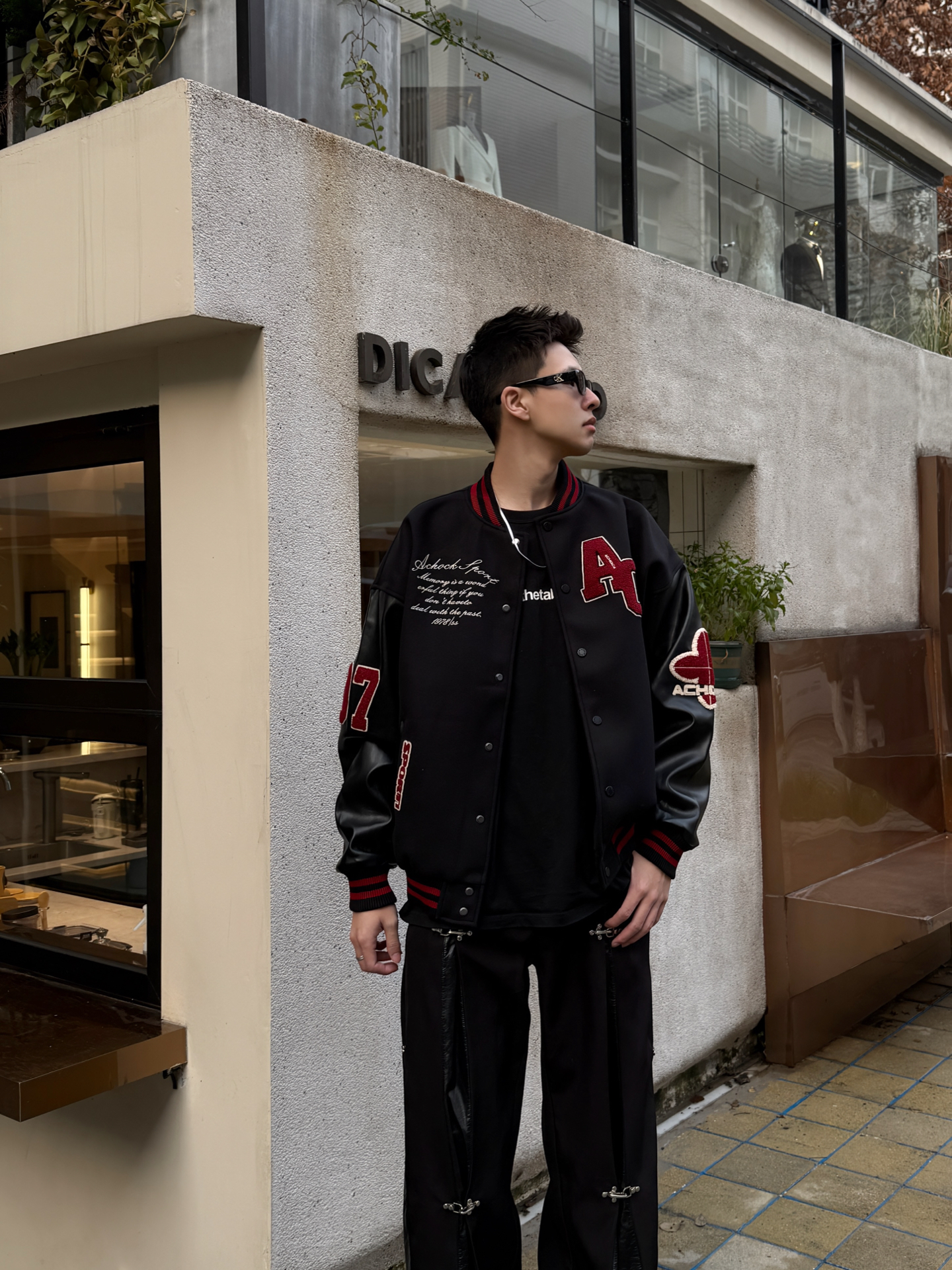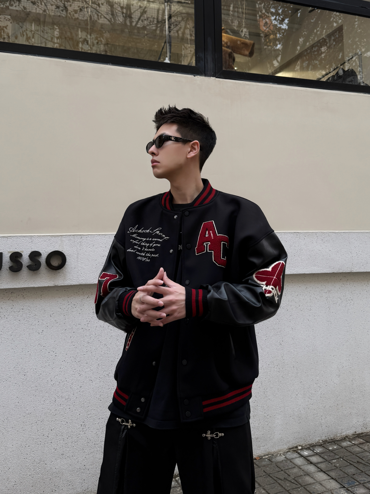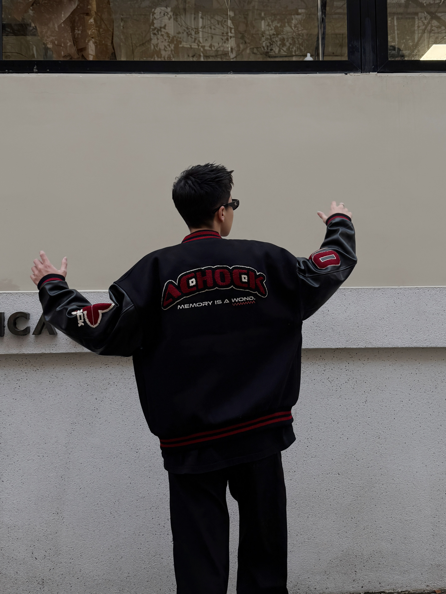 开春想穿得复古又吸睛?这件A chock美式复古棒球服直接把氛围感整明白了! 黑红撞色拼接自带复古张力,皮质袖管与毛呢衣身碰撞出硬核质感,胸前“AC”字母刺绣与背后“ACHOCK”印花自带腔调,打破了传统棒球服的单调感,在低调中透着吸睛气场。 宽松落肩版型对各种身材都超友好,藏肉又随性,重磅面料软而挺括,开春应对微凉天气也很安心。搭配全黑机能工装裤,利落的线条感弱化腿部线条,再踩一双复古板鞋,整...