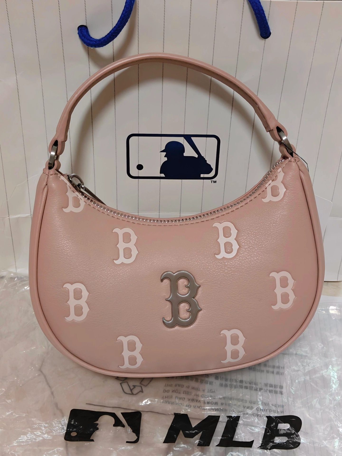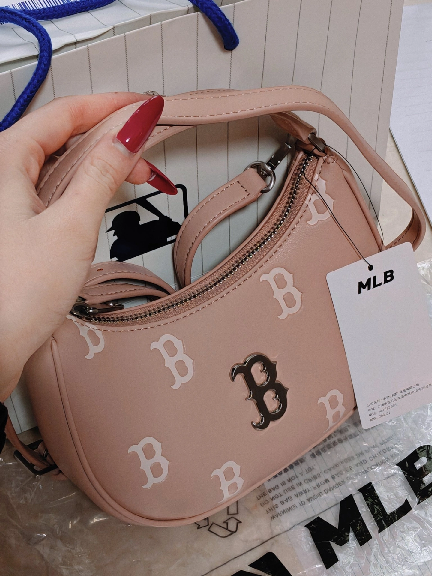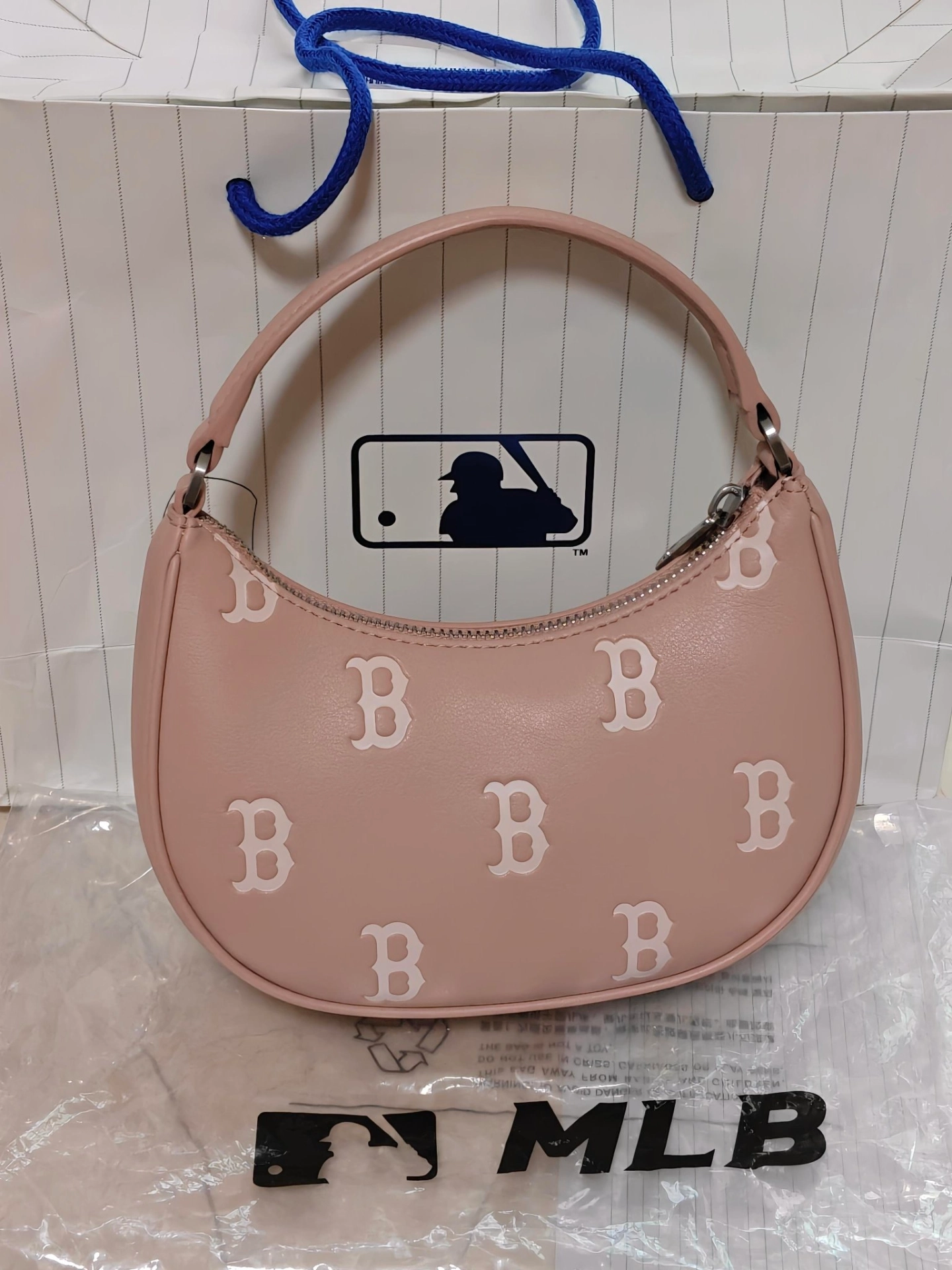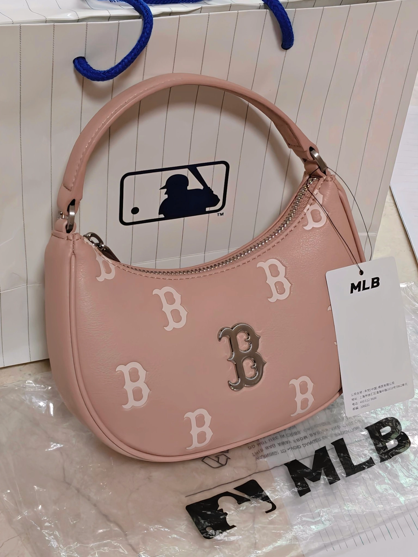 MLB新款包包来啦~谁能拒绝一只把“温柔大小姐”写在脸上的小包包!我个人呢喜欢手提!小小一个超级萌~💗(⚠️实际包包比图片更粉嫩!) 这款MLB的粉嫩腋下包,一上手就戳中少女心💘。低饱和的裸粉色自带柔光滤镜,黄皮姐妹也能轻松驾驭,显白效果直接拉满。(可见第四张图片~✨) 包身小巧精致,是当下最火的“迷你感”,刚好放下口红、粉饼和手机,出门约会、下午茶都超合适。满印的B字老花搭配金属B标,把千金...