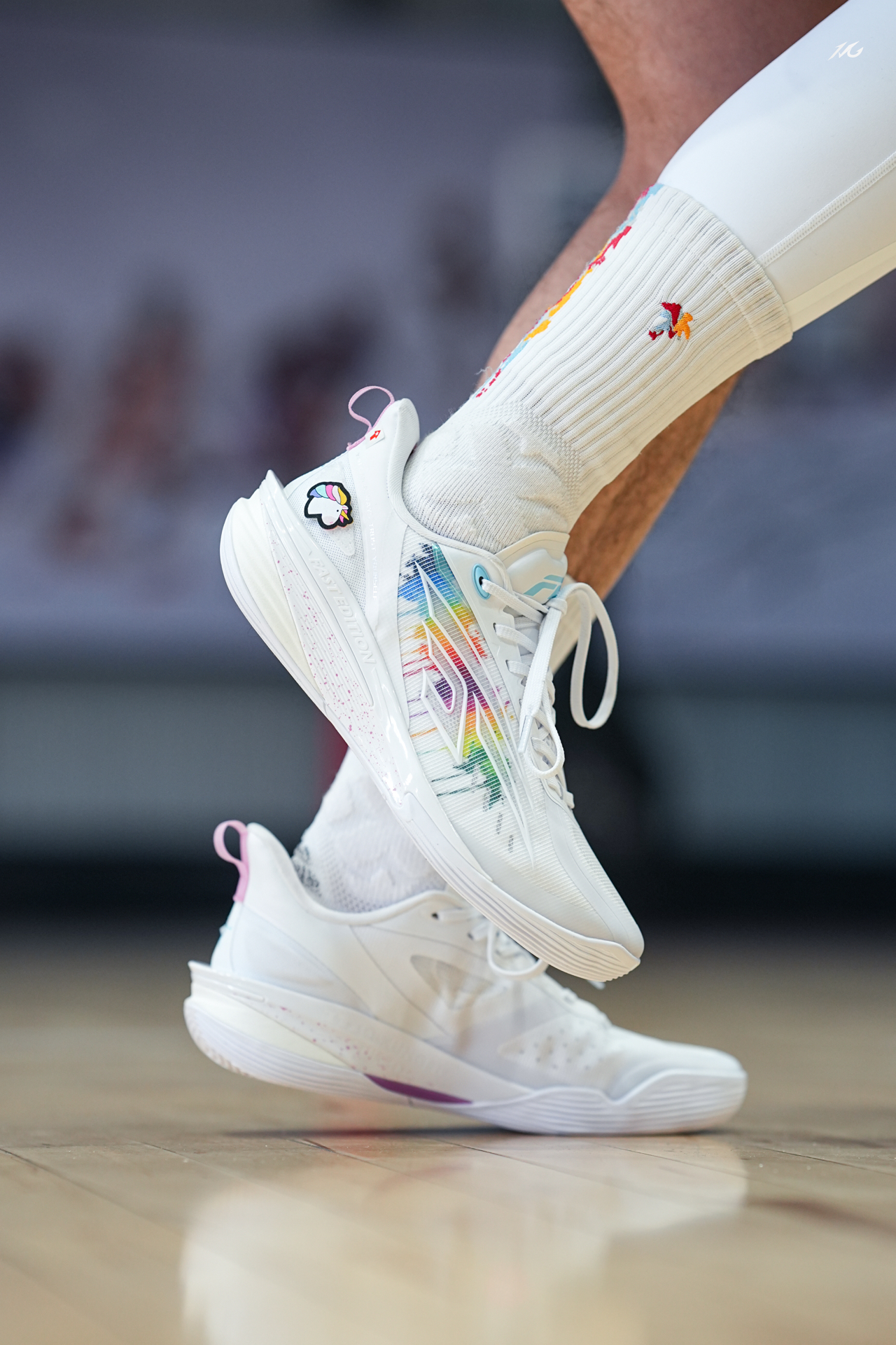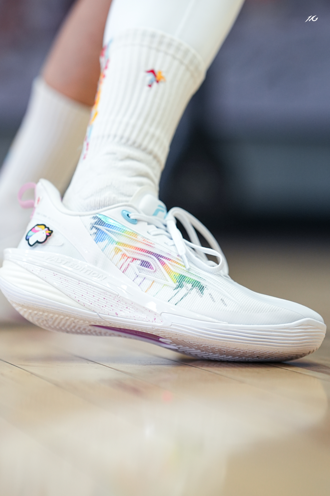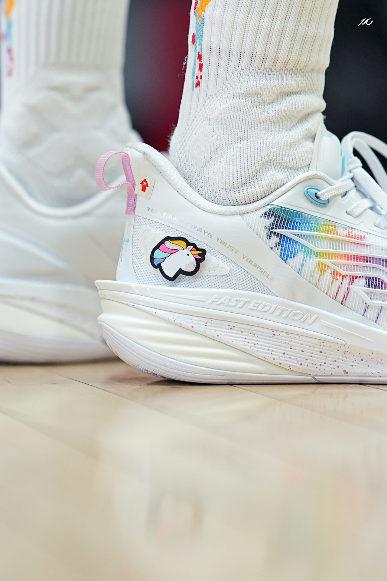中乔这个FE系列我也算从一代到这个最新的四代都体验过了(真是转眼四年就过去了😭)! 先说四代这个彩虹小白马配色,上脚还是我喜欢白净中带点阳光感!尤其两只脚还用了魔术贴的形式粘了小马和彩虹,很可爱,打球的时候谁给我踩掉我肯定拼命! 其次说下上脚初体验,中底也是用上了一体成型工艺,将TPU片夹在了缓震材料中间就没啥割裂感,脚感轻弹感还不错! 脚型适配兼容性还行,微宽也可以穿的!具体长测过后再来报告! ...