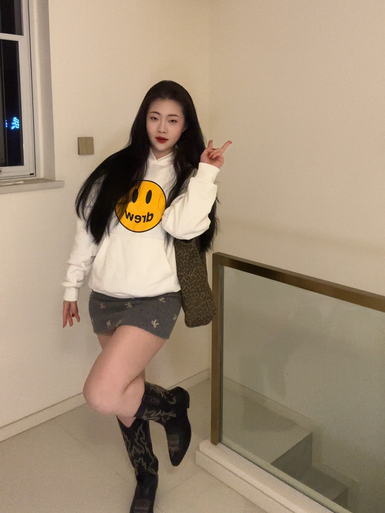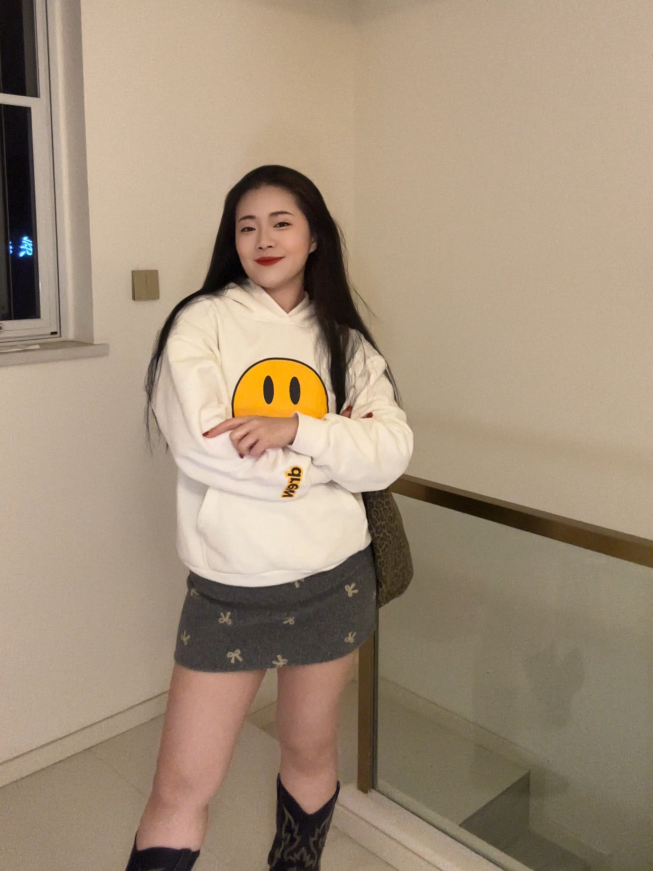 怕冷又想穿得甜酷?这套 drew 笑脸卫衣 + 短裙穿搭直接封神! 白色连帽卫衣自带减龄 buff,oversize 版型藏肉又随性,胸口的黄色笑脸印花超吸睛,搭配灰色蝴蝶结短裙,中和了卫衣的休闲感,甜酷平衡得刚刚好。中筒靴拉长腿部线条,微胖姐妹也能穿出直角肩 + 大长腿既视感,日常出街或约会都超合适~ 你们觉得这套甜酷风怎么样?关注我,下期出更多微胖显瘦穿搭技巧!
