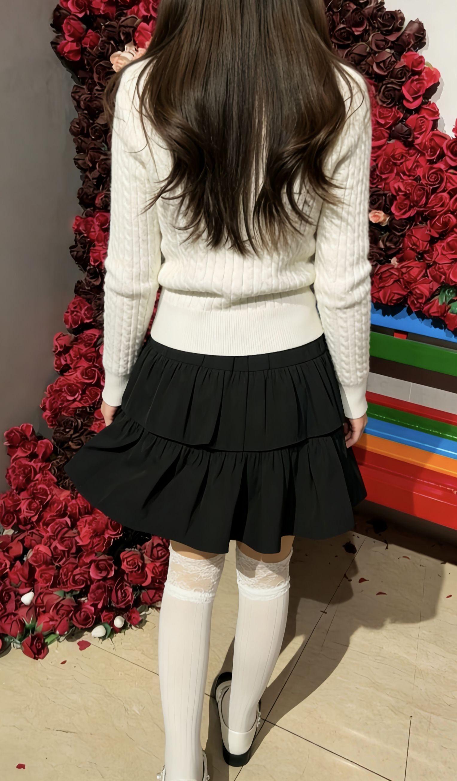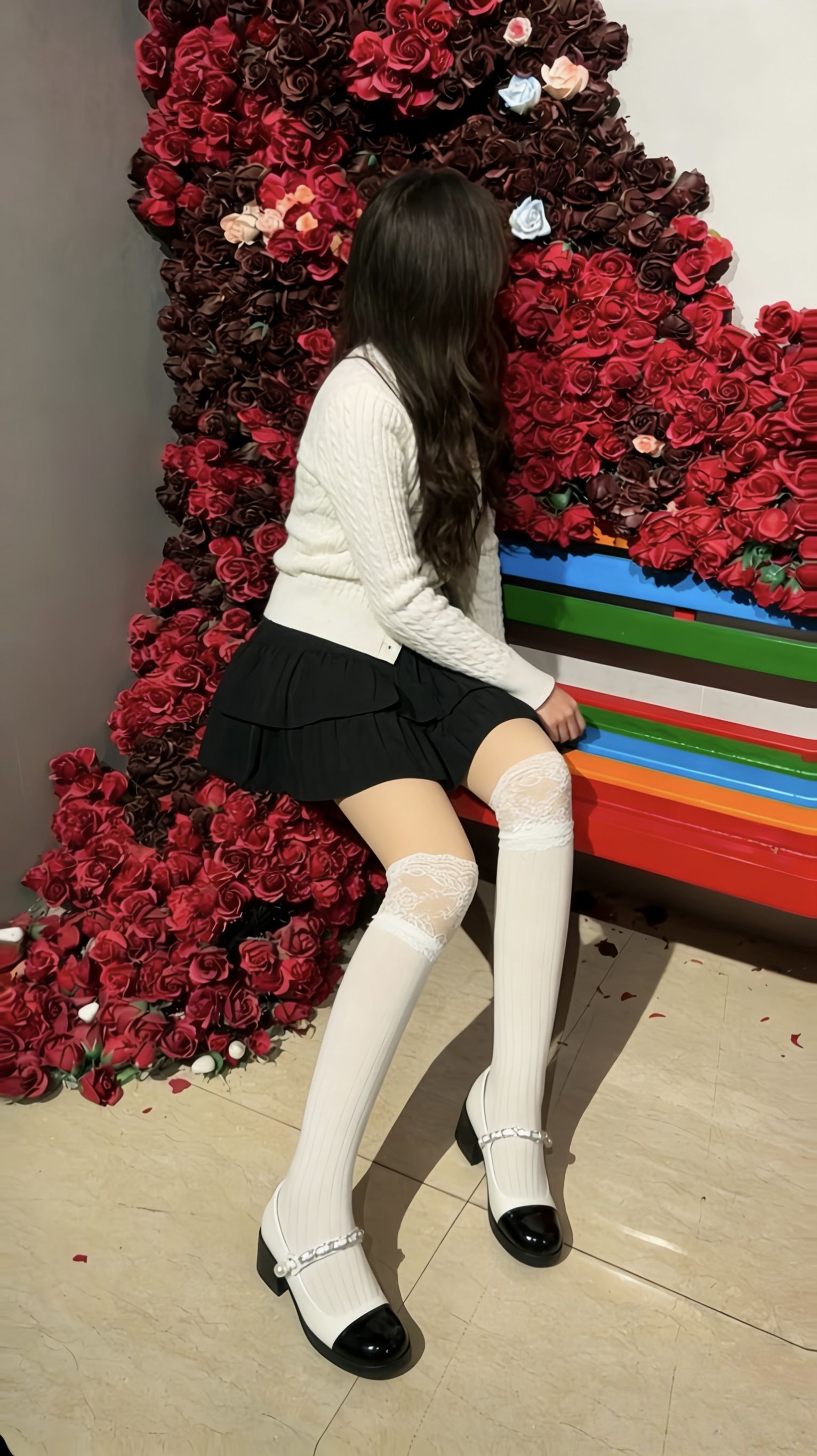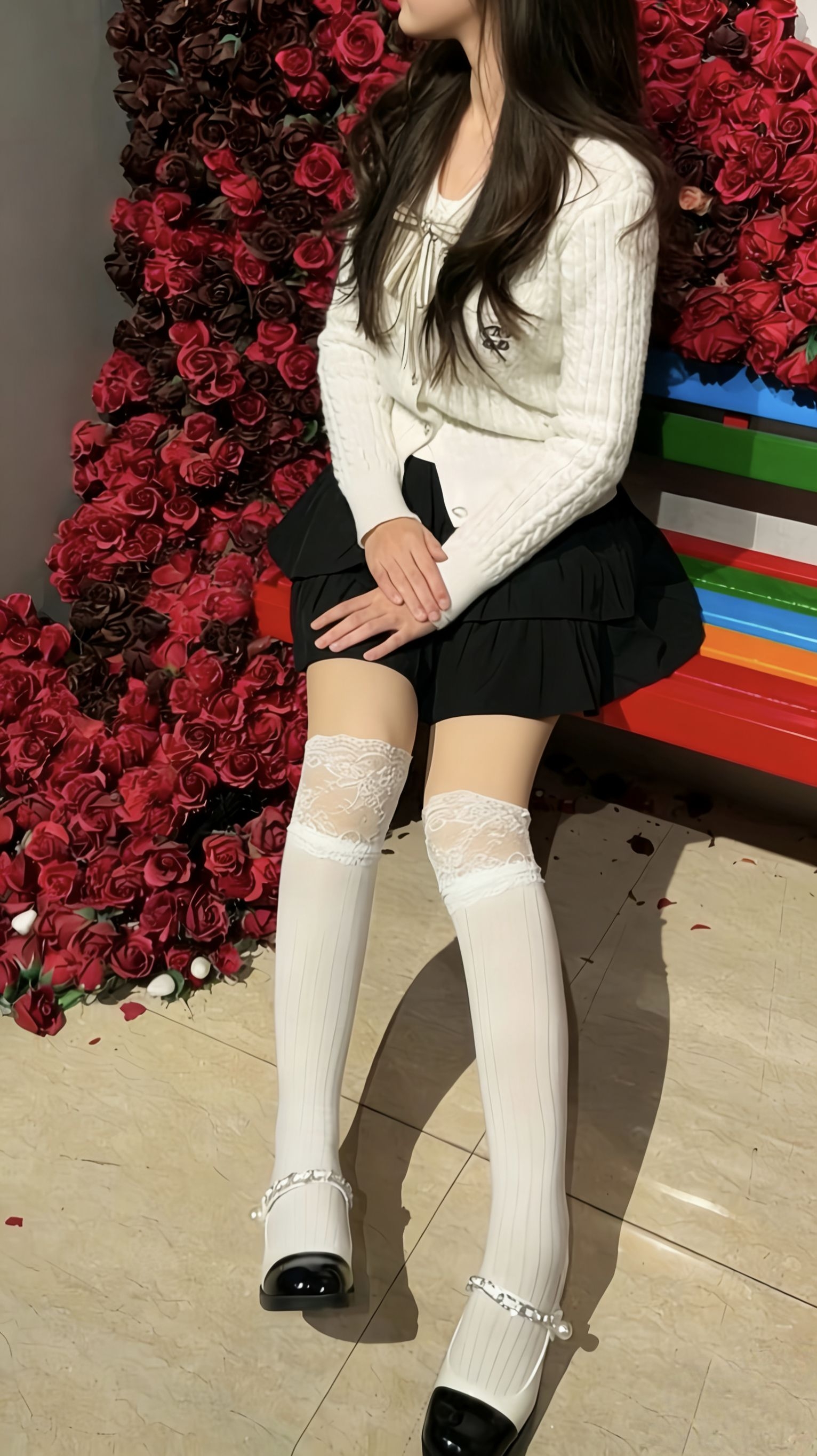 💃 今日OOTD - 上衣:米白色麻花开衫,温柔软糯,自带慵懒感,胸前的小刺绣增添了精致细节。 - 下装:黑色多层蛋糕裙,俏皮减龄,裙摆的层次感让整体造型更灵动。 - 袜子:蕾丝边小白袜,绝对是这套穿搭的灵魂!上半部分的蕾丝设计甜美又性感,下半部分的竖条纹纹理修饰腿型,肉色打底袜的叠加穿法,让腿部看起来更加纤细修长,还能巧妙过渡到鞋子。 - 鞋子:黑白拼色玛丽珍鞋,珍珠链条的装饰复古又优雅,和小白...