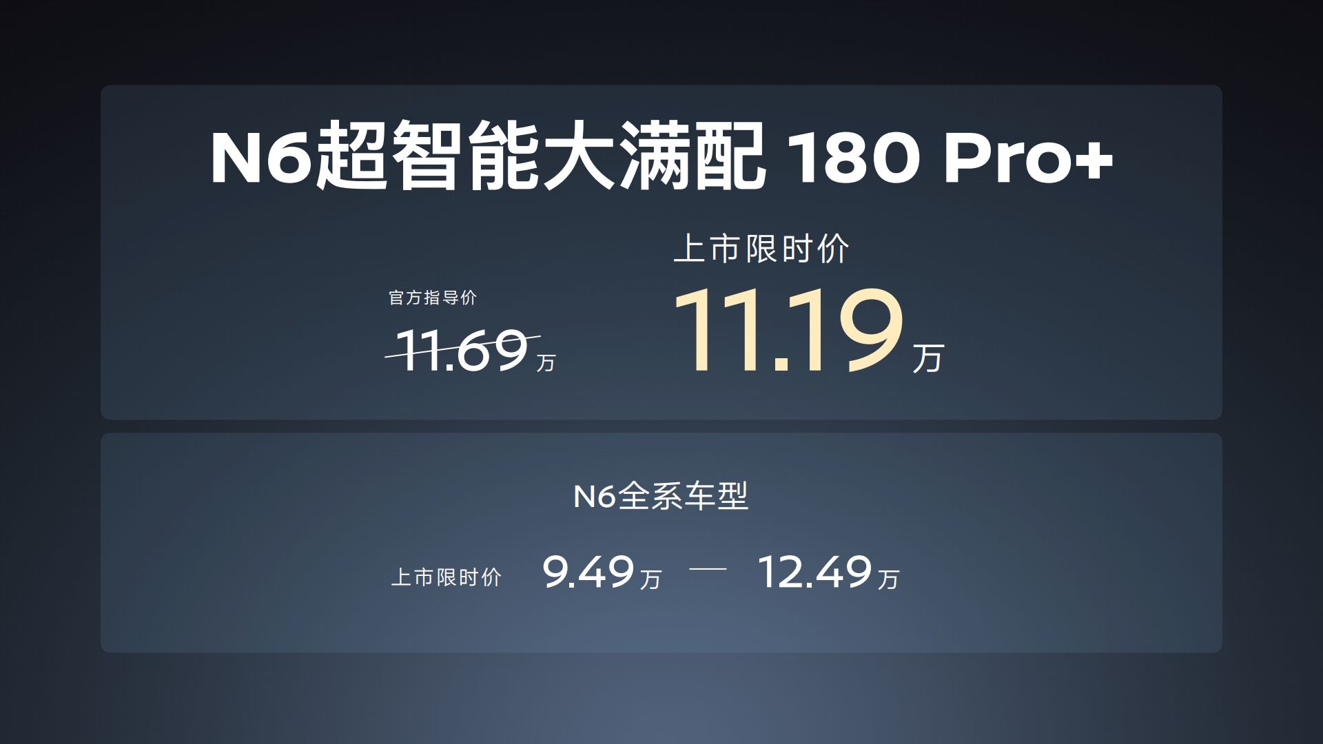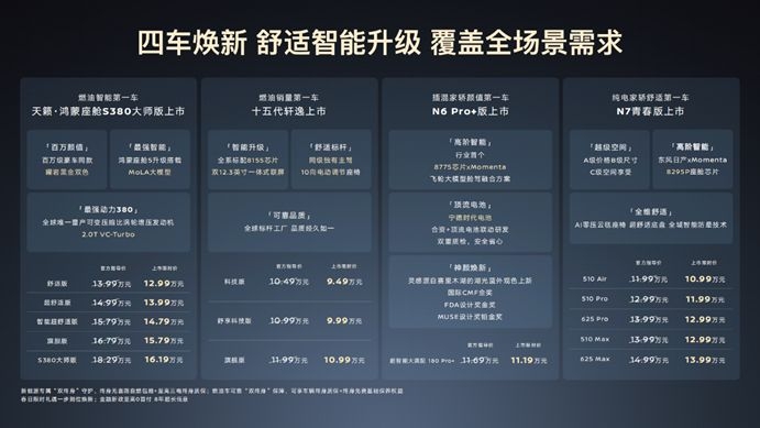 N7 青春版 (上市限时价 10.99-13.99万元):凭2915mm超长轴距实现“A级价买B级车,享C级大空间”。搭载高通骁龙8295P芯片、15.6英寸2.5K大屏,并配备行业首创的AI零压云毯座椅与全域智能防晕车系统,定义纯电家轿价值新标杆。