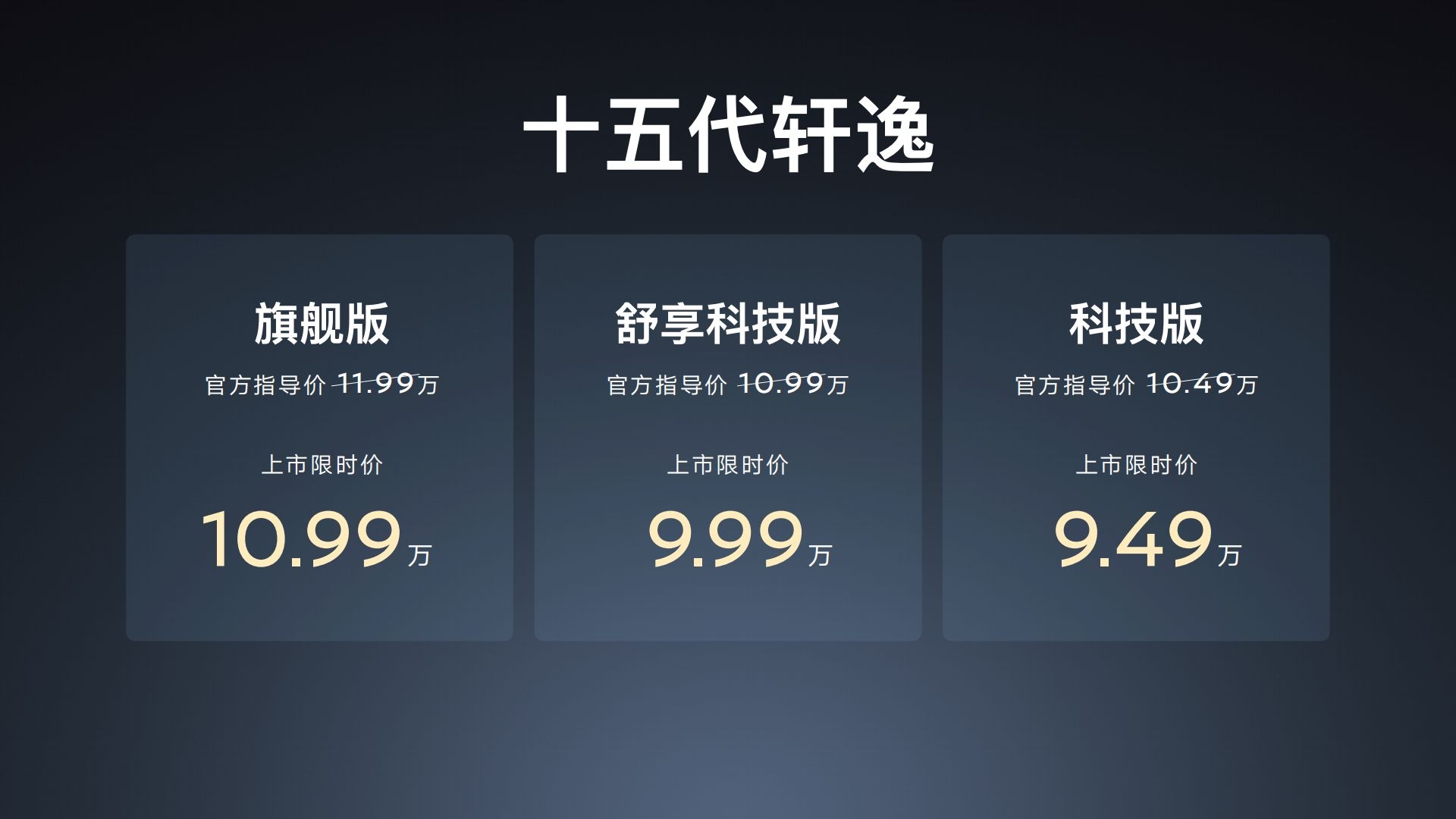 十五代轩逸 (上市限时价 9.49-10.99万元):马年第一款新车!标配高通8155芯片与双12.3英寸一体式联屏,实现“油电同智”越级突破。轩逸家族矩阵齐全,6万级经典款、8万级十四代、9万级十五代,从可靠舒适到智慧科技,总有一款适合你。