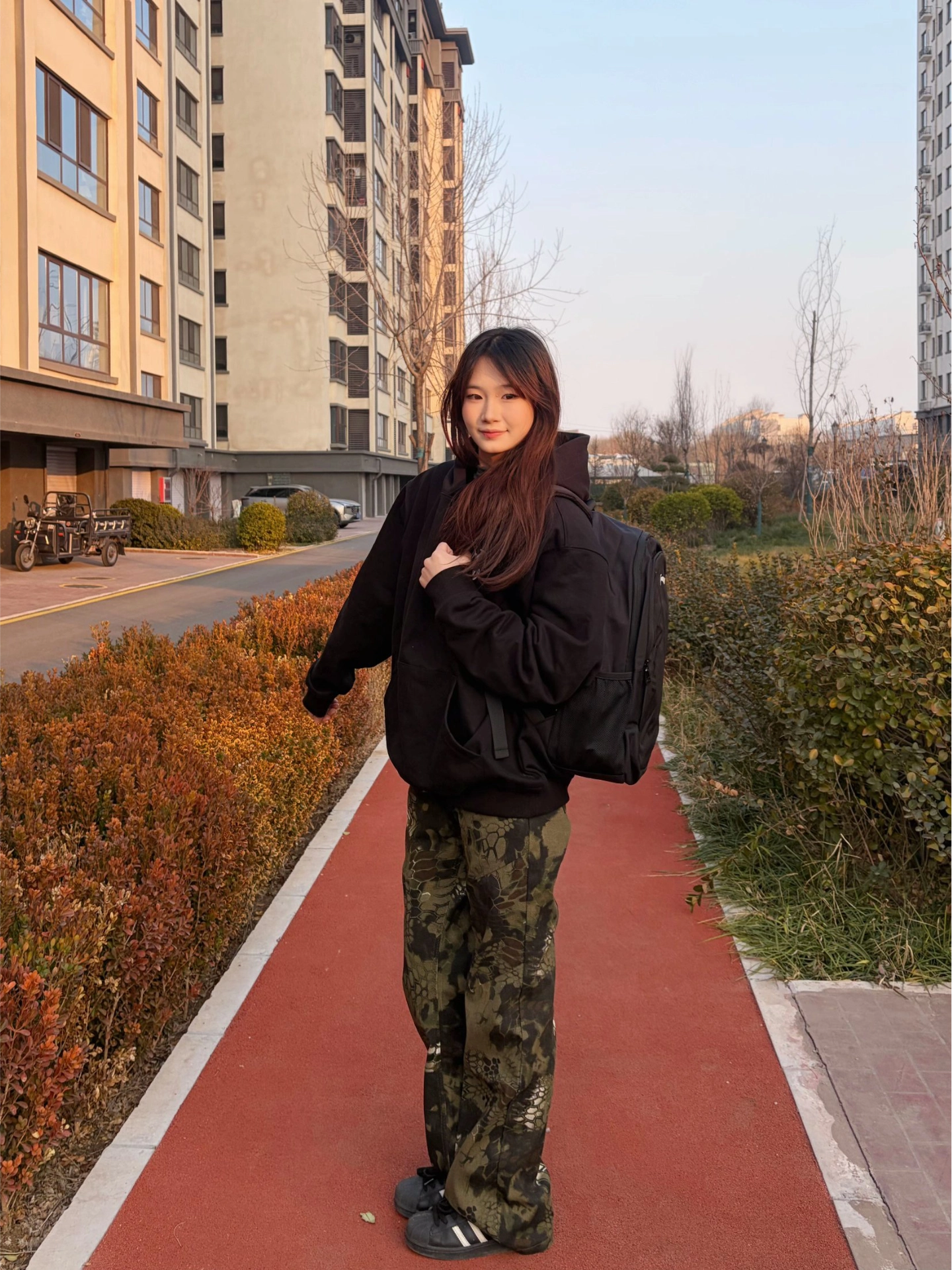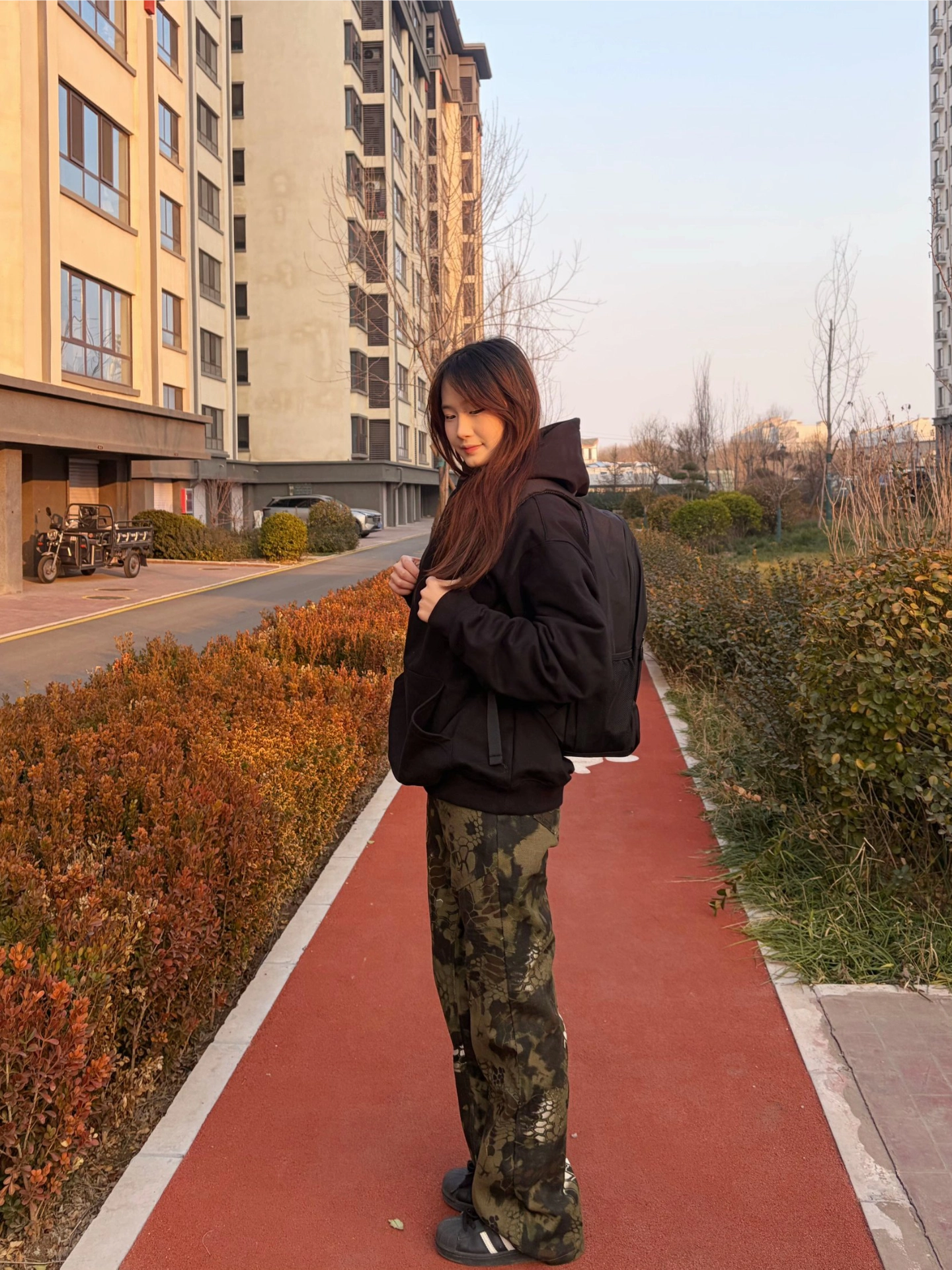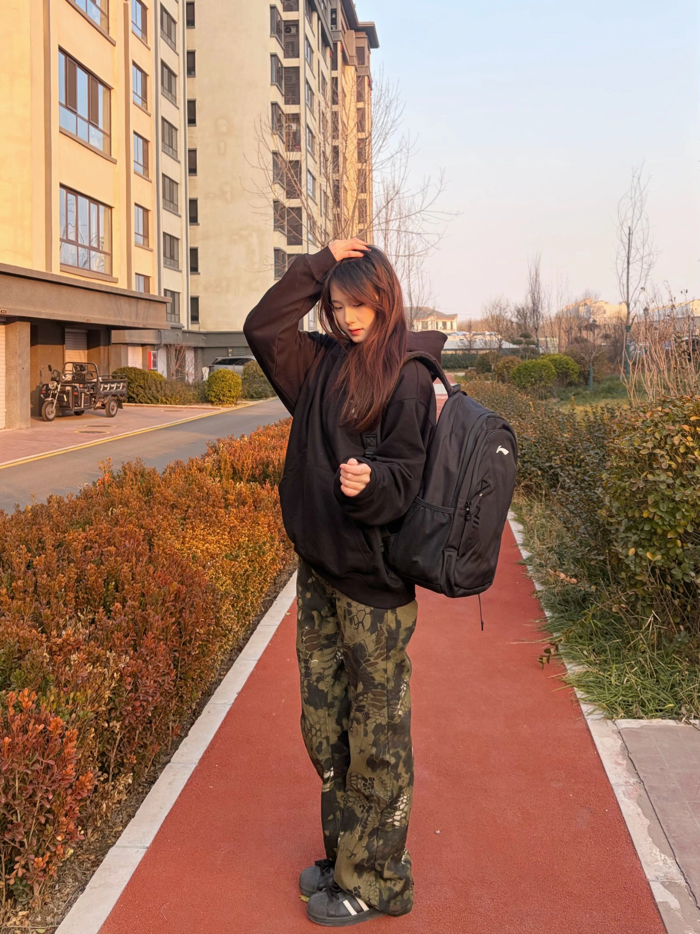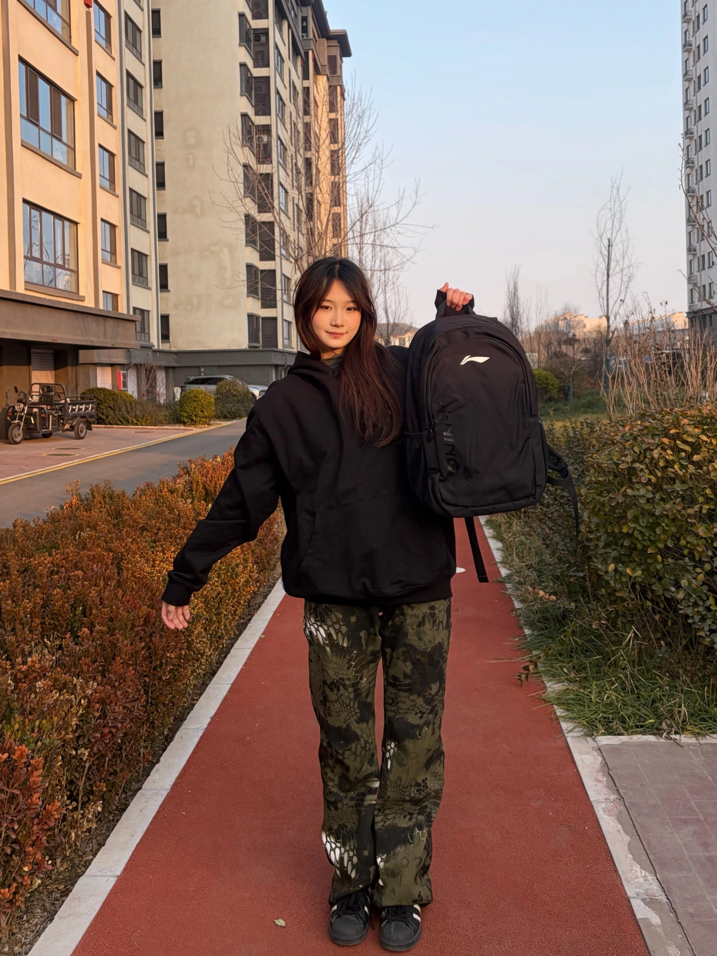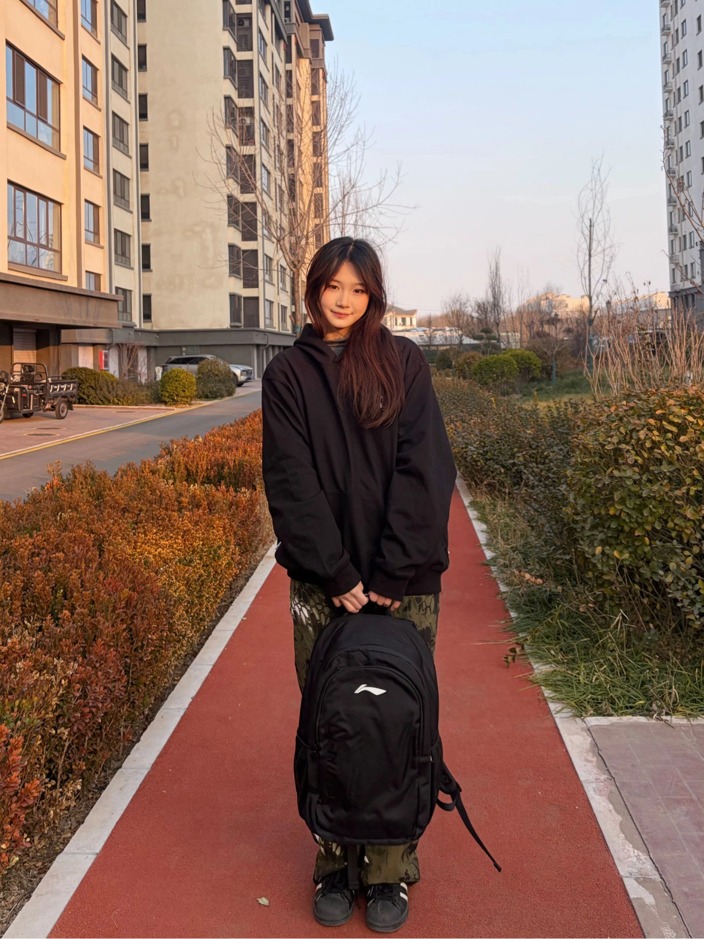 我今天穿的是#李宁 双肩包还挺合心意的~☑️黑色的外观简约又百搭😻 和我穿的黑色连帽衫、迷彩裤搭在一起很有街头感。包的容量看着还不错🥰 日常装书本、水杯🥤这些小物件基本能满足, 肩带调节起来也比较顺手, 不管是上学还是出门逛也挺合适的👍🏼 细节设计也能感受到实用性~ 图源网络侵删