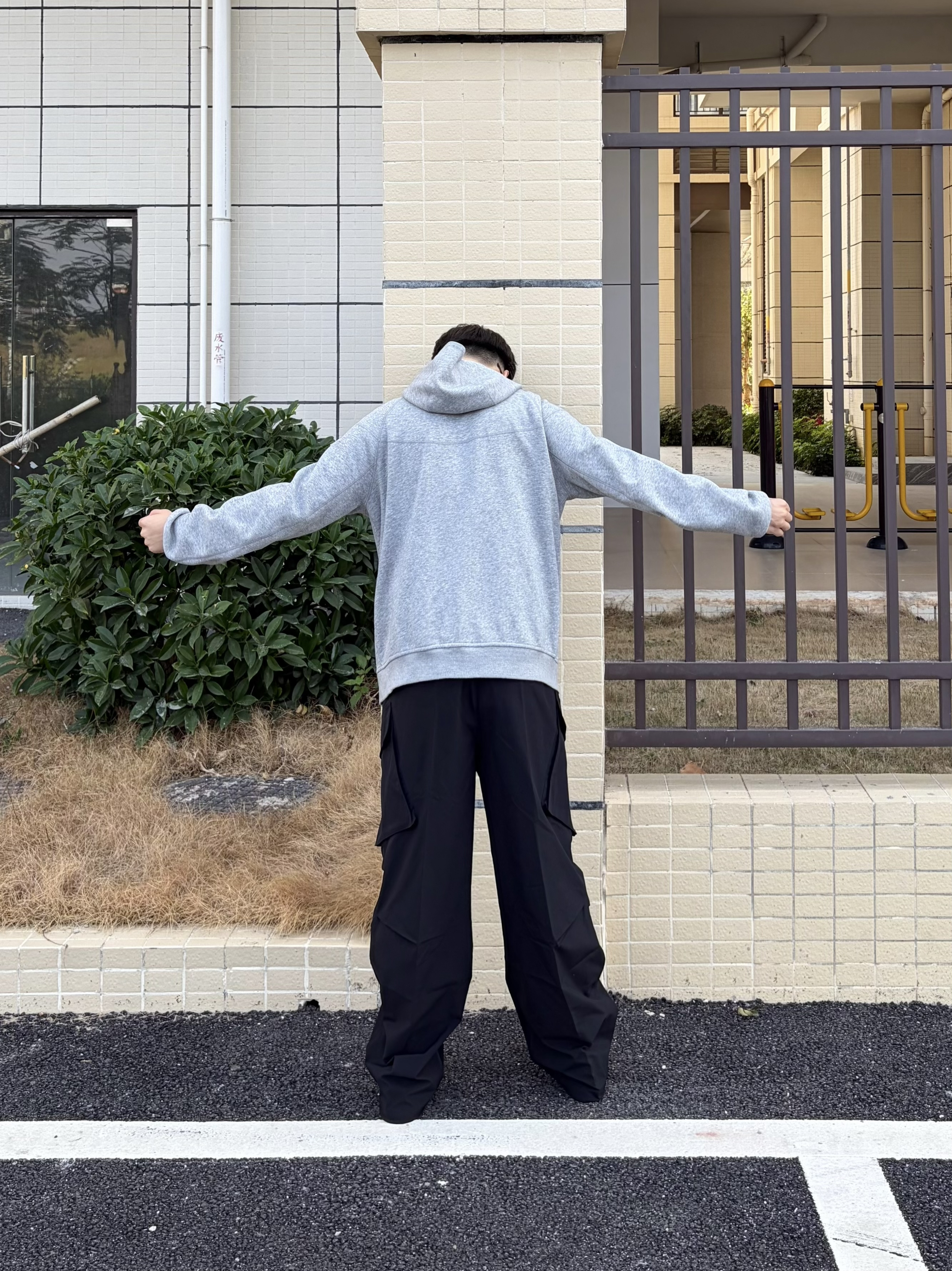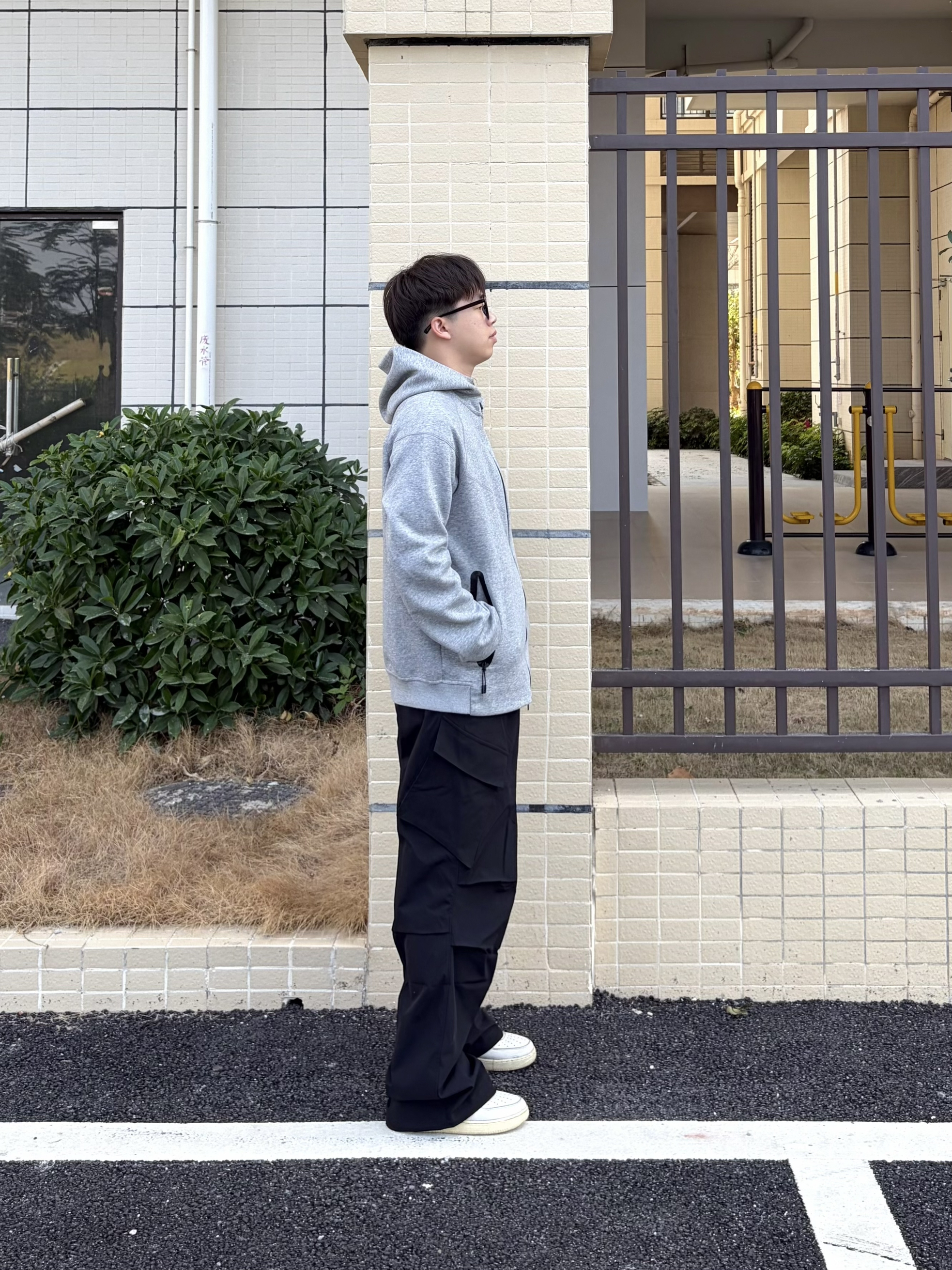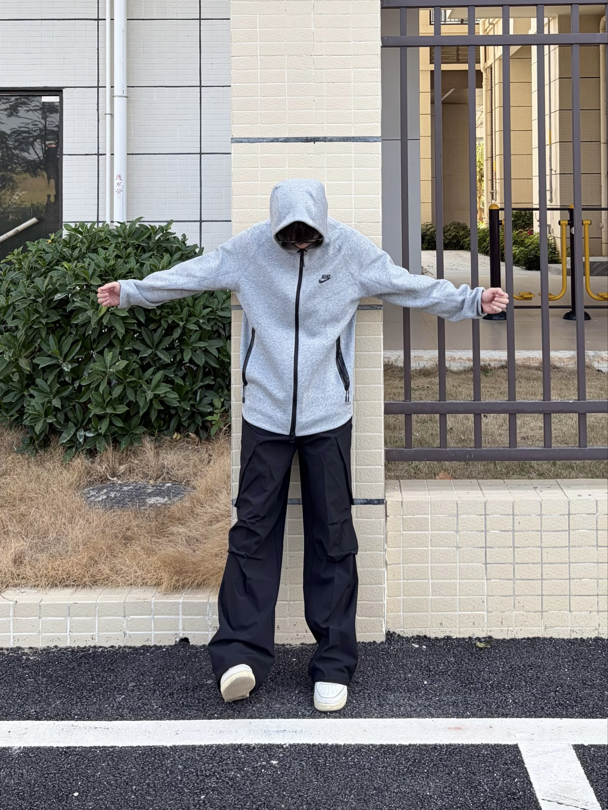 最近日常出门就爱这种省心搭配 特步 这条正黑色伞兵裤👖 防泼水耐脏面料透气不闷 质感十足🔥 侧边大口袋实用又有造型感🕶️ 垂坠感刚好修饰腿型 173/120选择L 搭件浅灰连帽外套和小白鞋 轻松拿捏户外citywalk🚶