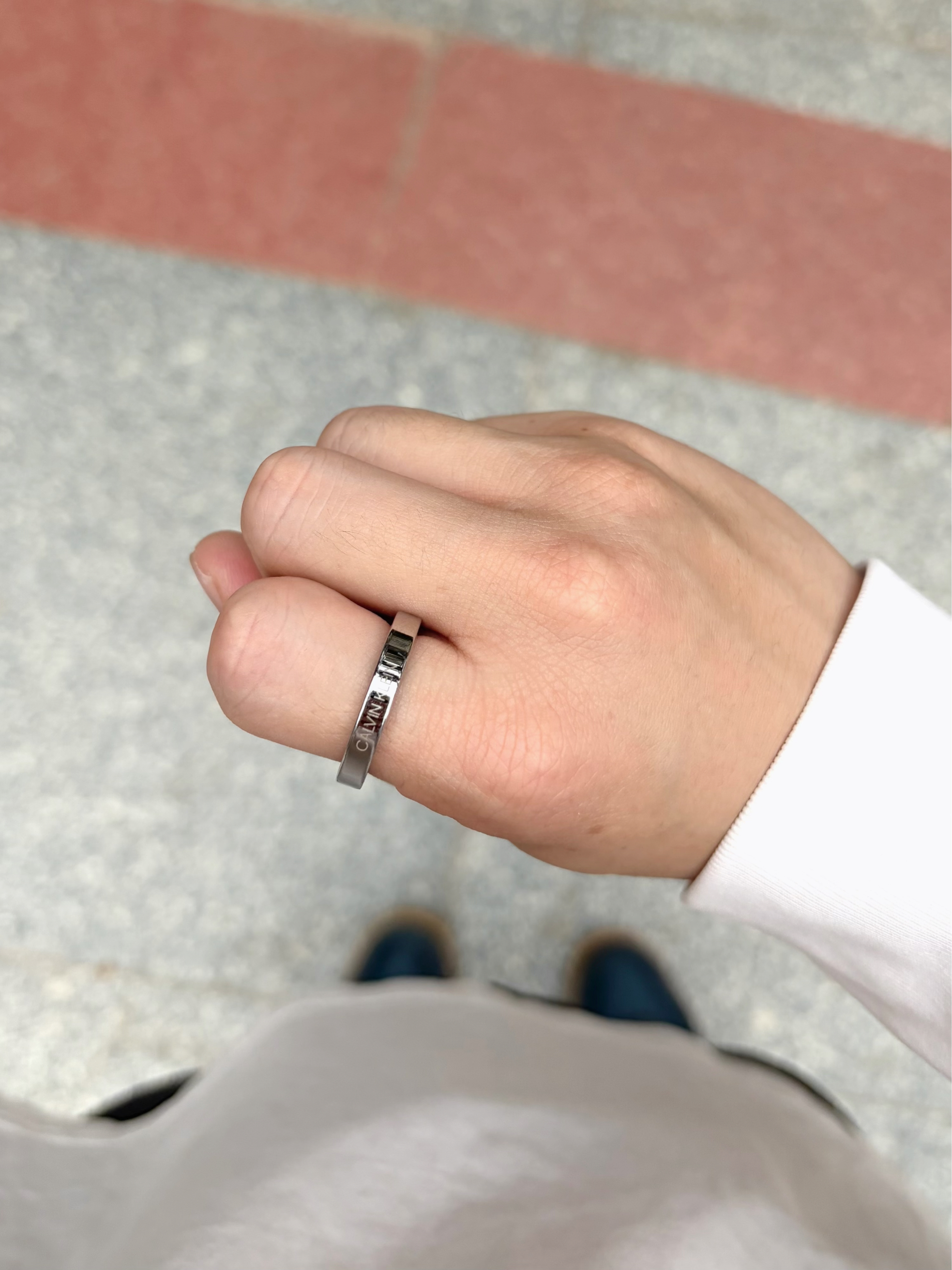 今日份穿搭分享look👀 - 手上这只 Calvin Klein 刻护系列 银色素圈戒指💍 指环采用钛钢材质✨ 刻字低调 单戴就很有质感🔥 冷调光泽刚好中和了简约白T / 再叠一条 Calvin Klein 黑金色项链 几何螺母造型潮酷时尚 和戒指呼应得刚好 一身搭配下来 配饰是点睛之笔🤩 日常出门也能清爽利落🚶