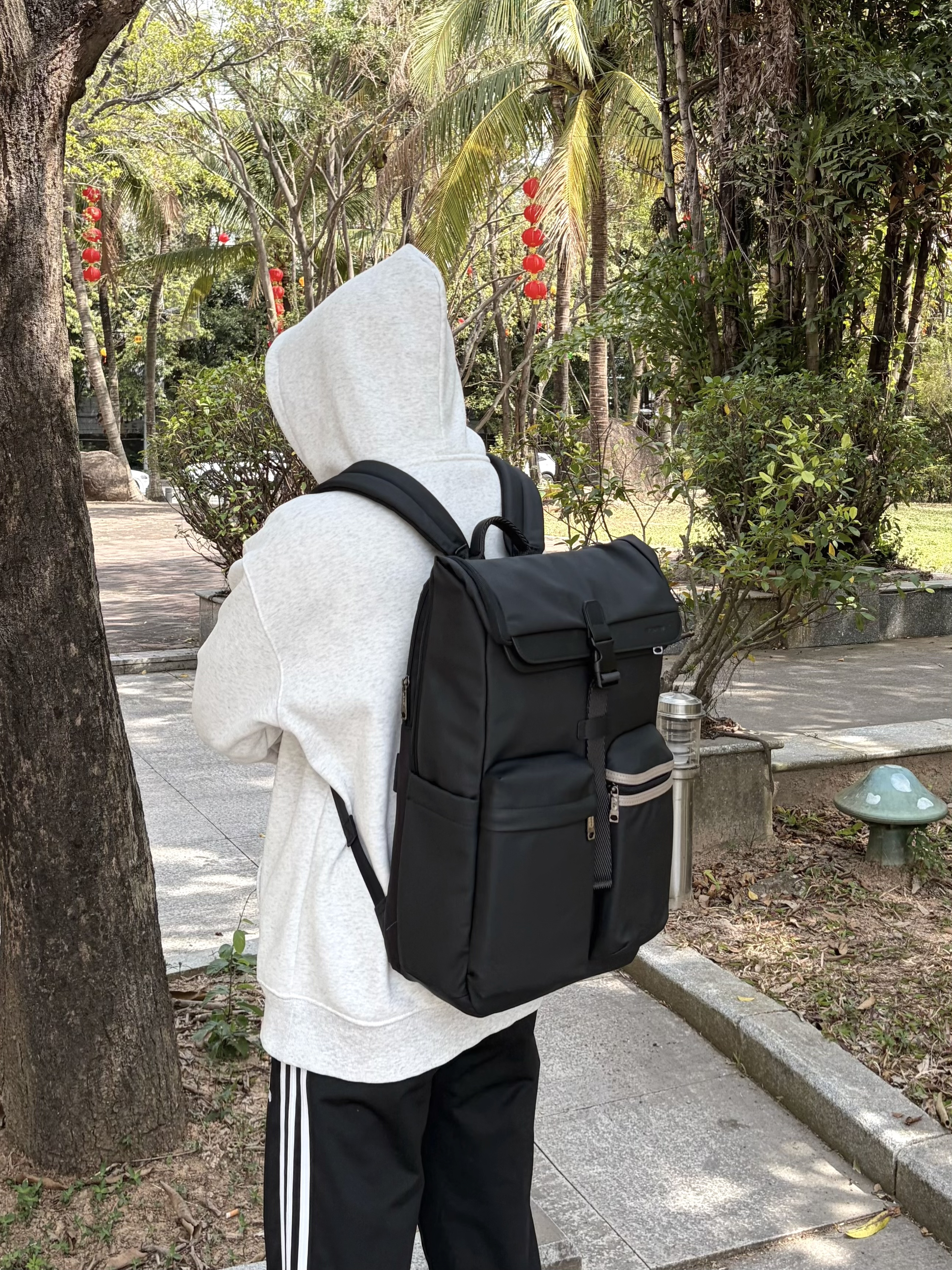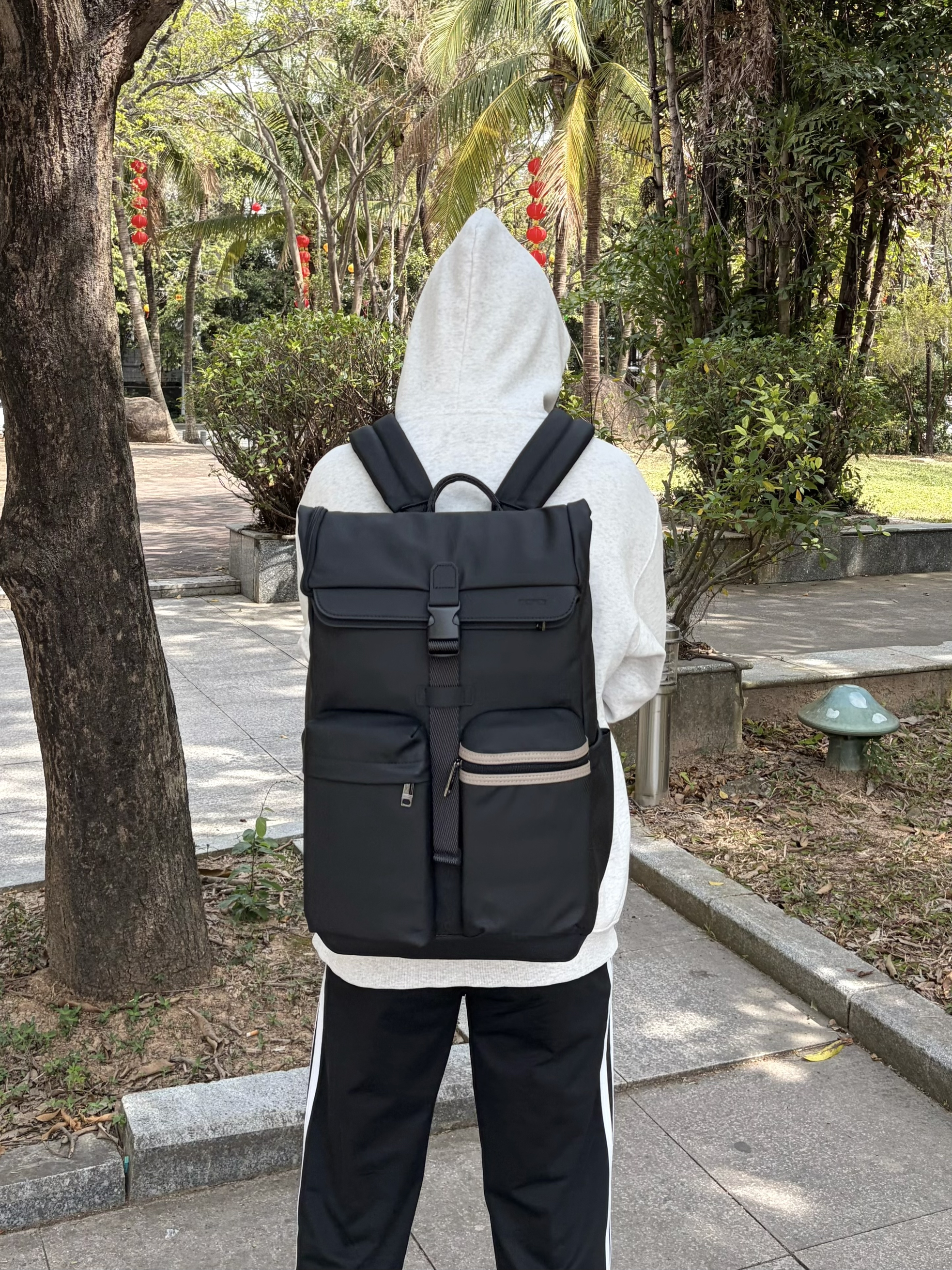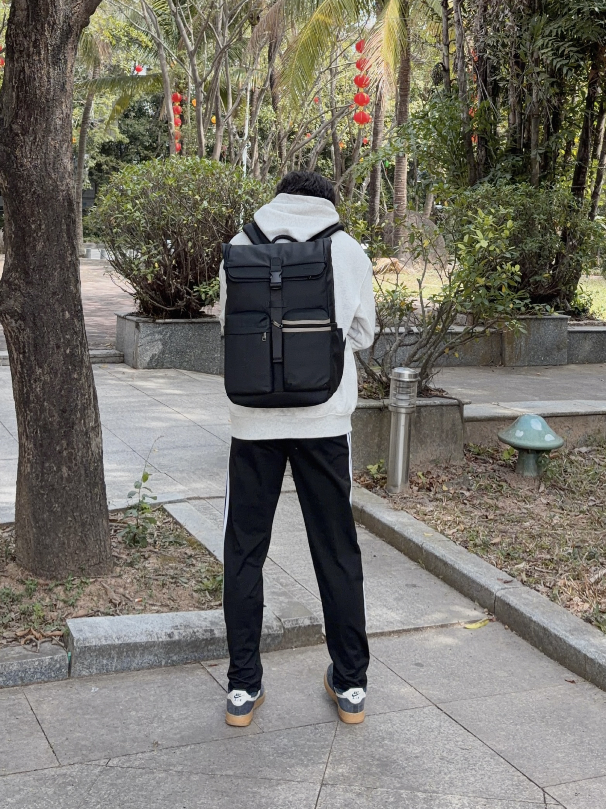 秋冬总需要一只靠谱的双肩包 博牌 BOPAI 这只黑色织物包🎒 卷顶设计利落又能装🔥 两个前袋放得下随身小物📖 轻商务风拉满 肩带背着也舒服 搭一件浅灰连帽卫衣👔和黑运动裤👖 日常通勤&短途出行一只包就够了🚶