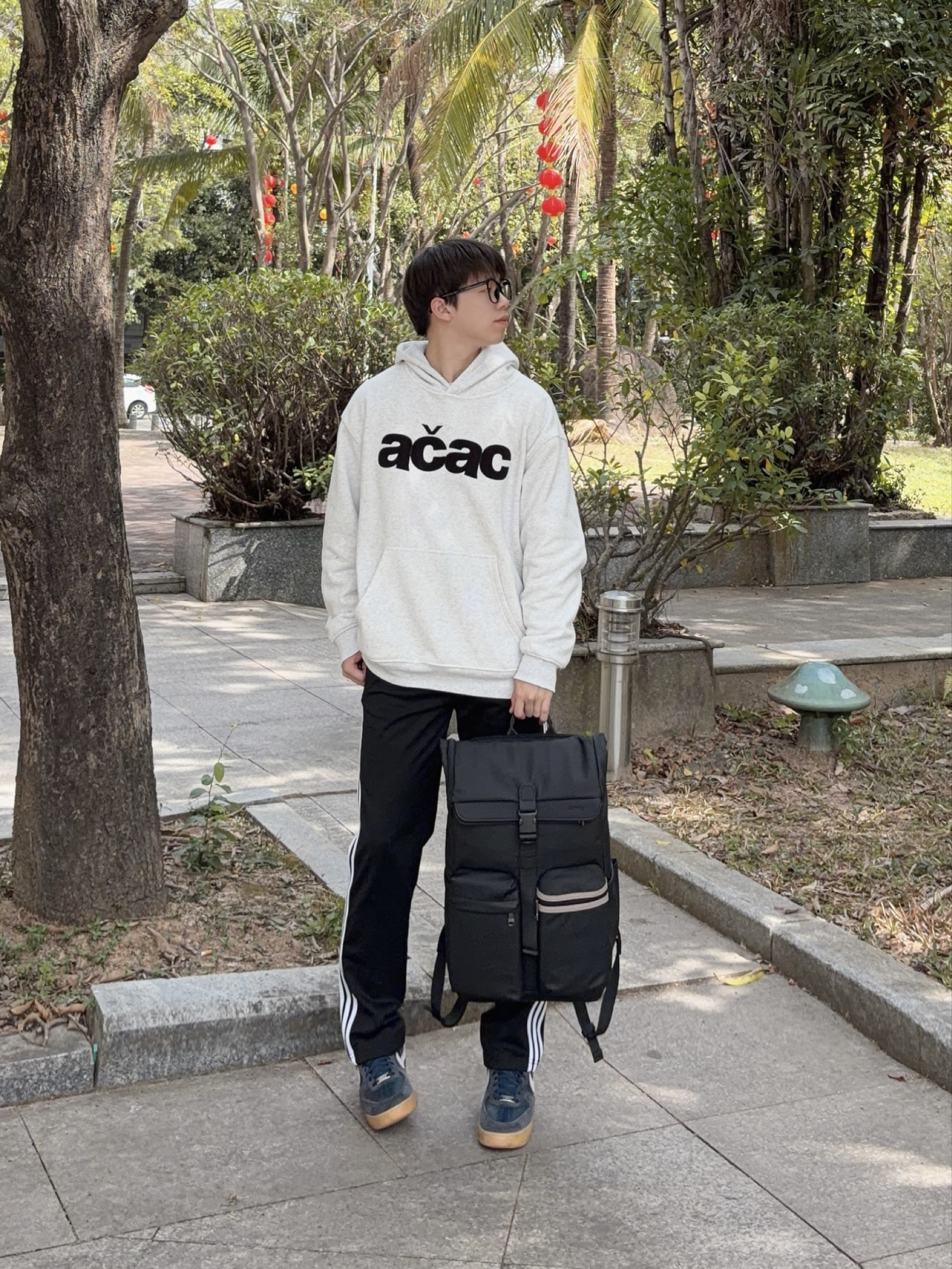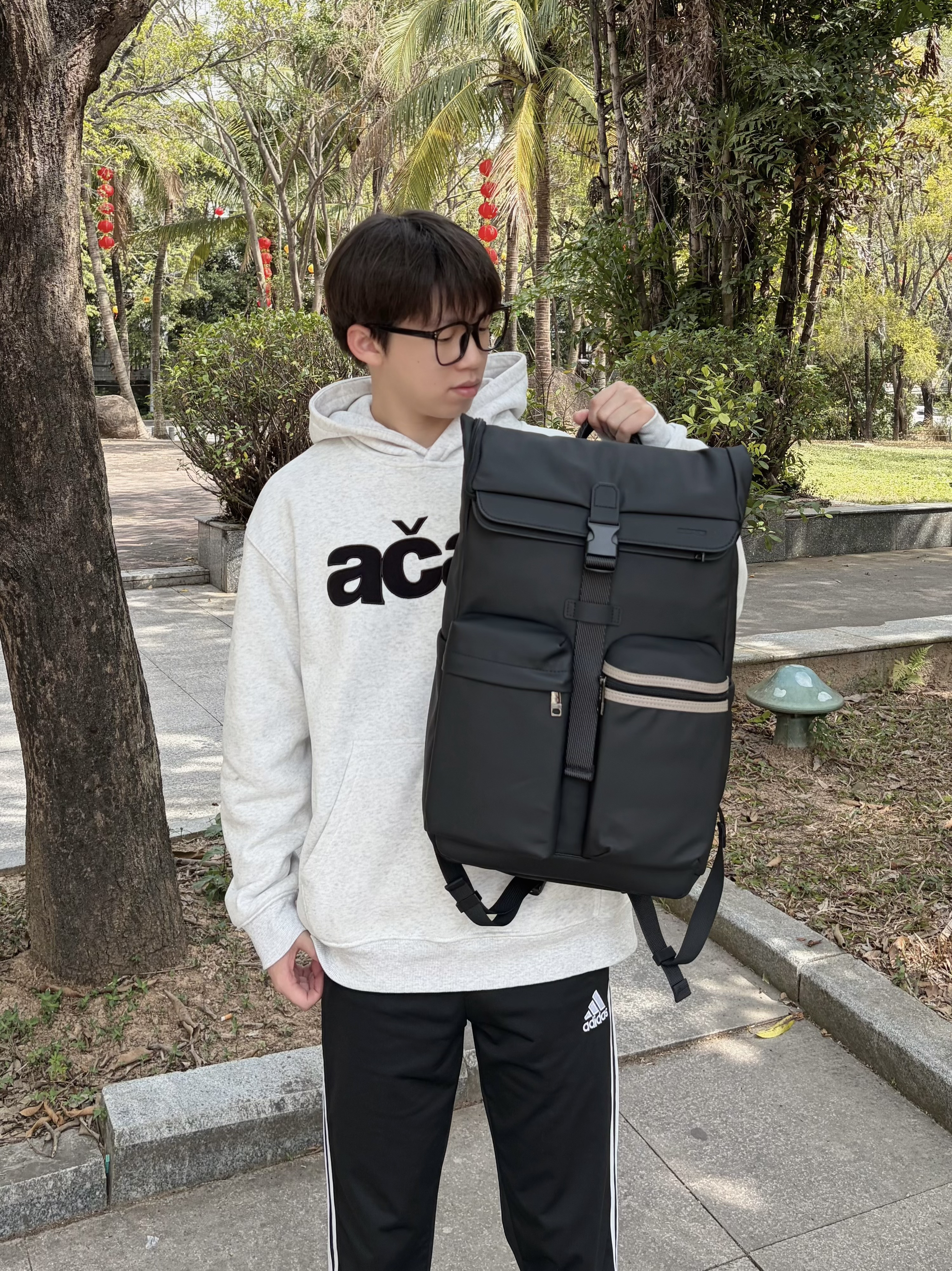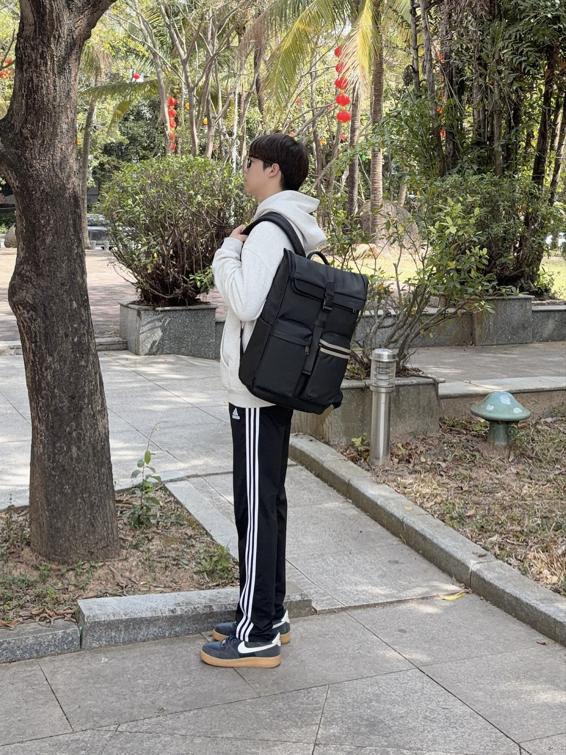 秋冬总需要一只靠谱的双肩包 博牌 BOPAI 这只黑色织物包🎒 卷顶设计利落又能装🔥 两个前袋放得下随身小物📖 轻商务风拉满 肩带背着也舒服 搭一件浅灰连帽卫衣👔和黑运动裤👖 日常通勤&短途出行一只包就够了🚶