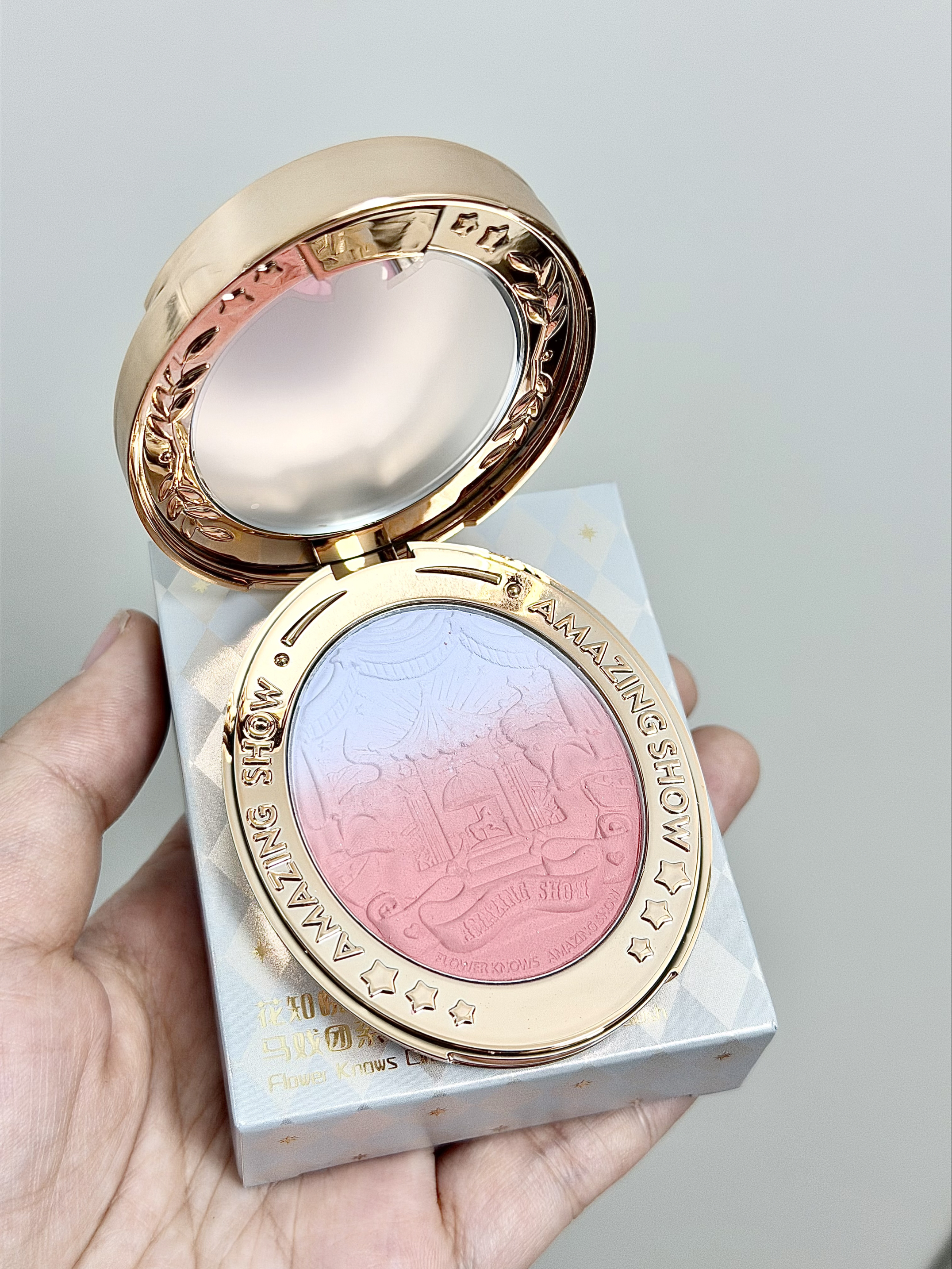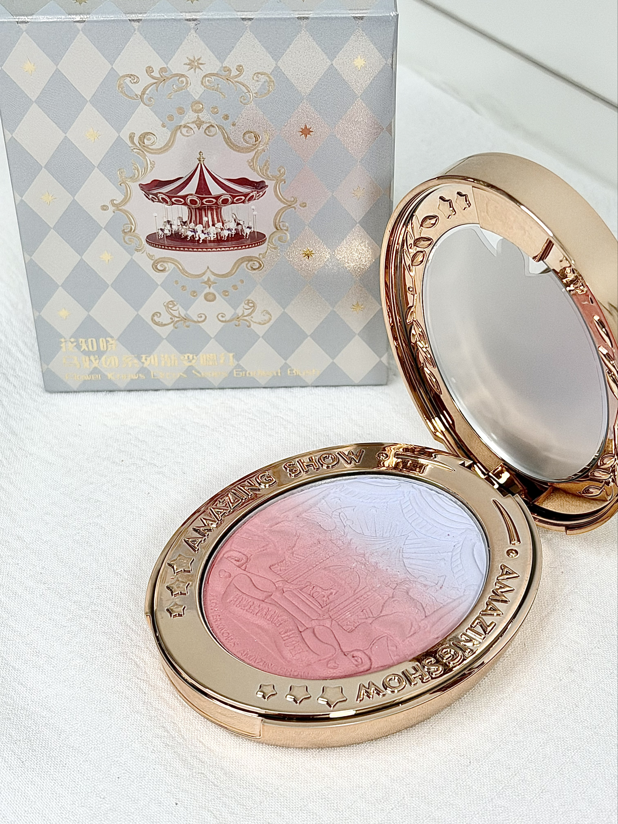 花知晓马戏团腮红01送女生超有心❤️ 满满少女心的马戏团浮雕 颜值与实用性直接拉满 01蓝色月光牛奶蓝+蜜桃粉渐变 就是这样看就是个艺术品 黄皮显白不挑皮 温柔显嫩 日常通勤都好搭 粉质细腻不飞粉 谁用谁是甜妹 收到绝对夸你有眼光~