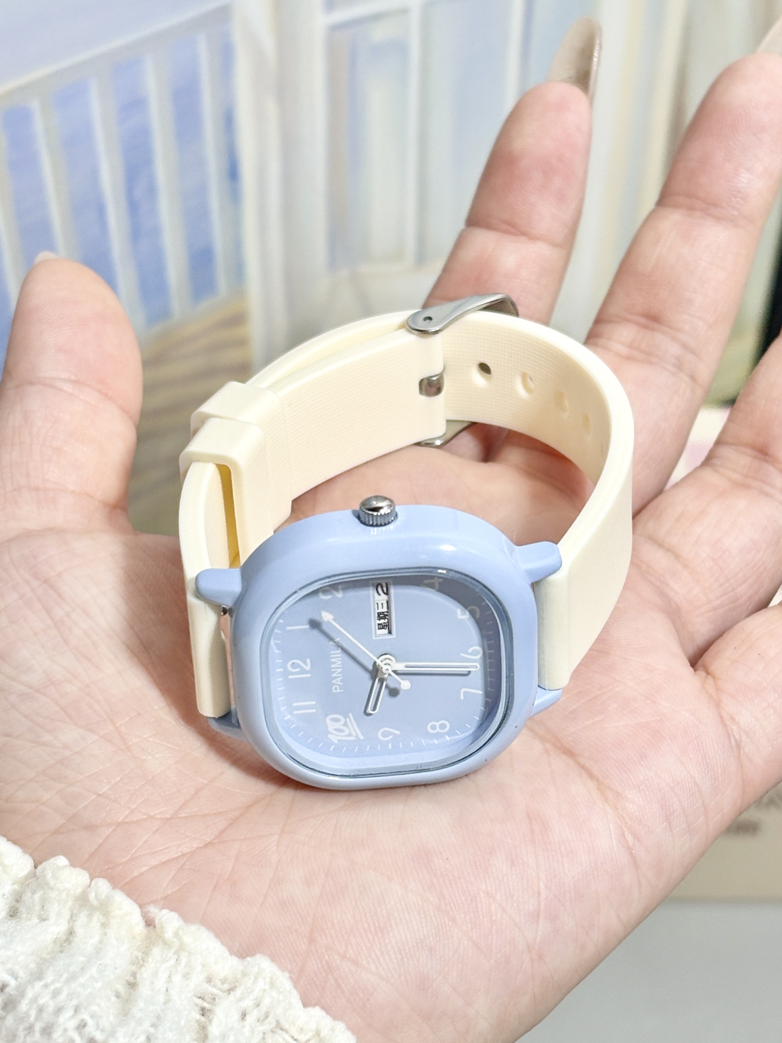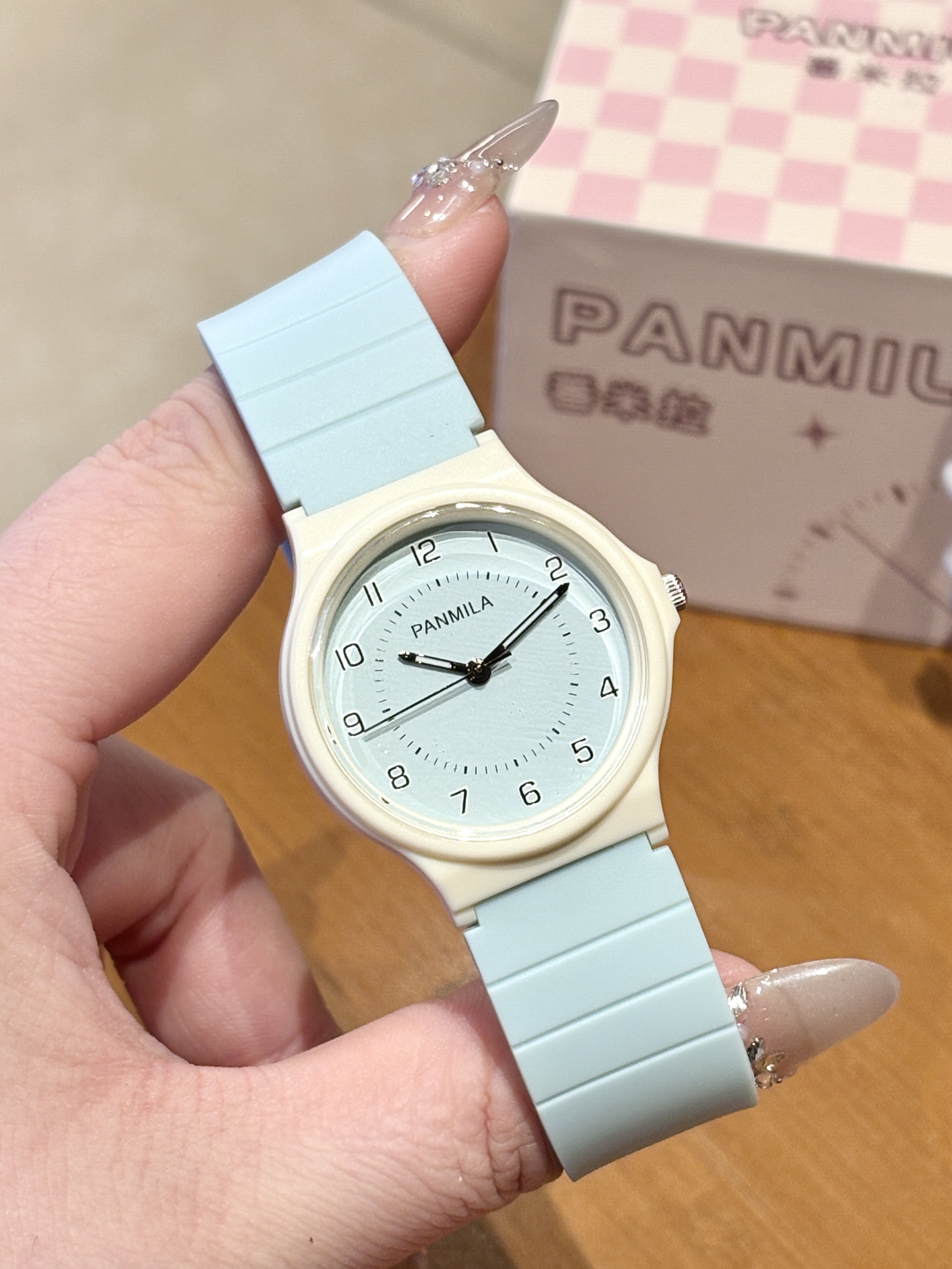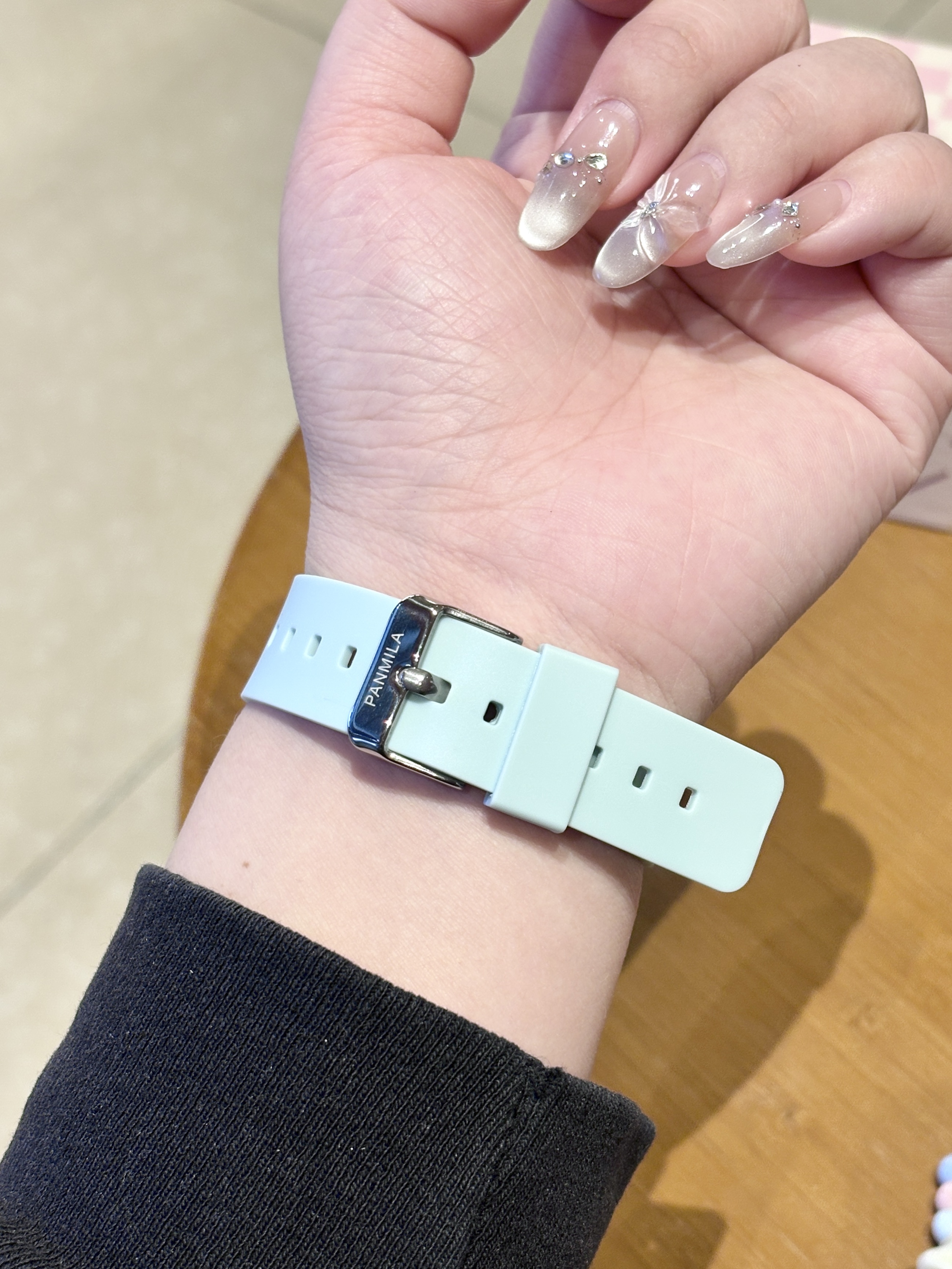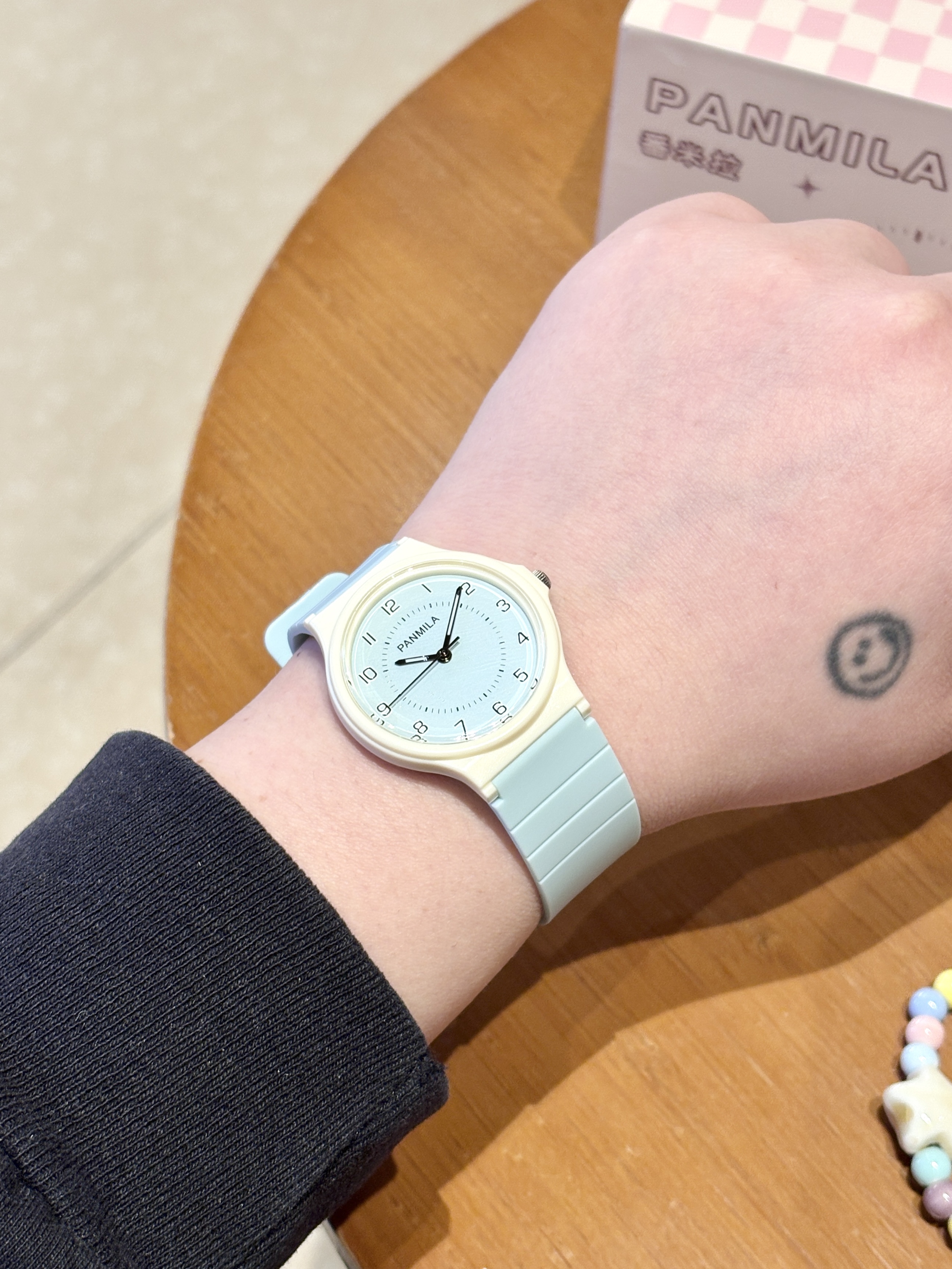 谁懂啊!被这块PANMILA手表狠狠拿捏了🤏 马卡龙海盐蓝拼奶白配色,清清爽爽的太戳少女心了 硅胶表带软乎乎的,贴肤戴完全不闷汗 表盘大小刚好,上手显手腕细 百元价位质感拉满 ,送礼也超有面 学生党上课看时间,打工人通勤搭配都合适,