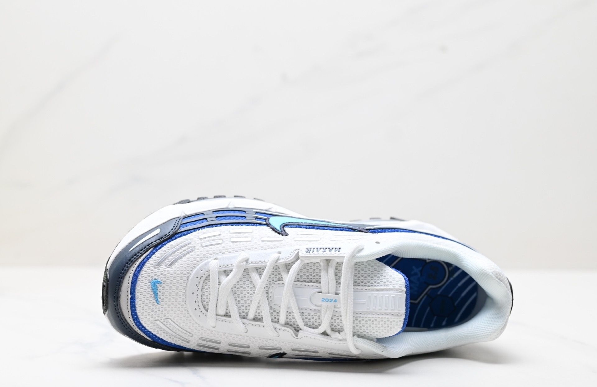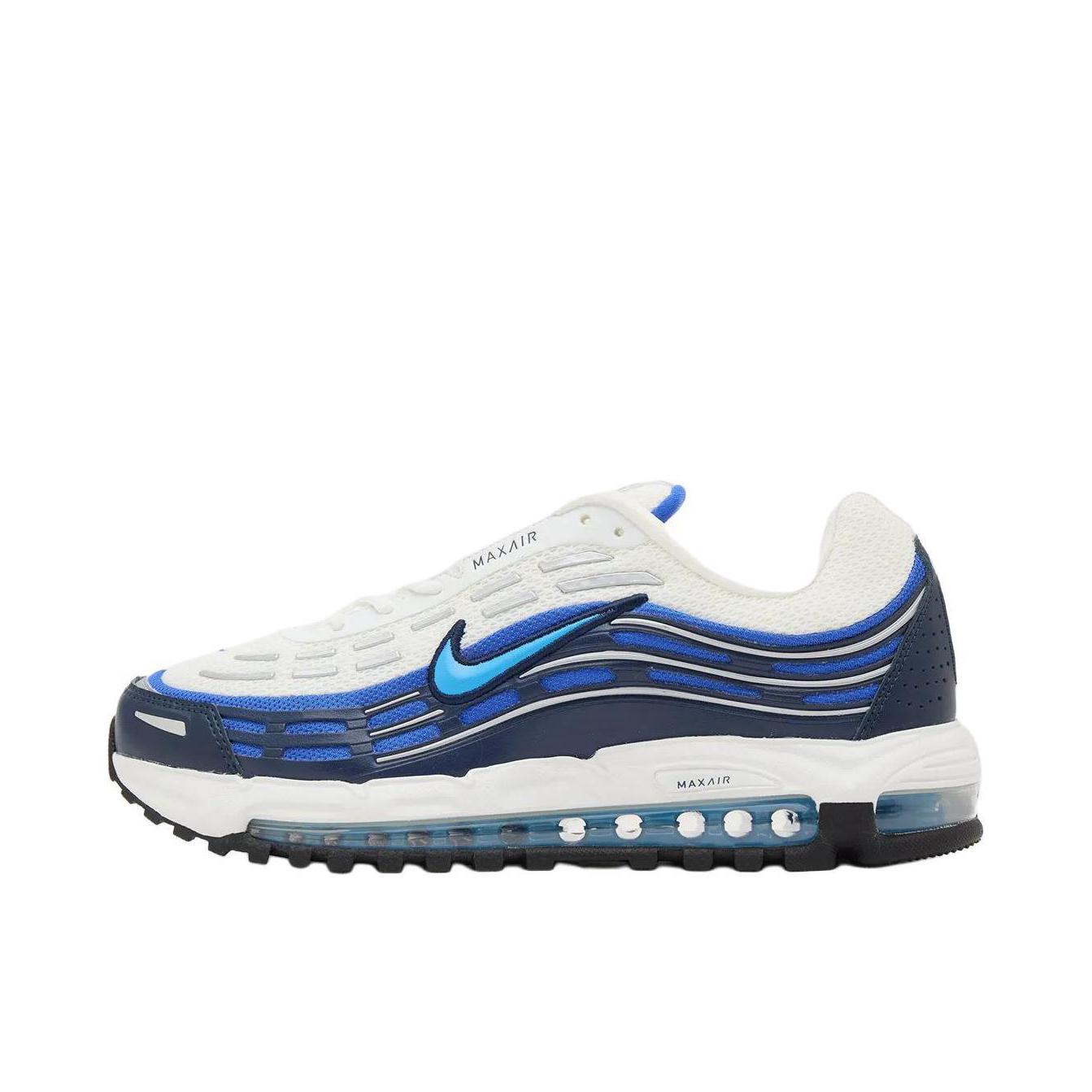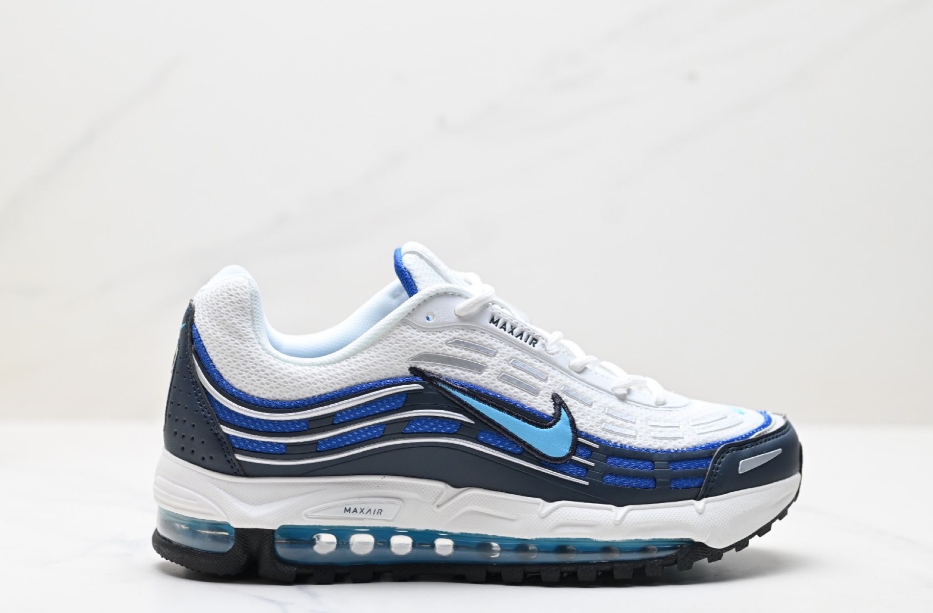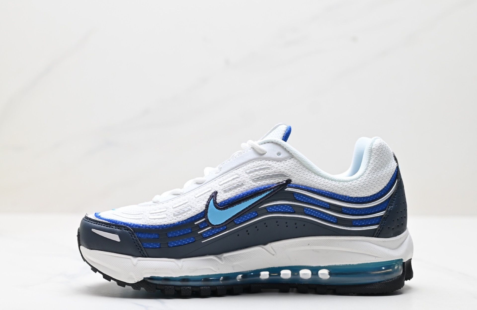 这双Air Max的蓝白撞色, 完美平衡了运动感与清爽感。 透明气垫的细节处理, 让整体造型更具科技感和层次感。