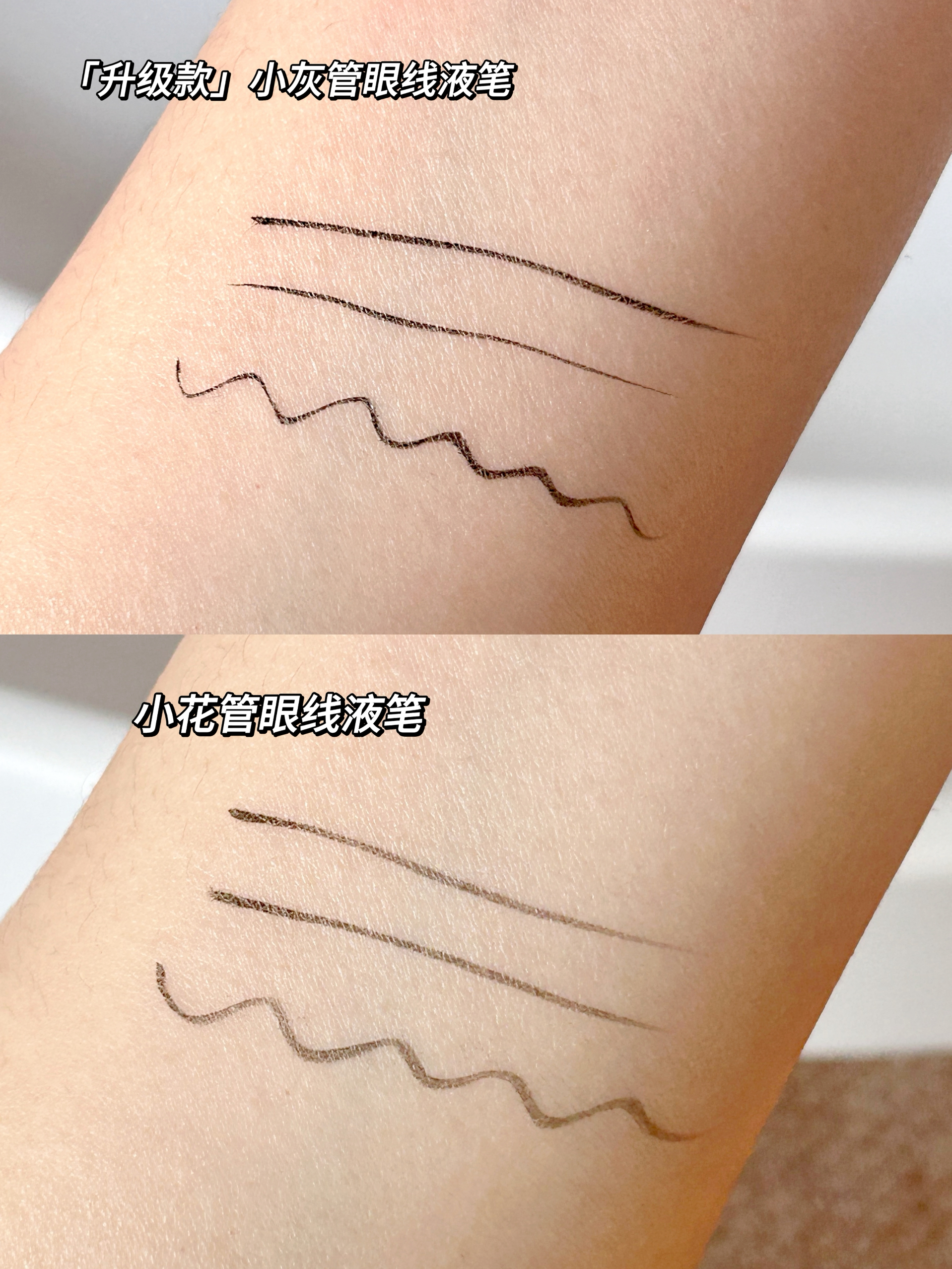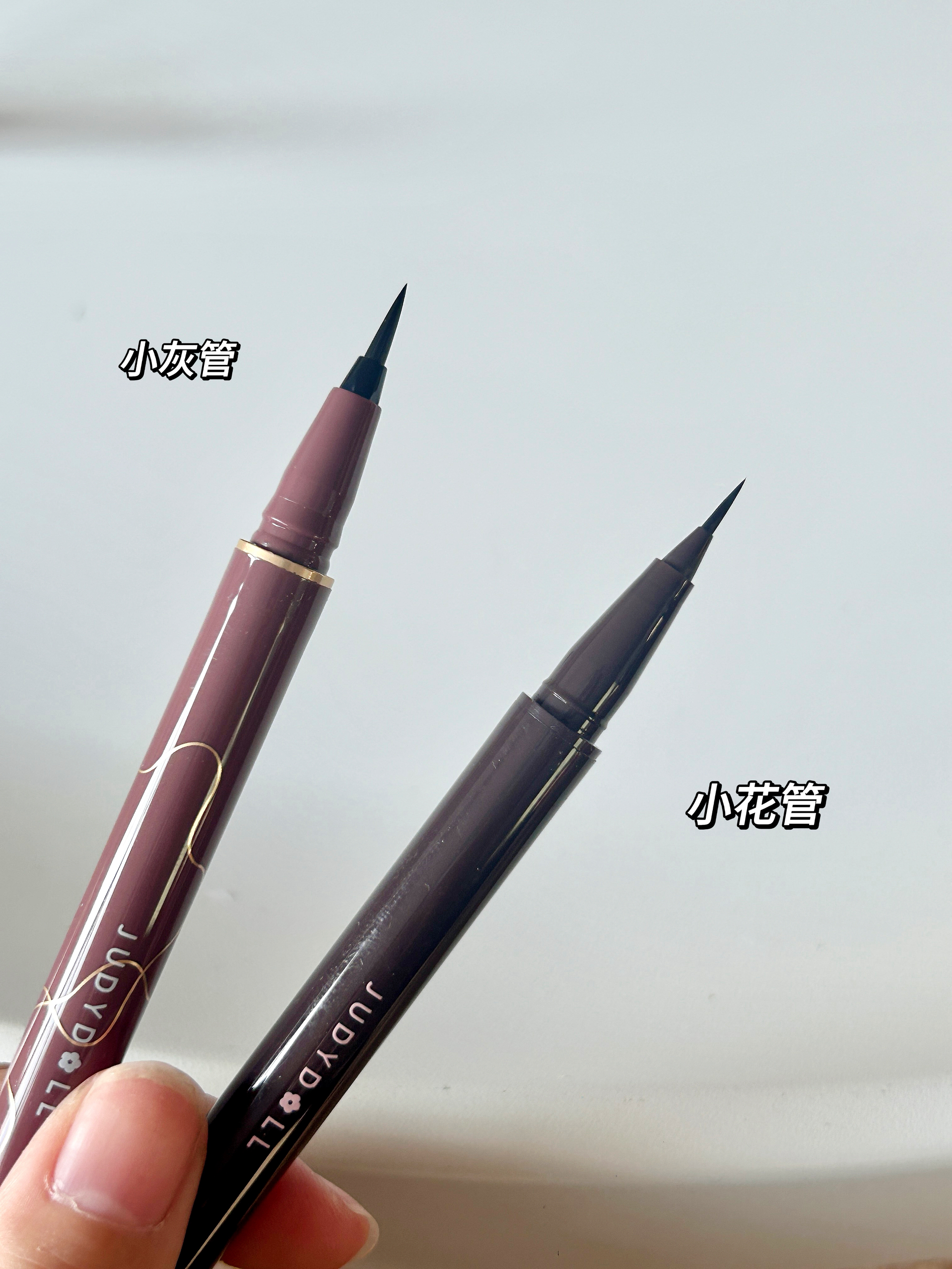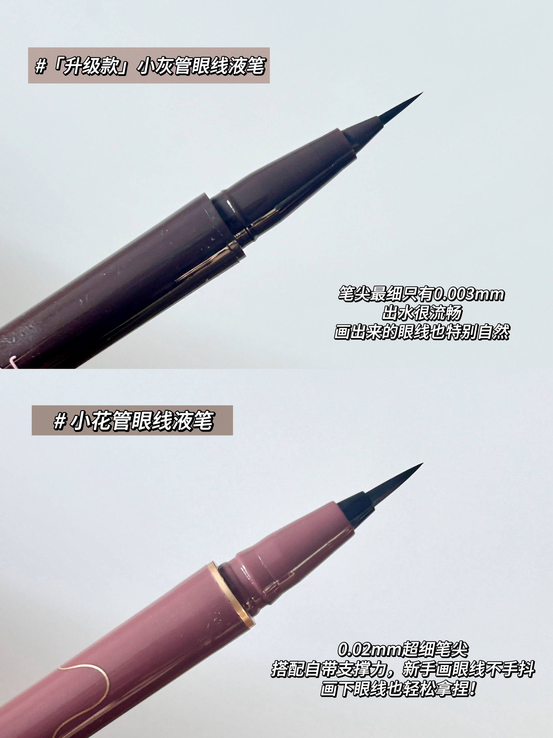 老粉集合!橘朵这两支眼线液笔到底怎么选,一篇说清👇 经典小花管 0.02mm超细笔尖 搭配自带支擇功,新手画限线不手料画下限线也轻松拿捏! 出水超流畅,黑色浓郁纯正不发灰 日常通勤完全够用,带妆一整天基本不晕 妥妥的闭眼入“安心款”,性价比超能打 升级小灰管 笔尖最细只有0.003mm! 出水很流畅 画出来的眼线也特别自然 ▫️ 两支都是速干选手,画错了能快速补救不糊眼 ▫️ 笔身握感都很舒服...