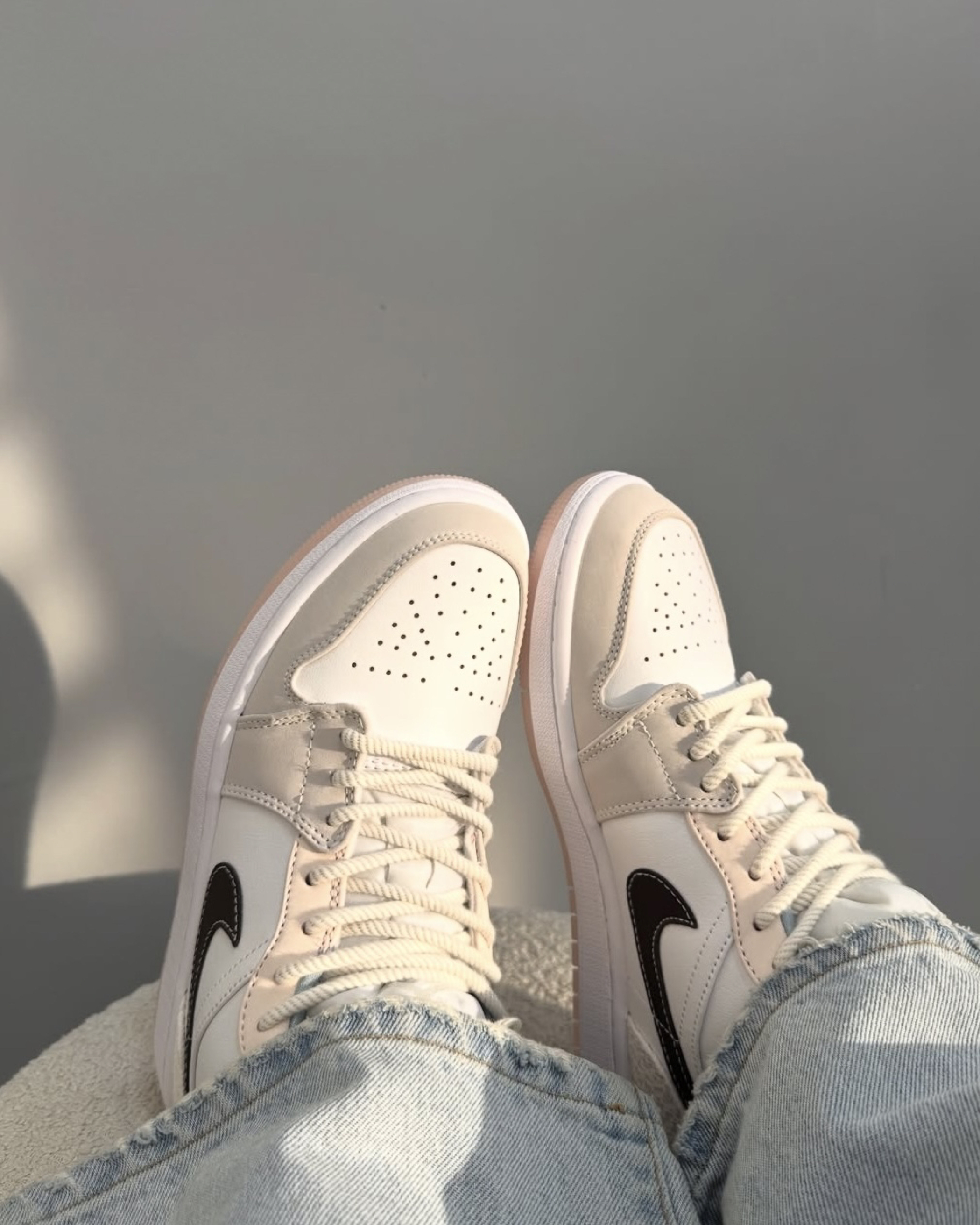 谁懂啊!这双AJ1 Low真的把温柔拿捏得死死的🥹 奶白+浅杏色的拼接,像把春天的奶油蛋糕穿在了脚上 鞋侧的深棕Swoosh和浅粉中底,细节处又甜又高级 • 材质:荔枝纹皮革+麂皮,质感拉满 • 搭配:牛仔裤、百褶裙、运动裤都能hold住,通勤约会都合适 • 脚感:低帮设计更轻便,日常暴走无压力 阳光底下的颜色真的绝了,温柔又显白 春天的氛围感直接拉满,谁穿谁是温柔系美女✨