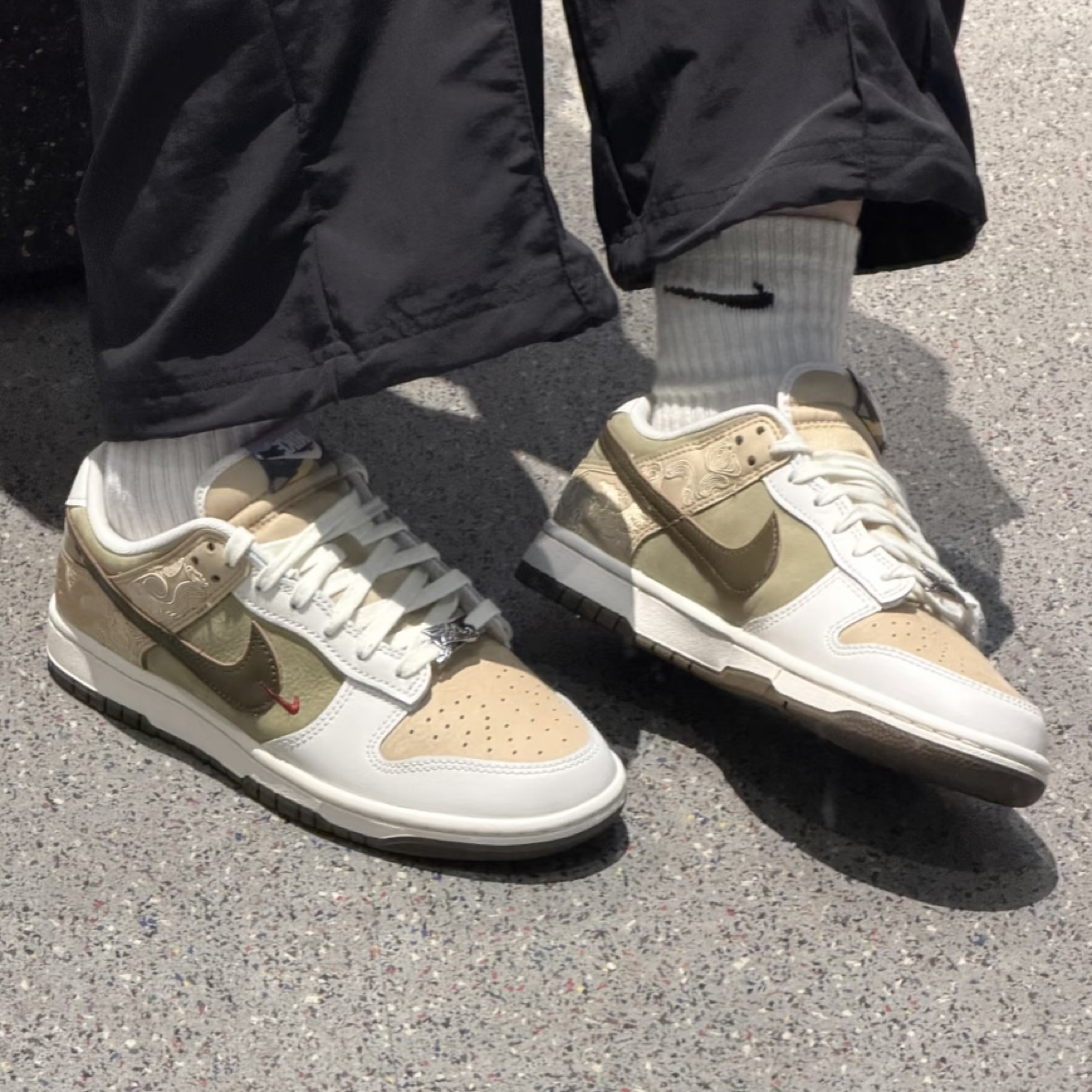 当鞋身铺满米褐色的细腻麂皮,侧边Swoosh暗藏飞马图腾纹理,这双马年限定Dunk便在经典廓形中注入了东方“脱缰”意象。它是飞马套装的灵魂成员,更是2026年开局必须盘明白的潮流硬通货。 ✅ 优点清单 · 质感封神:米白+卡其+军绿的低饱和撞色,自带禅意高级感。麂皮与皮革拼接层次分明,触感细腻,做旧韵味浑然天成。 · 细节满分:鞋身祥云刺绣精致流畅,后跟神兽压纹低调有辨识度,每一处都透着中式雅...