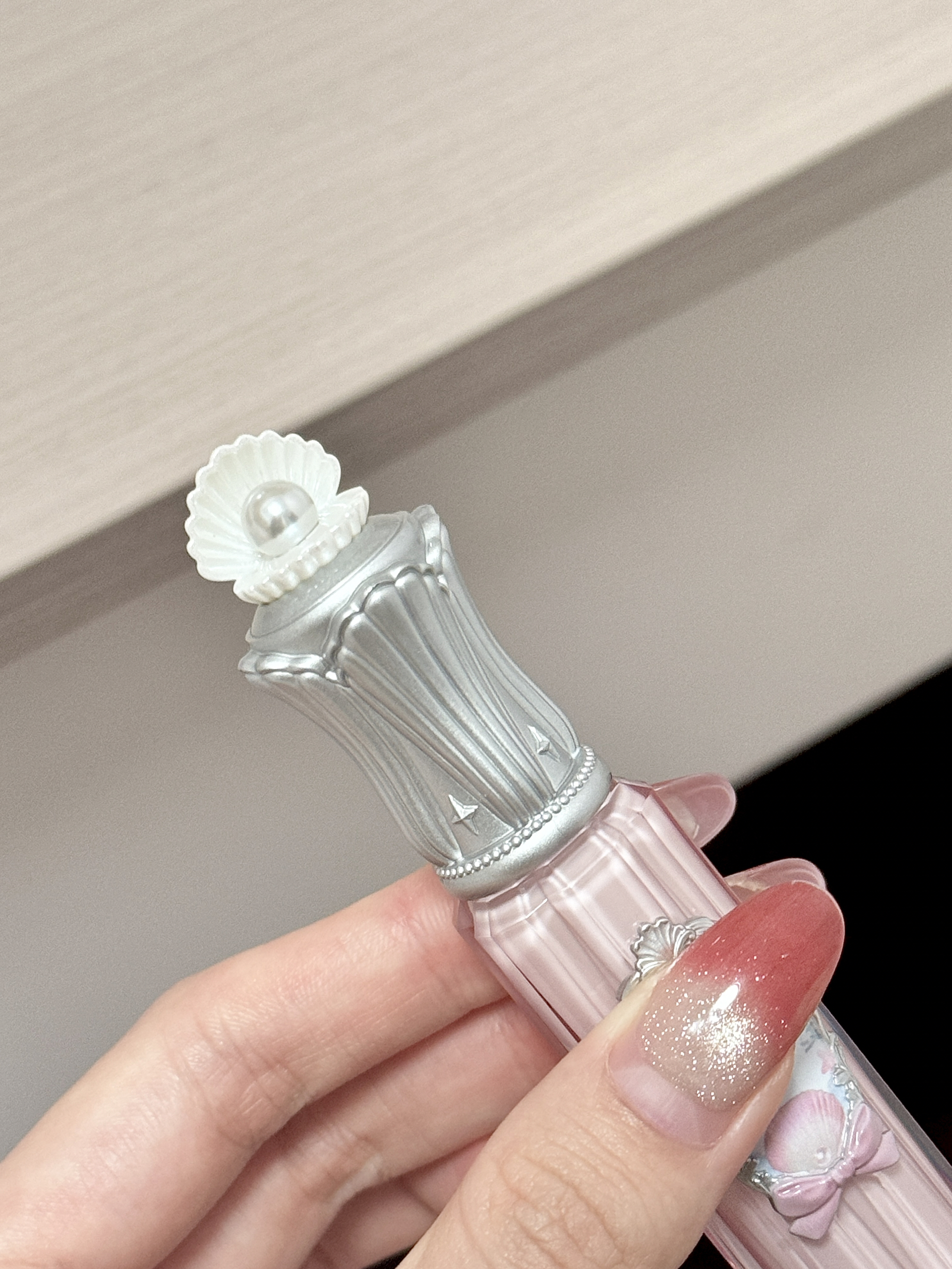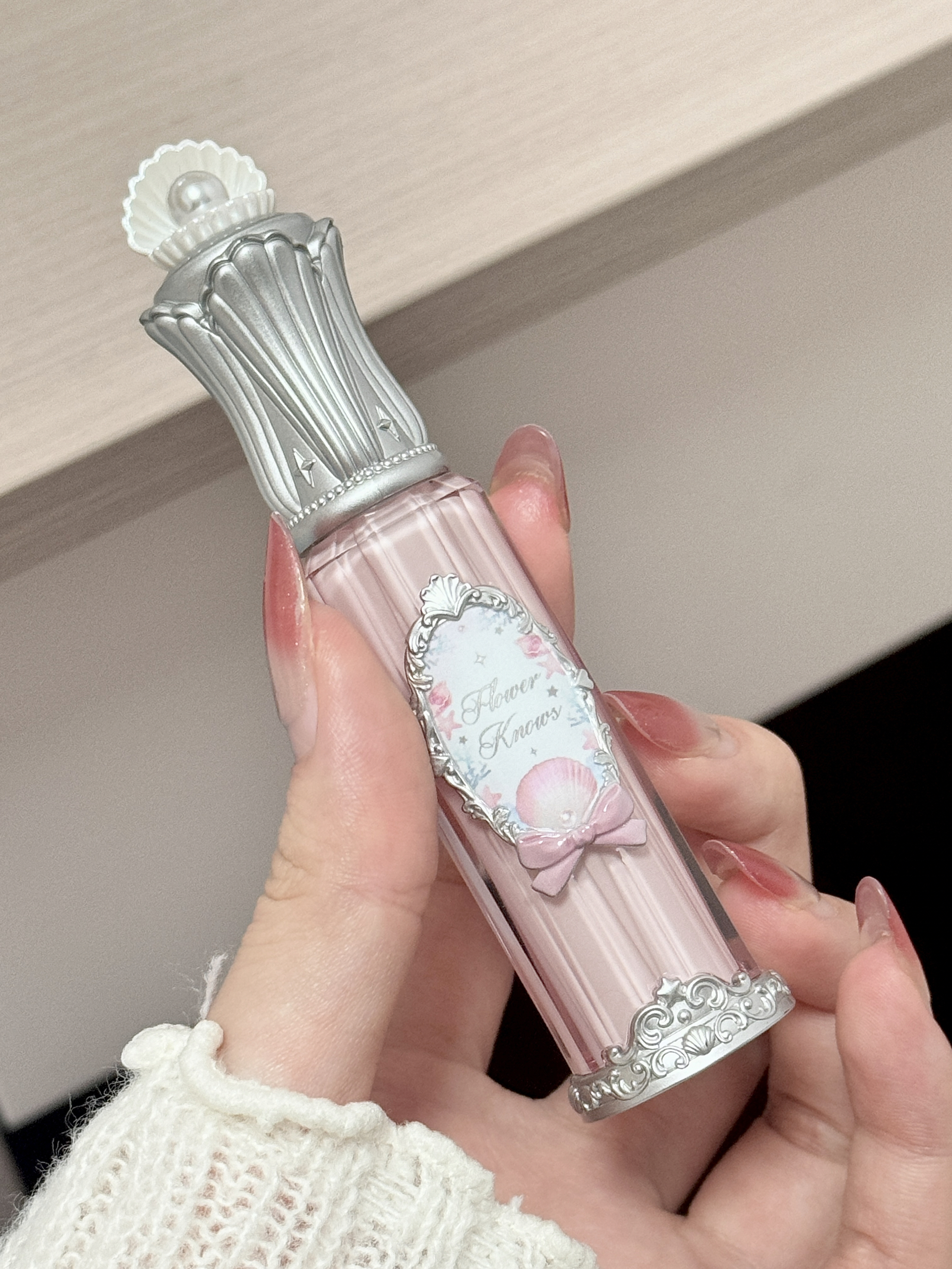 这只花知晓唇釉,我真的是揣在包里随时补涂 粉粉的瓶身配上银色雕花,还有那个小贝壳顶珠 拿在手里就像个精致的小魔法棒 每次补妆掏出来,都忍不住多拍两张 感觉没有女孩可以拒绝花知晓