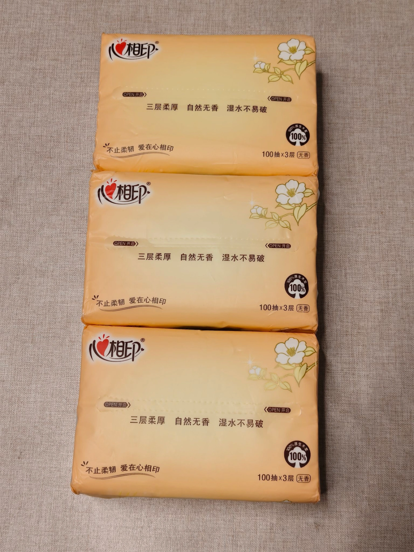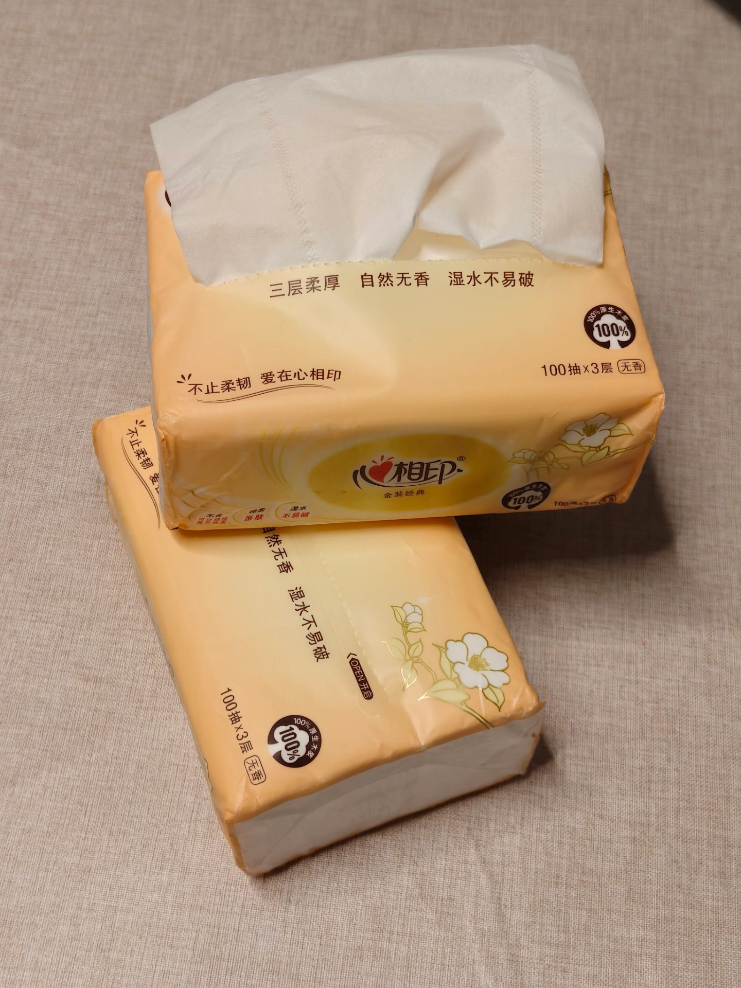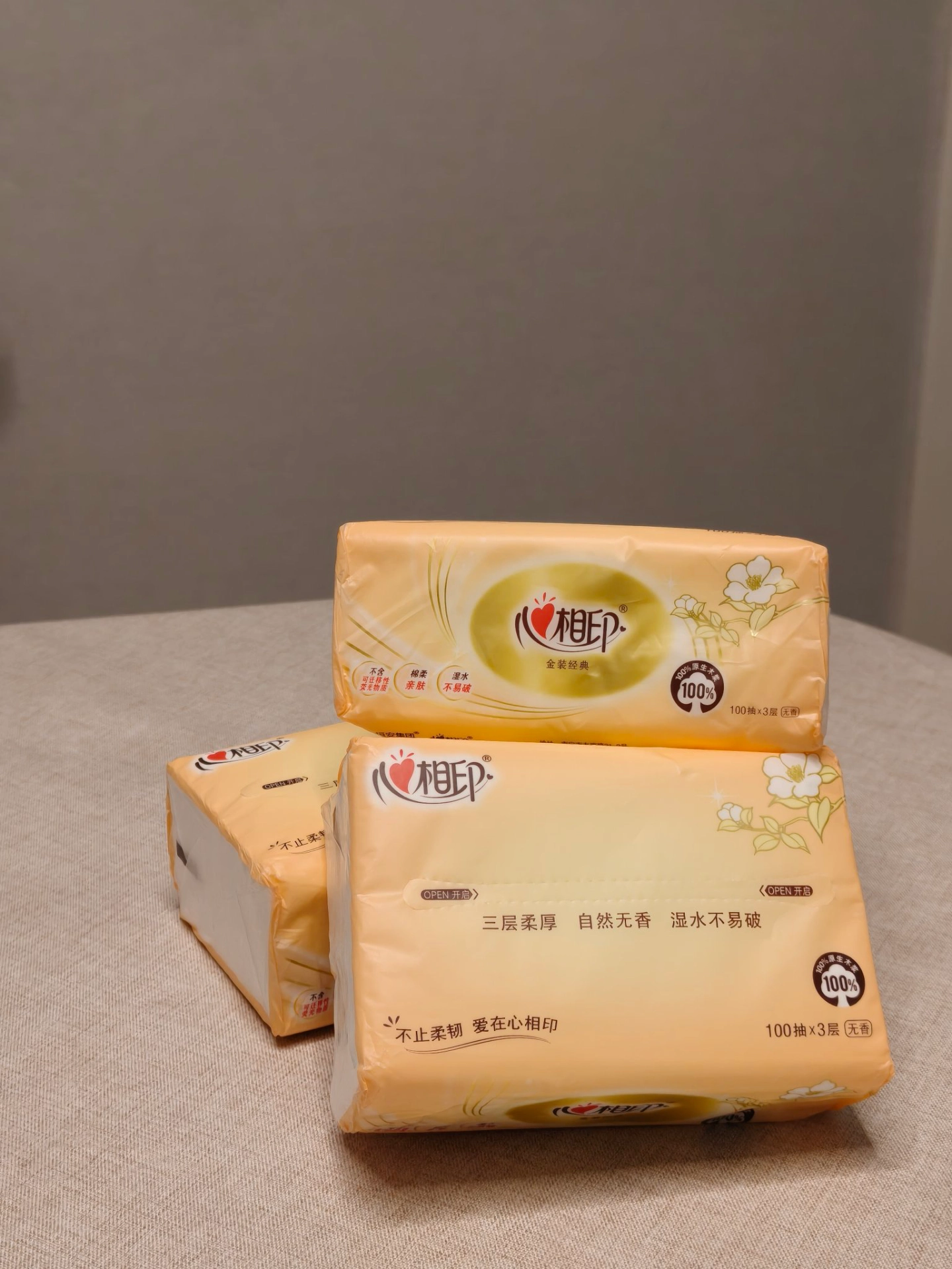 家里基本都是心相印的纸巾!一直都值得信赖💪 小小一包当哪里都很方便!出门游玩带一包刚刚好~ 三层纸巾 柔软也不会有粉屑! 如果一定要说不那么好的地方,那就是现在的抽纸真的越来越小了哈哈哈 不过不是这一品牌啦😁 好想大家都是!